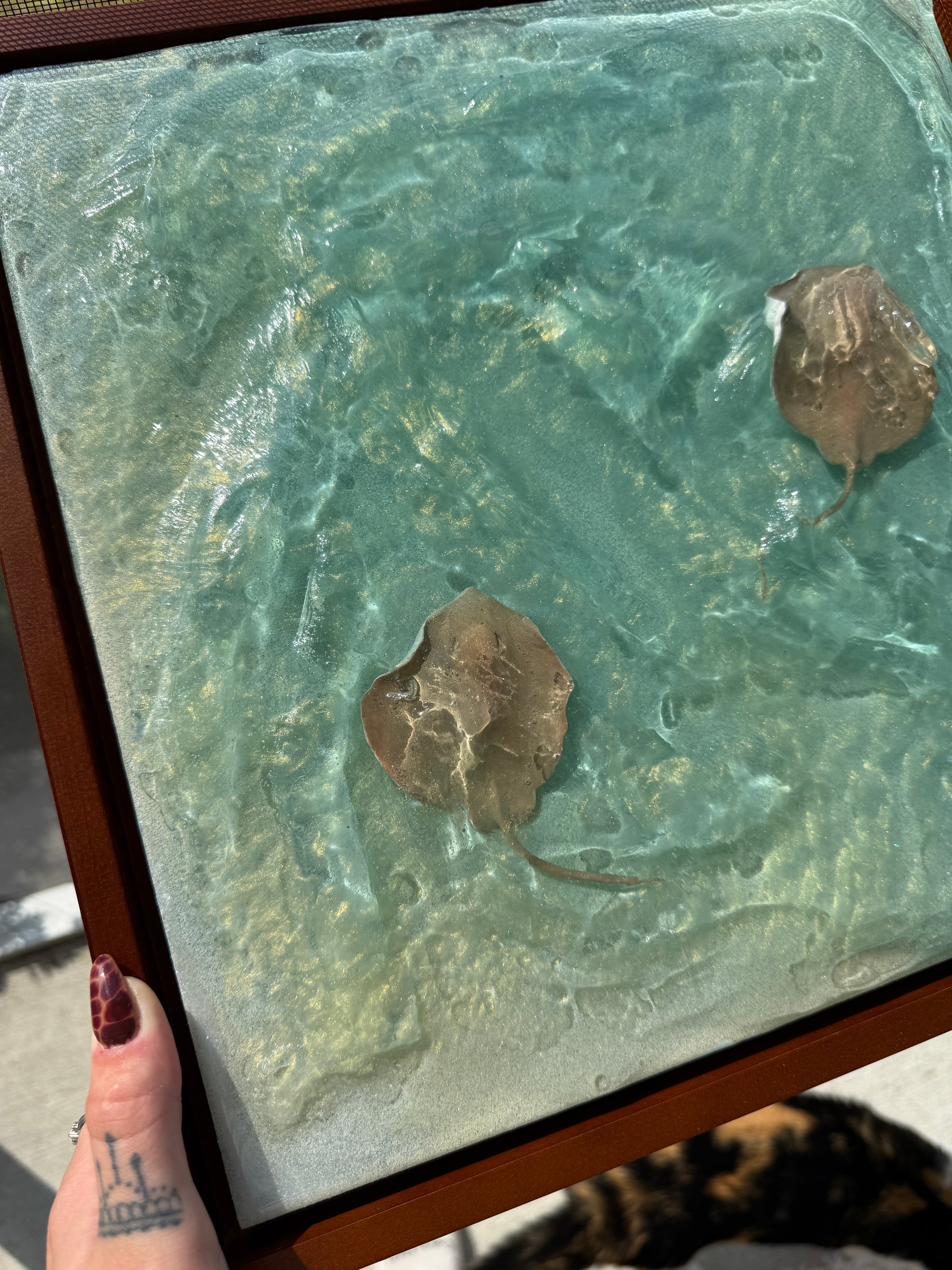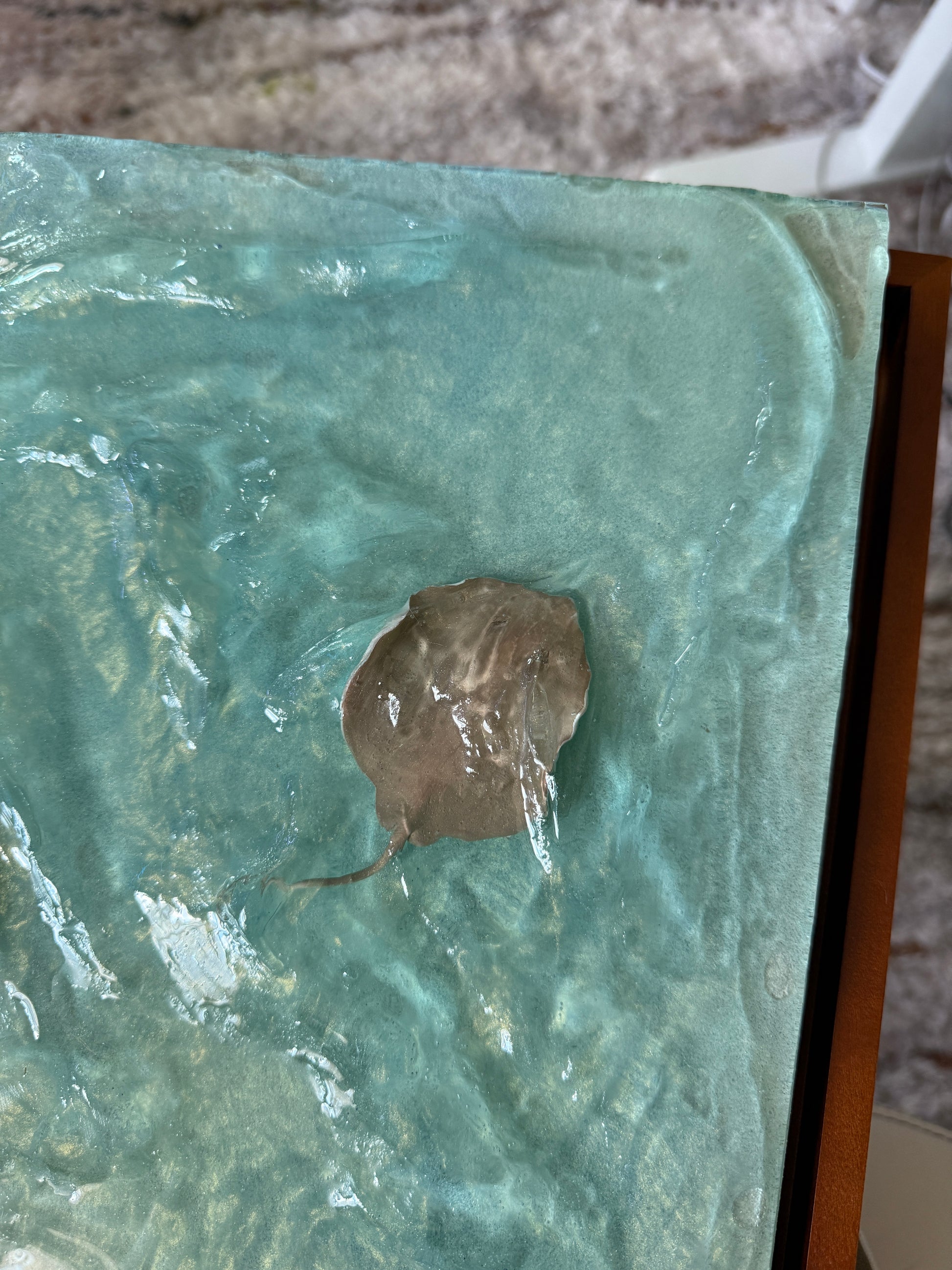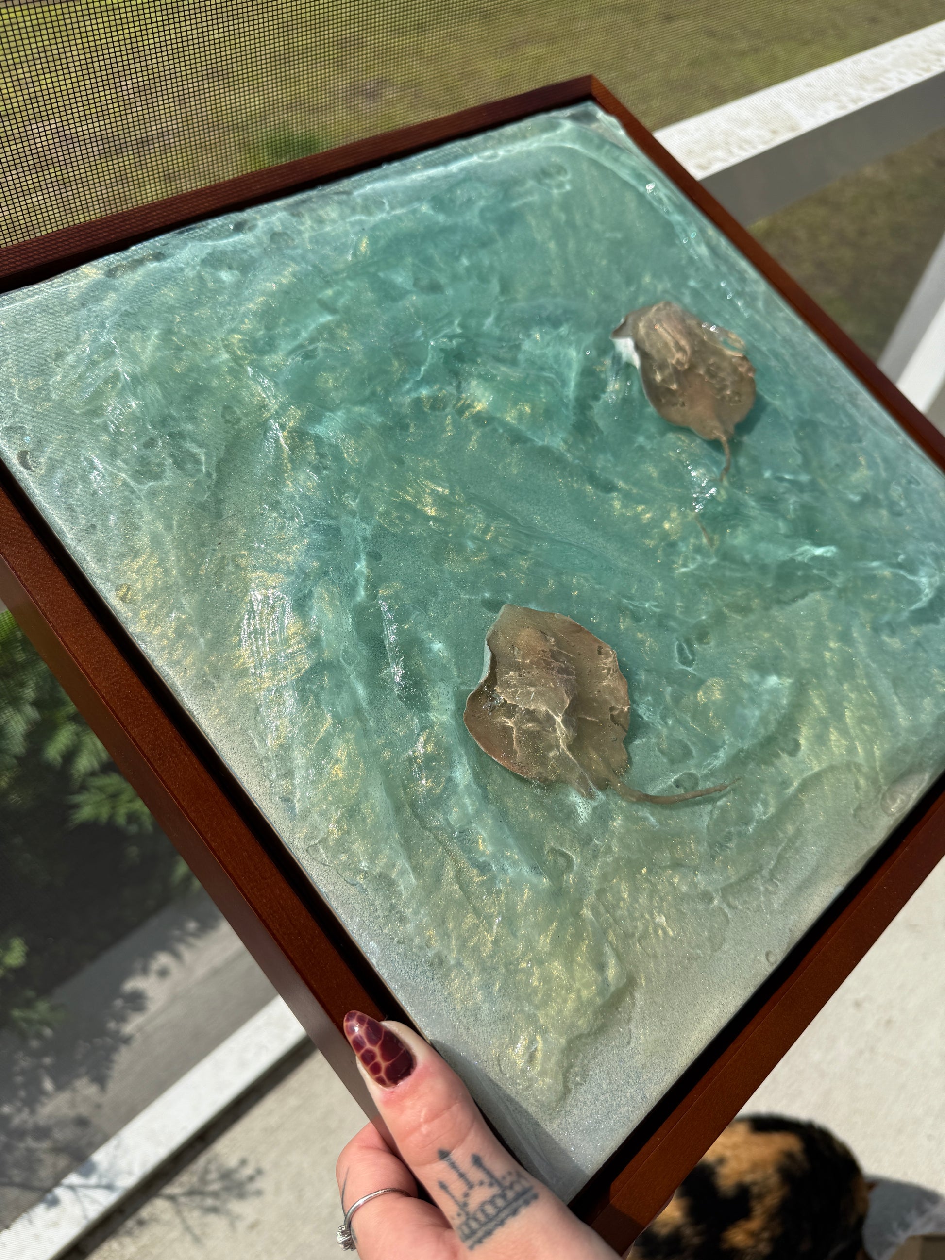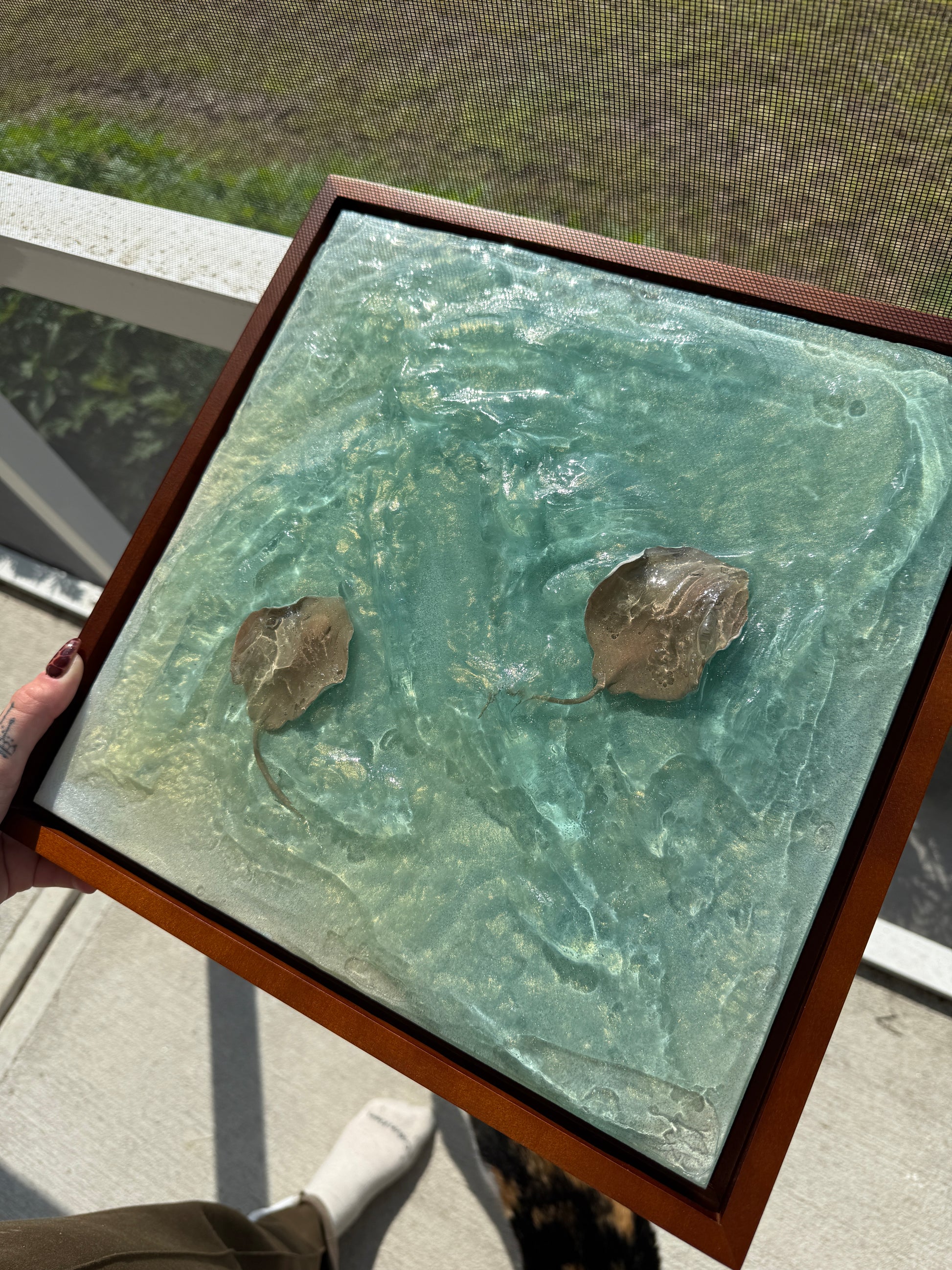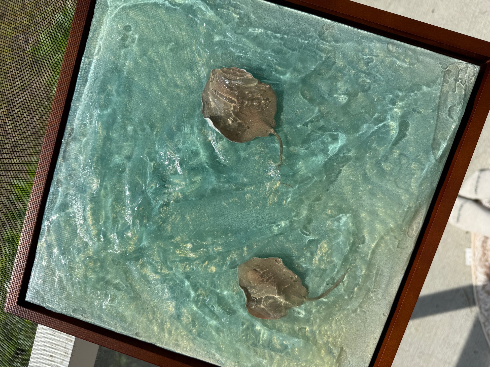 This piece features two stingrays gliding along the shallows of the warm crystal blue Caribbean waters!! The water and stingrays are completely sculpted by hand and finished with an epoxy cast to bring out the transparent water textures!