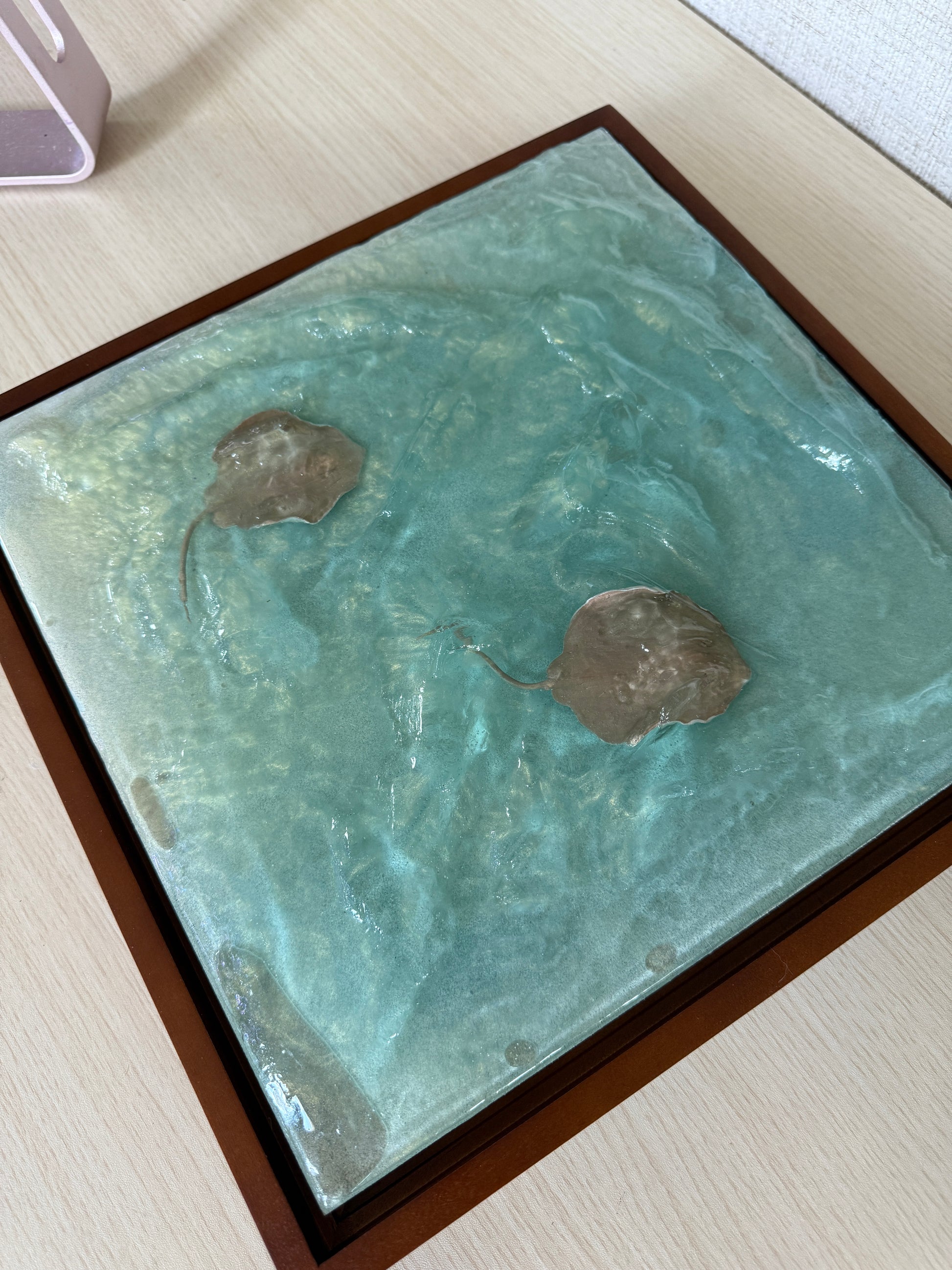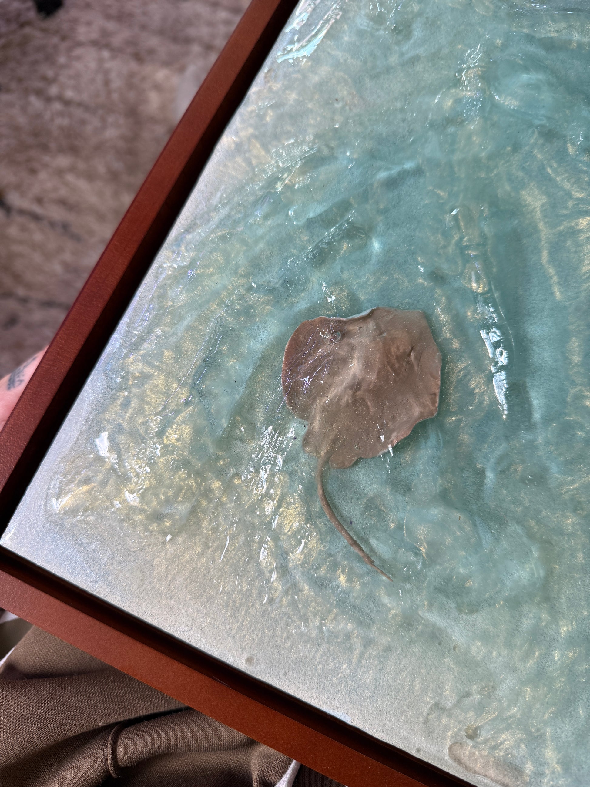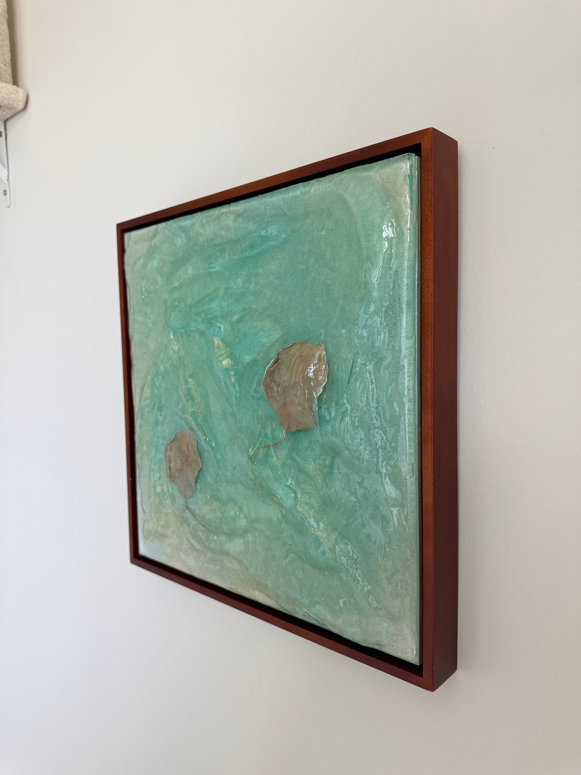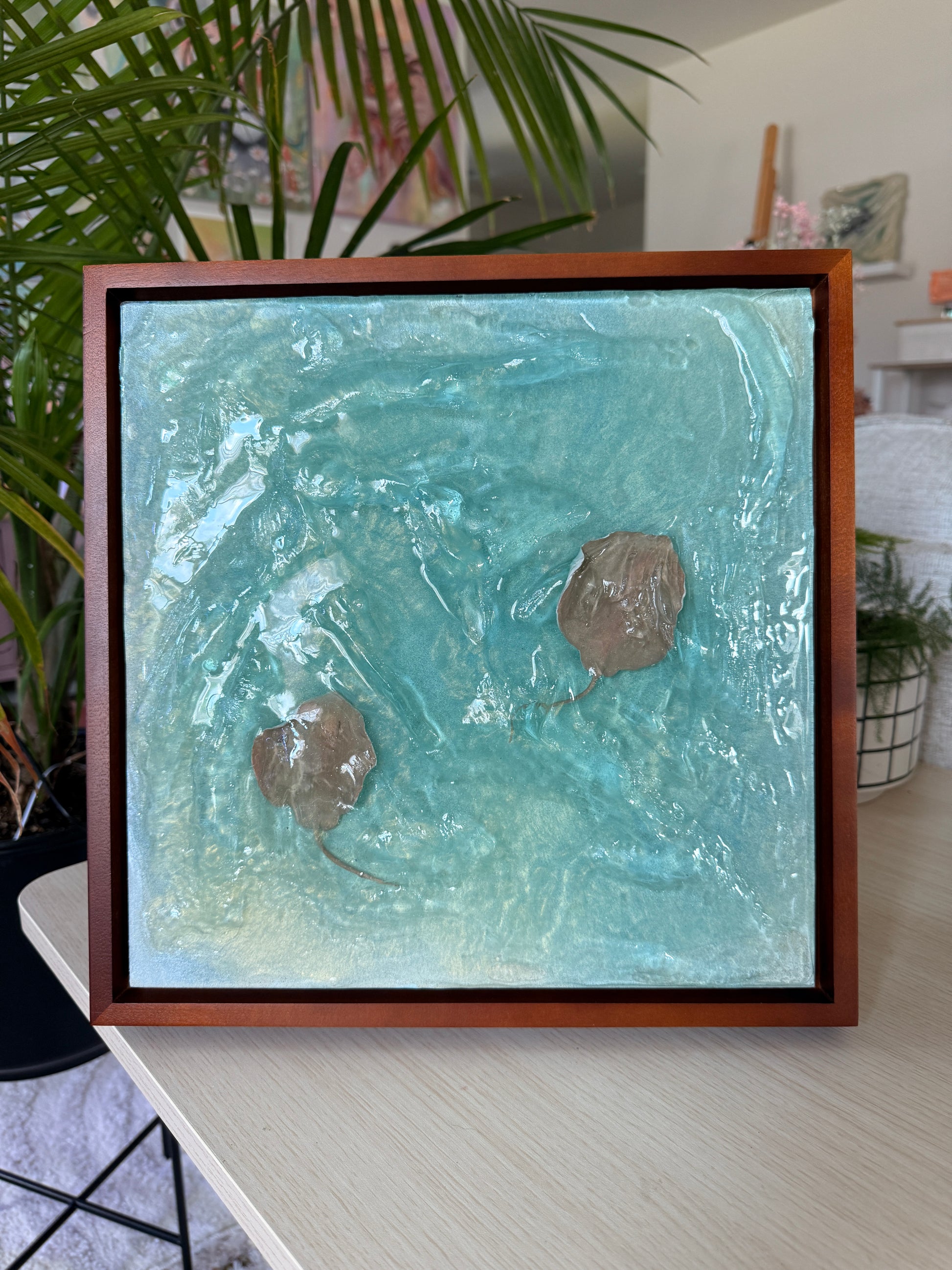 This piece features two stingrays gliding along the shallows of the warm crystal blue Caribbean waters!! The water and stingrays are completely sculpted by hand and finished with an epoxy cast to bring out the transparent water textures!