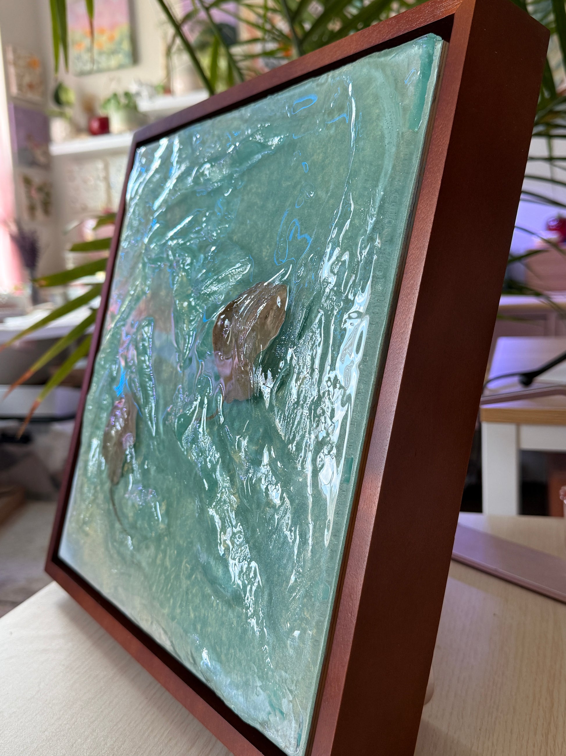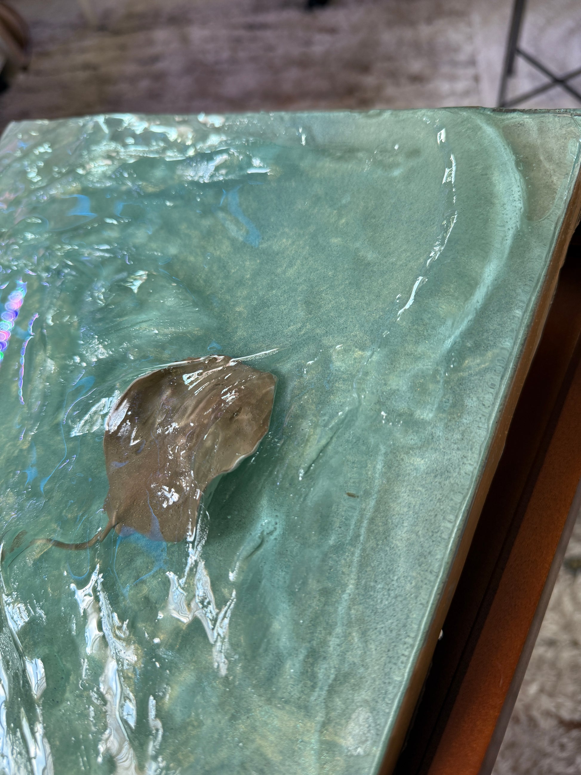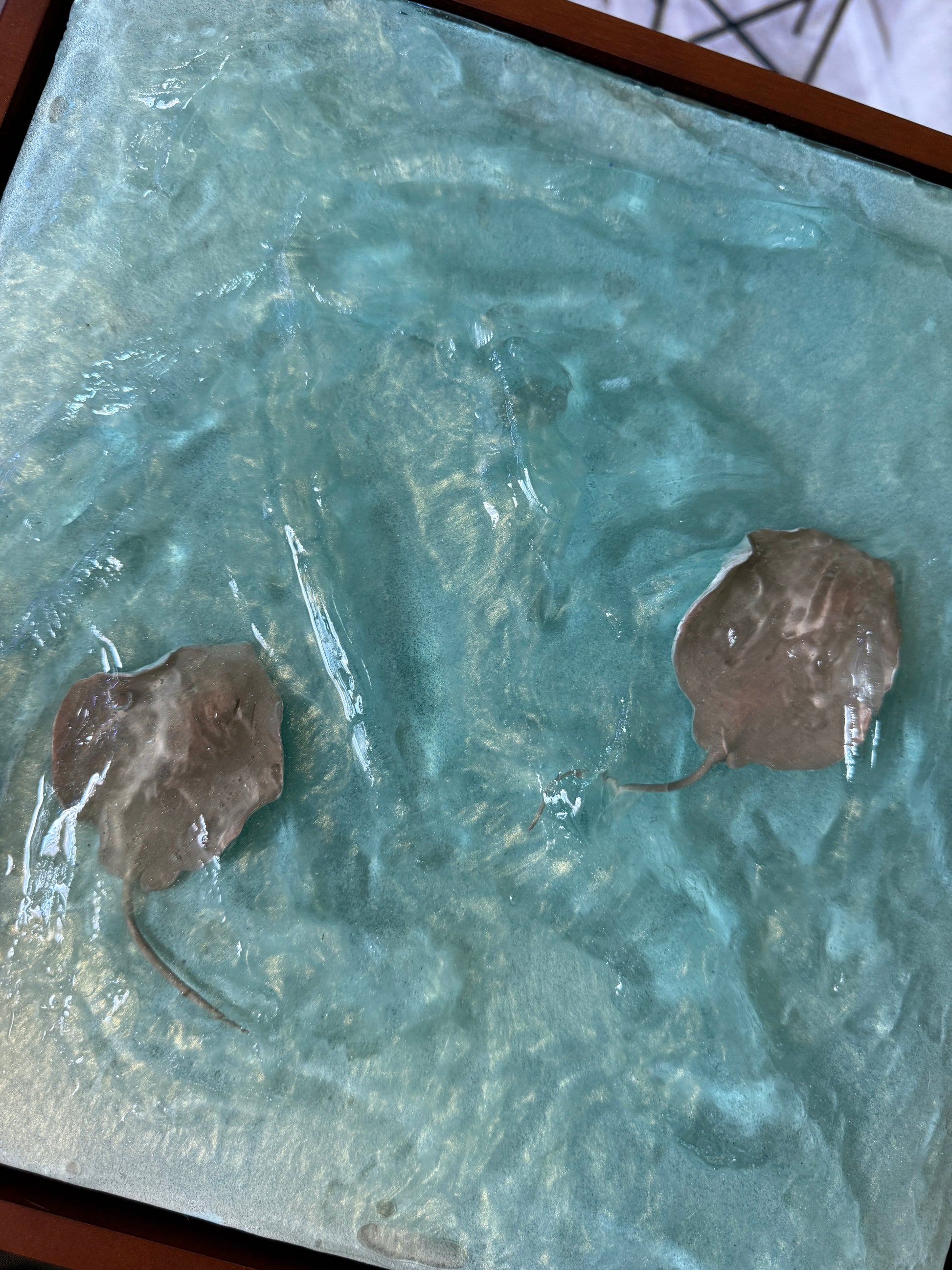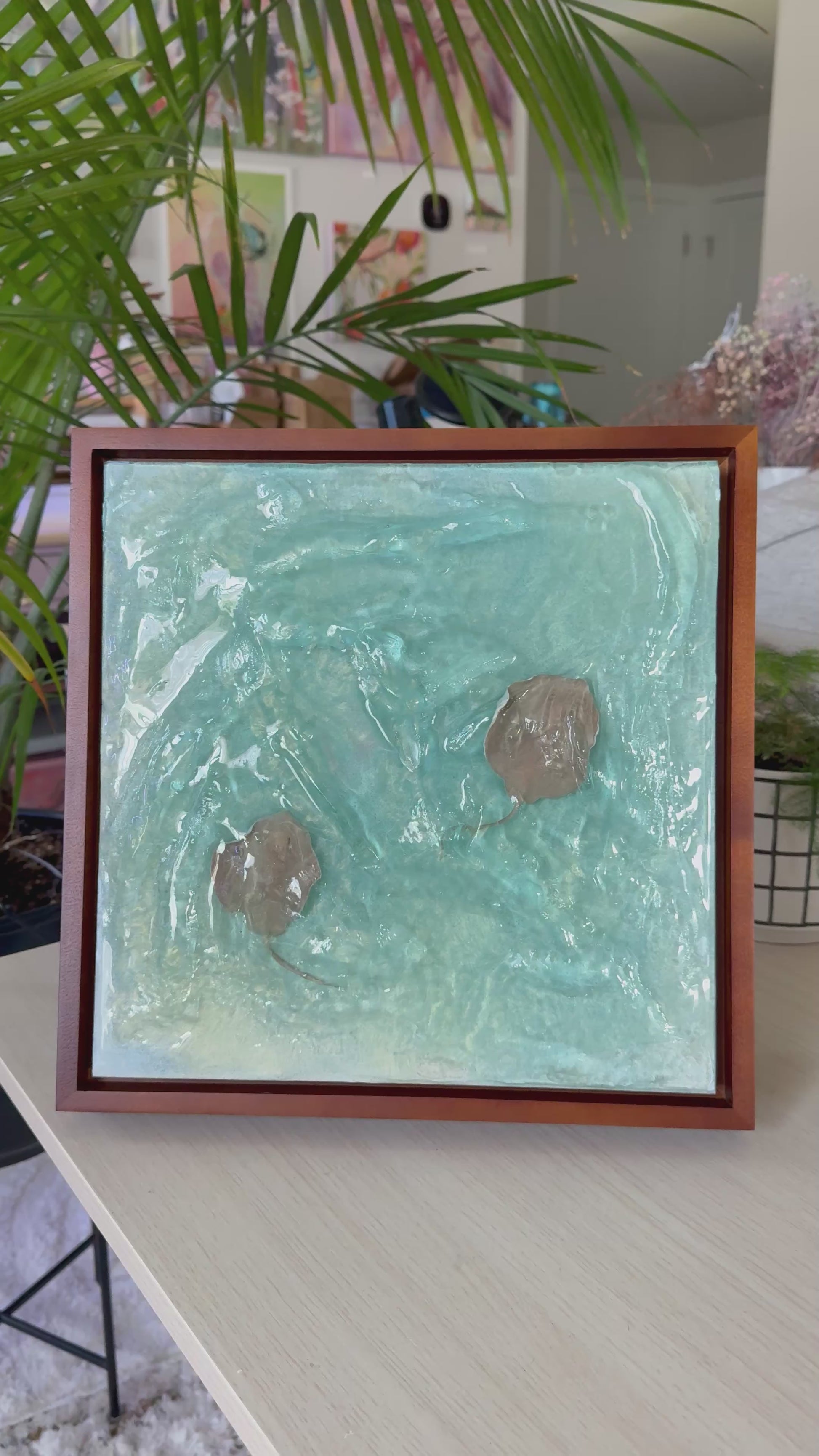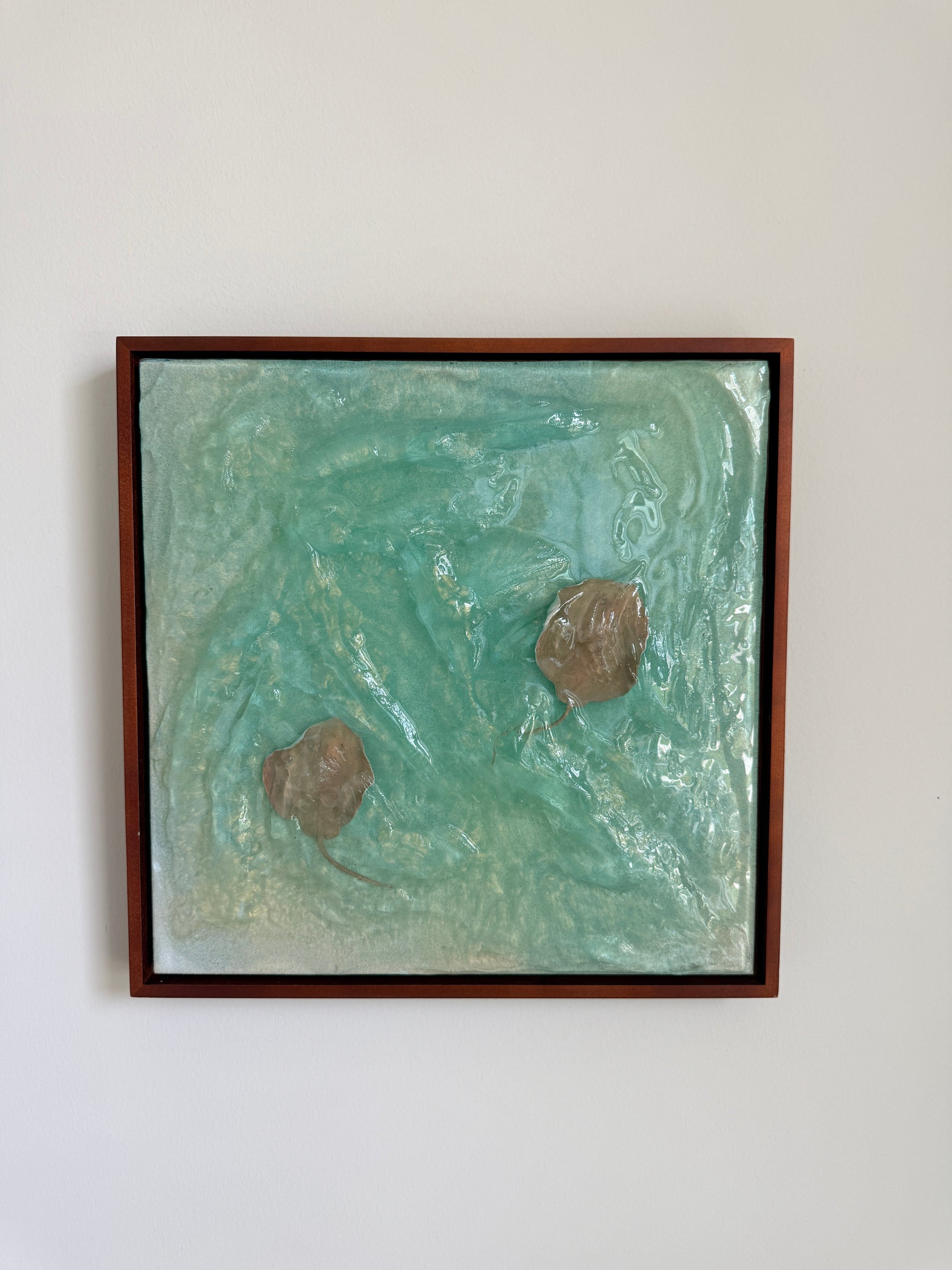 This piece features two stingrays gliding along the shallows of the warm crystal blue Caribbean waters!! The water and stingrays are completely sculpted by hand and finished with an epoxy cast to bring out the transparent water textures!
