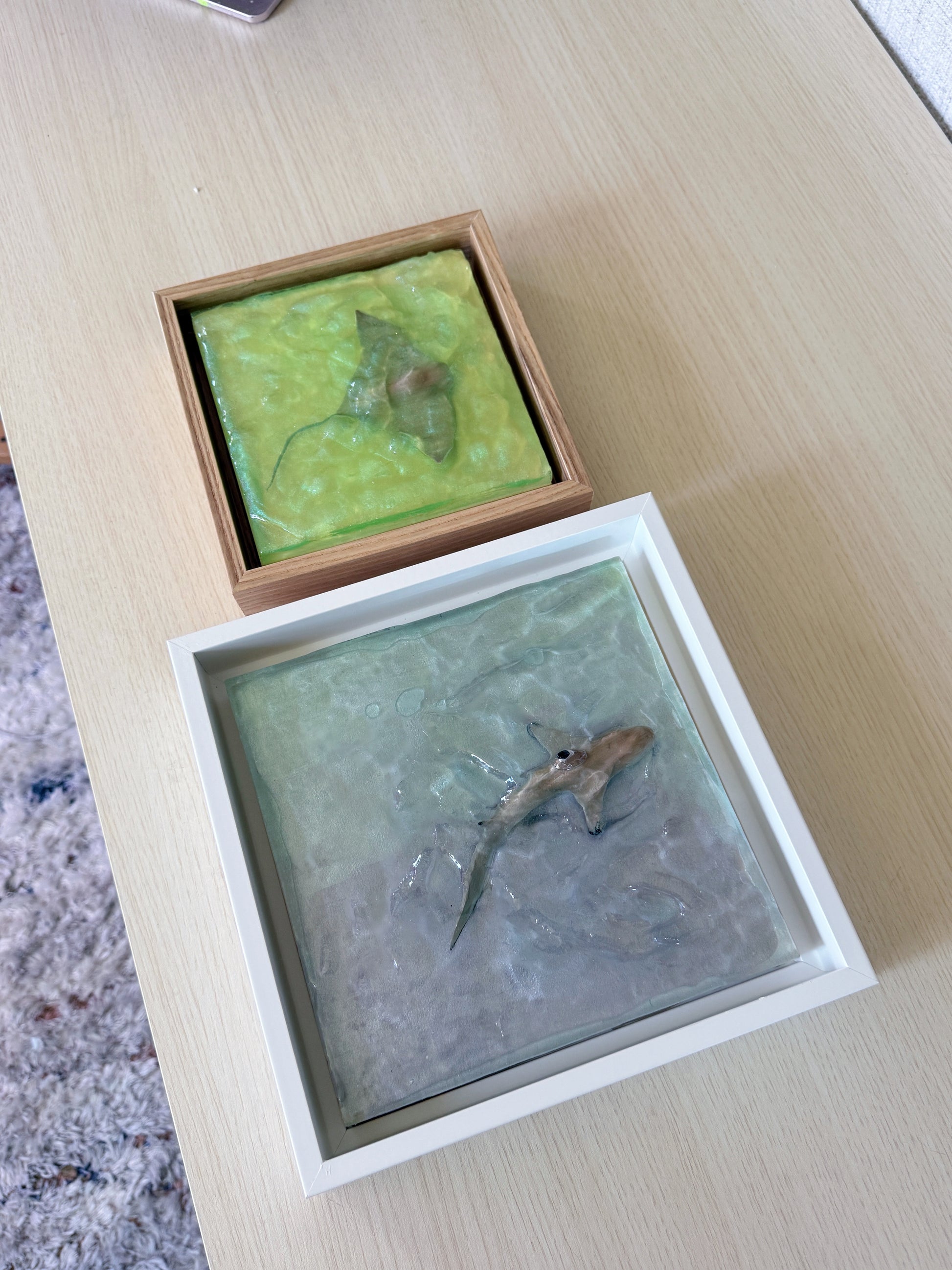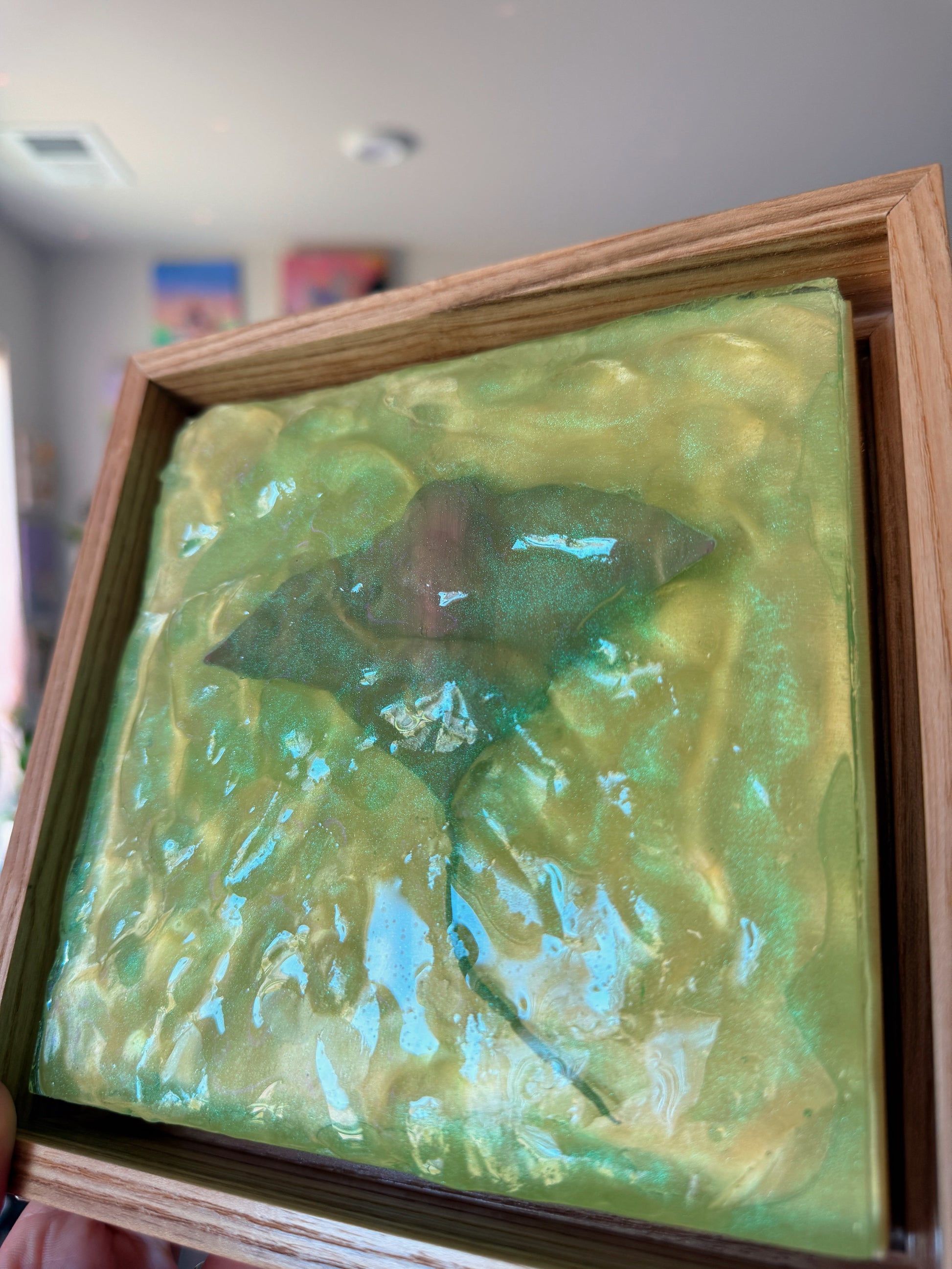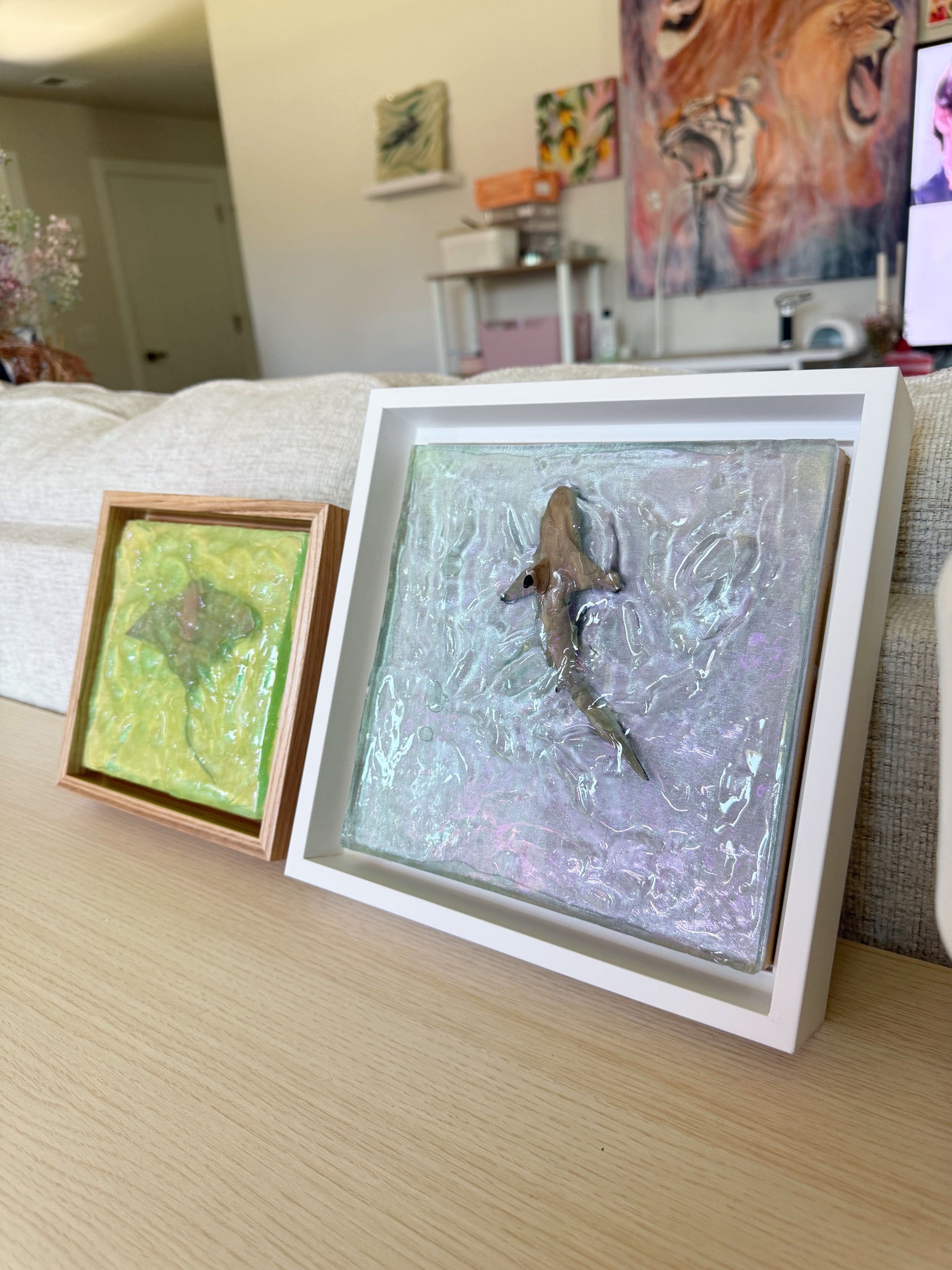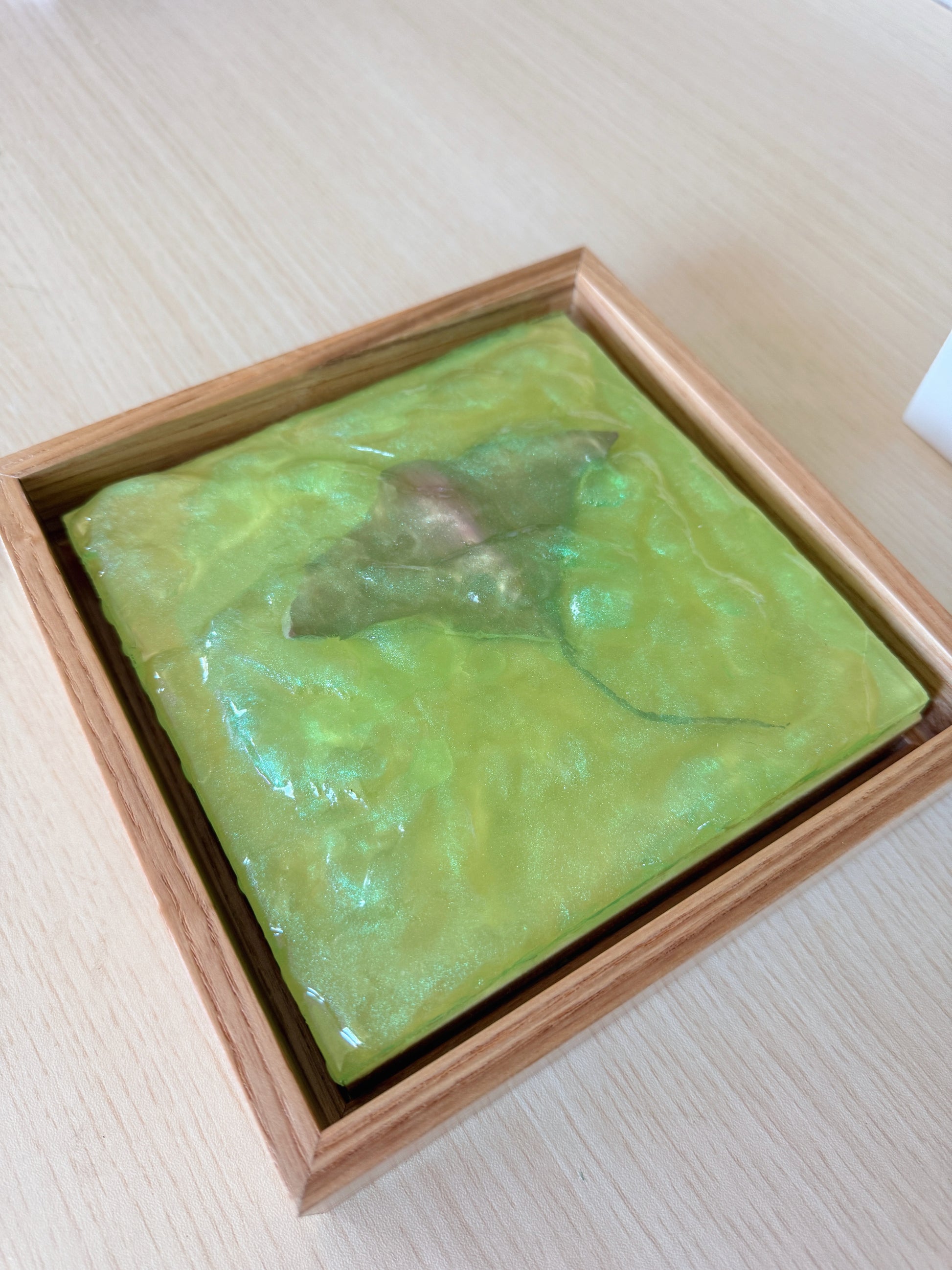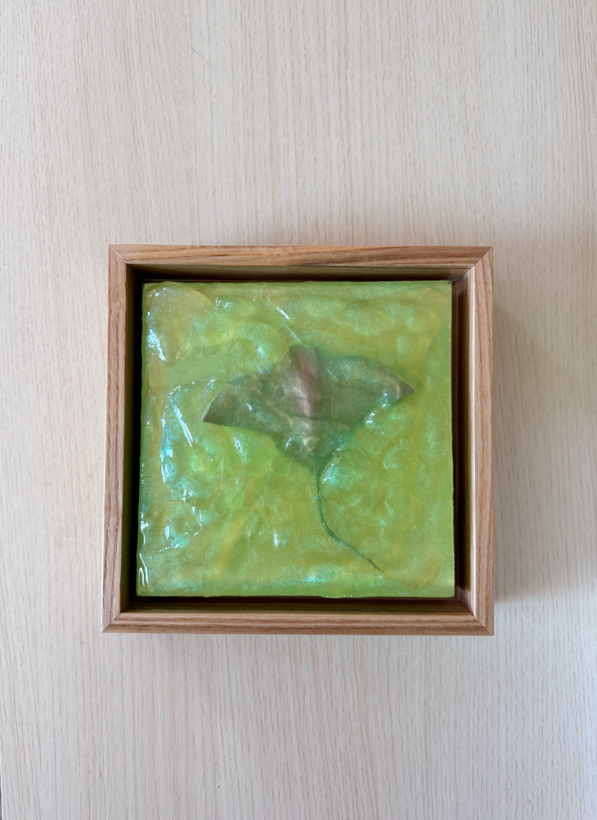 "Emerald Isle" 2025 brings the ocean's beauty right into your home! This artwork features a stingray swimming through sea-green waters, which is hand sculpted from plaster and cast in sparkling epoxy resin.