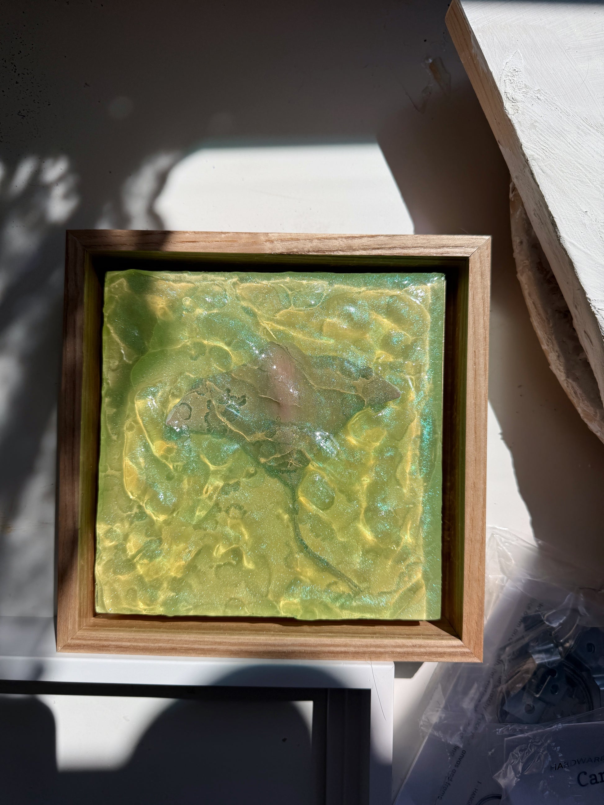 Mounted on an 6 x 6 in. birch wood canvas with a maple floater frame included