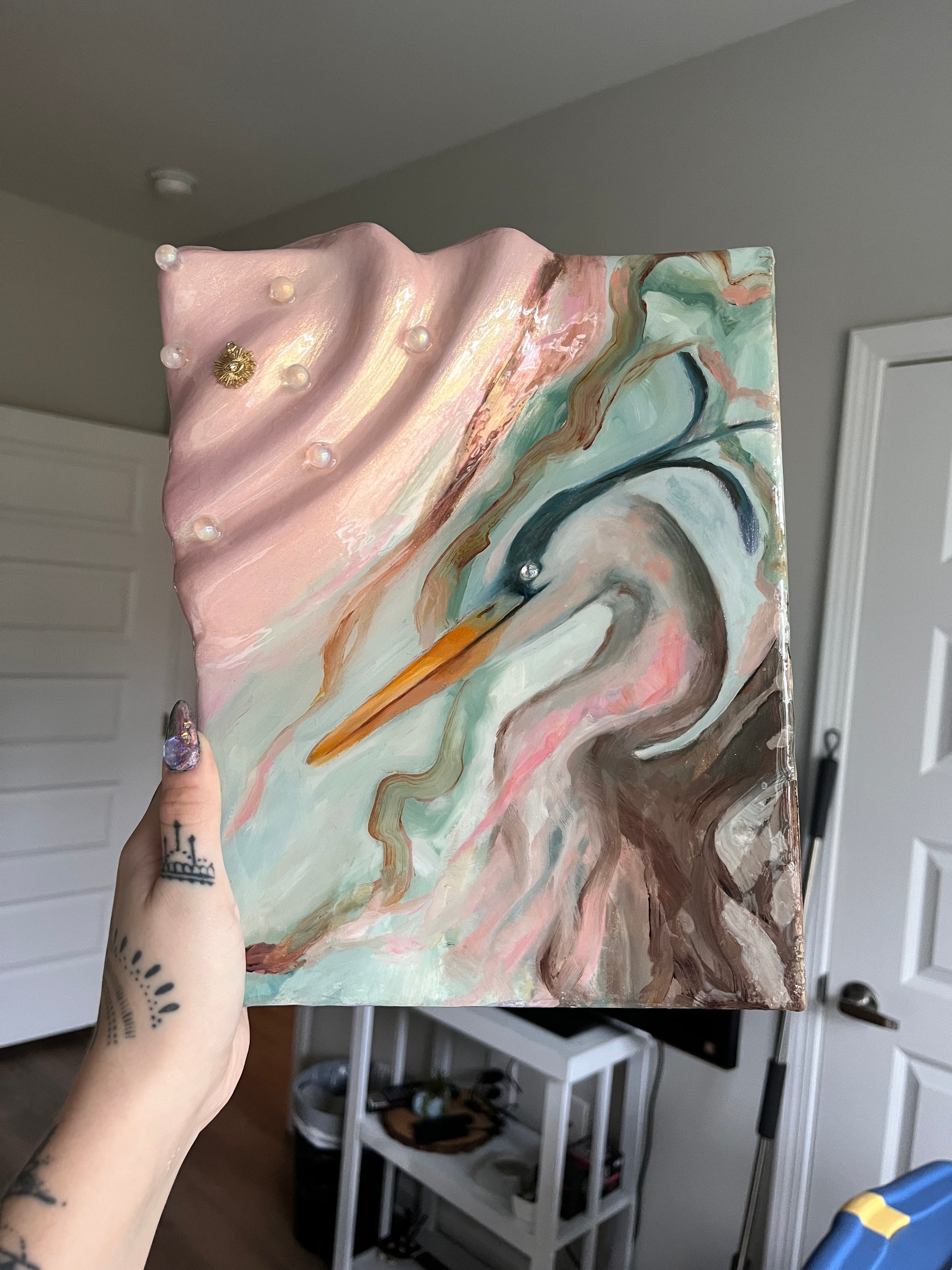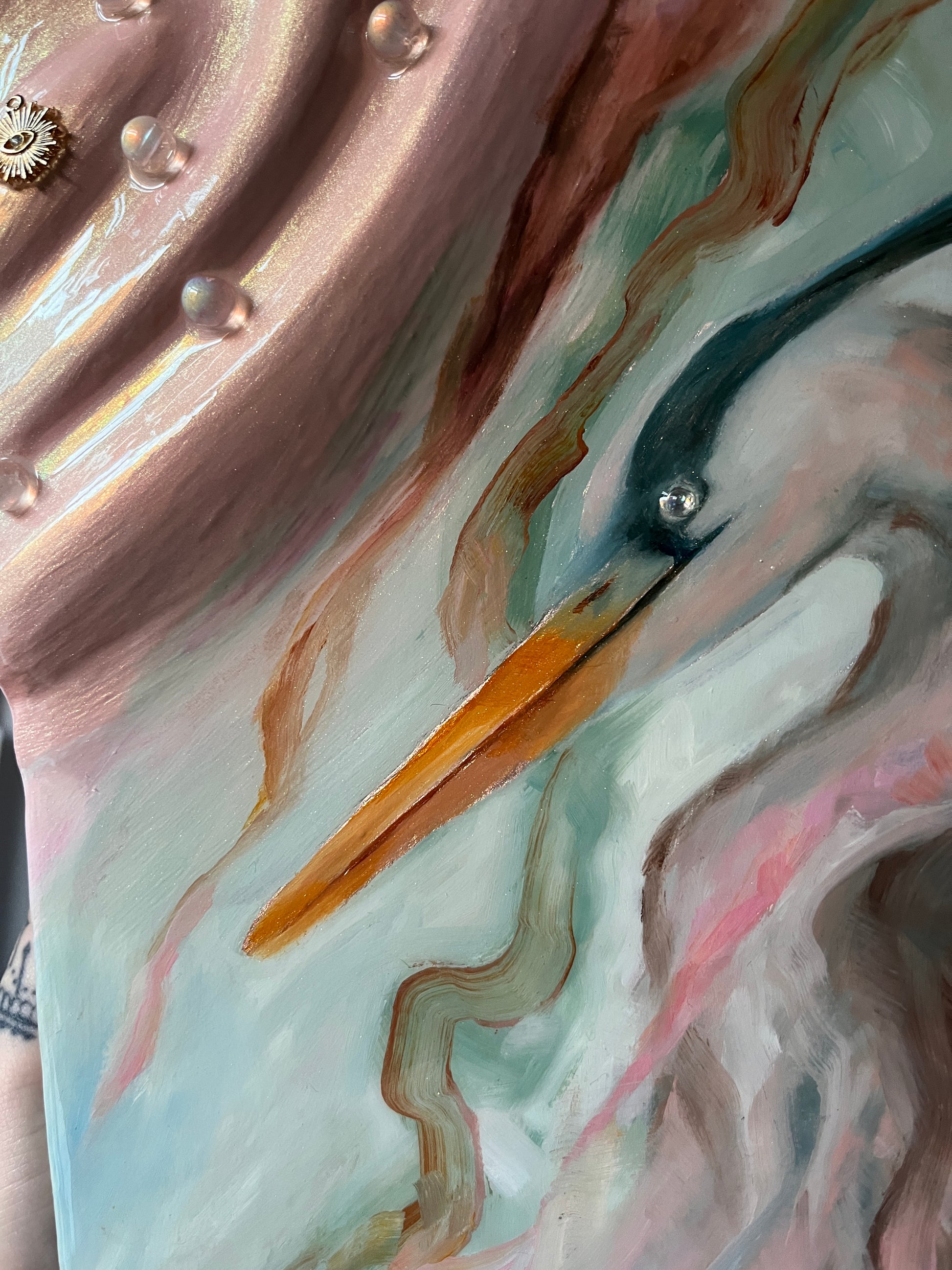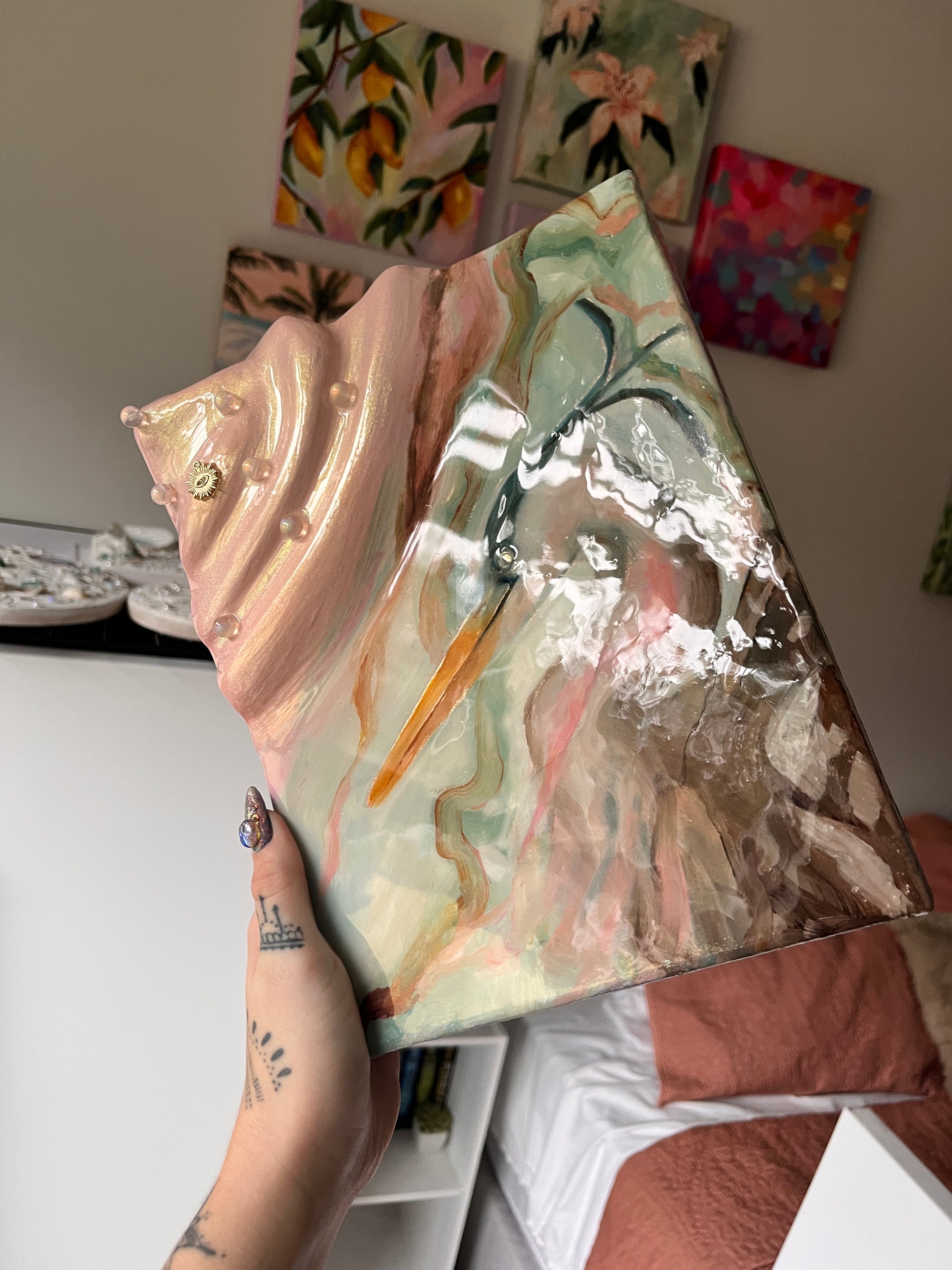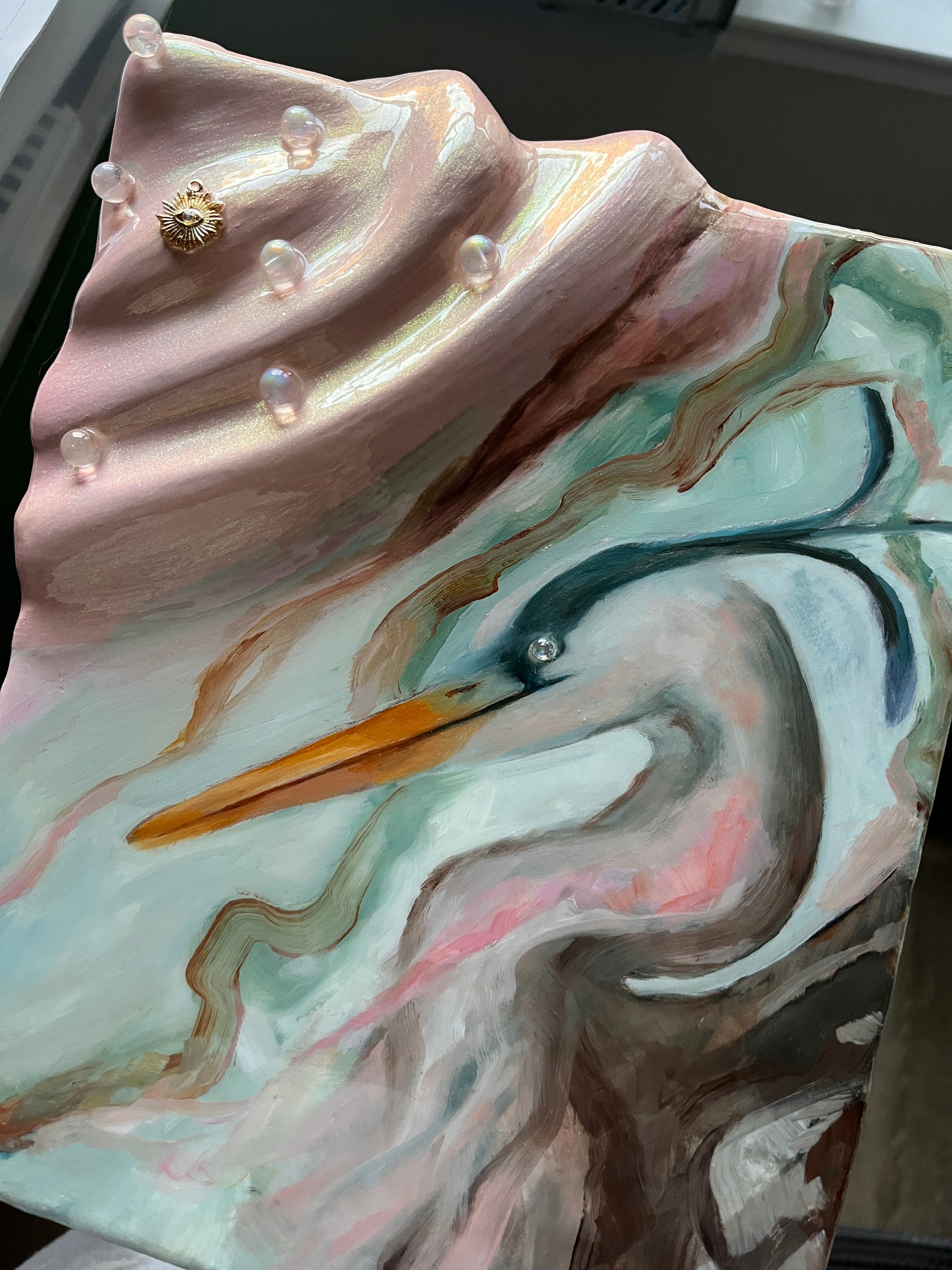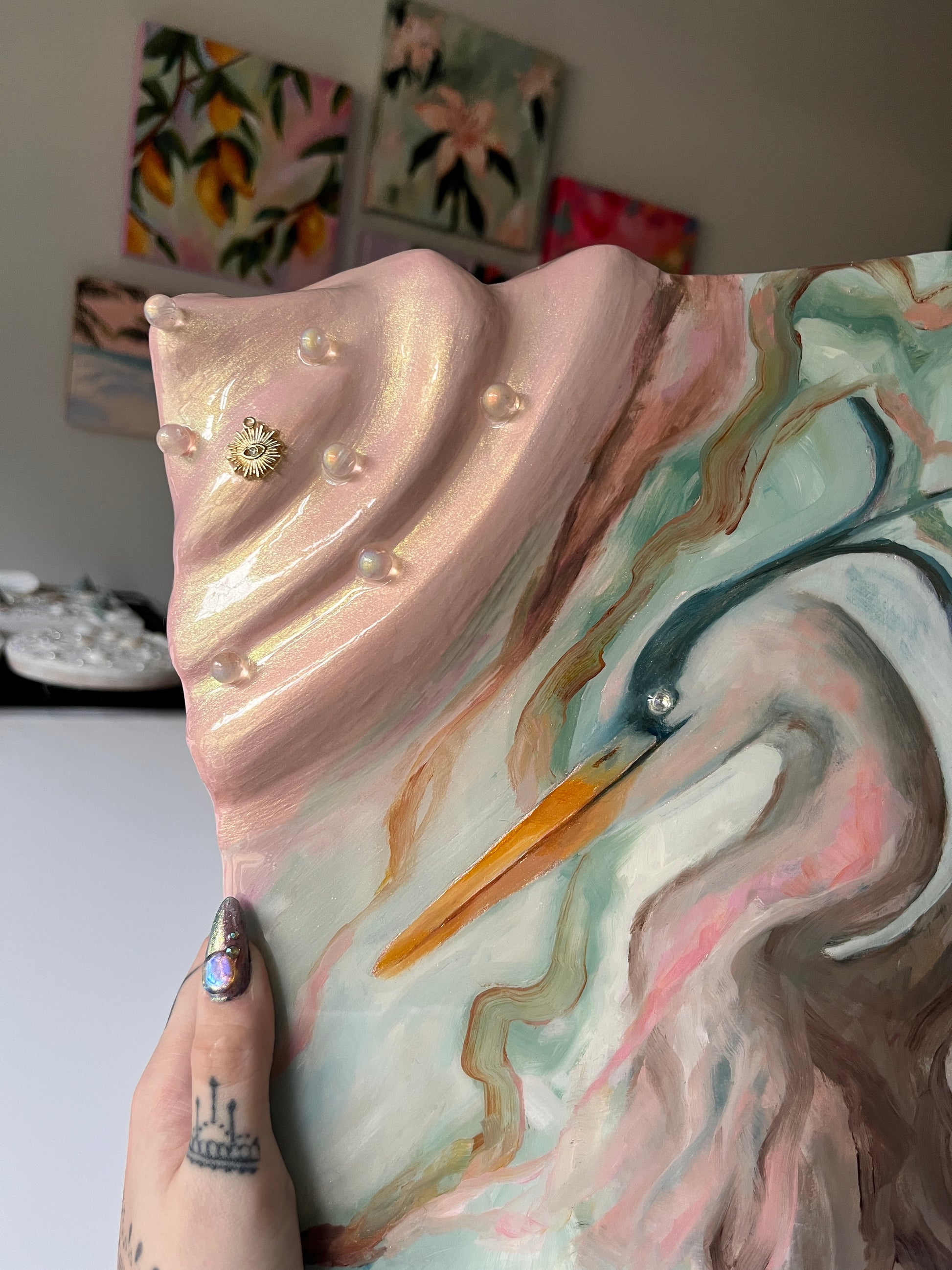 The process begins with sculpting plaster directly onto canvas, a time-intensive step that can take weeks to complete. Once the desired form is achieved, the sculpture is carefully sanded layer after layer. Then each pieces is painted with oil paints and mixed media, incorporating bright colors and iridescent elements to bring the piece to life. To protect the artwork and enhance its longevity, a final coat of UV-resistant resin is applied. This not only preserves the vibrant colors and iridescent qualities but also adds a glossy finish that further accentuates the artwork's dimensional aspects and adds an extra layer of protection