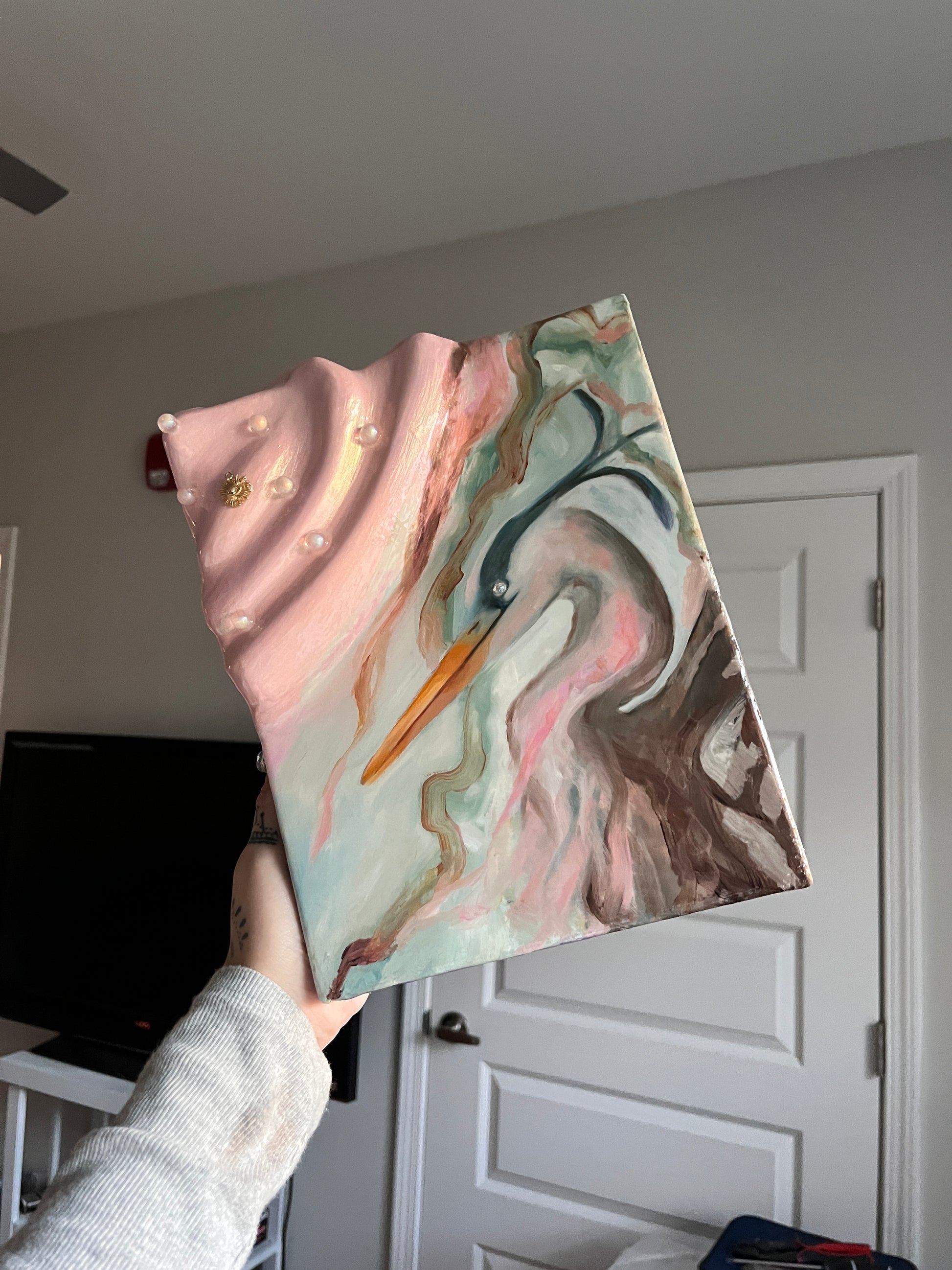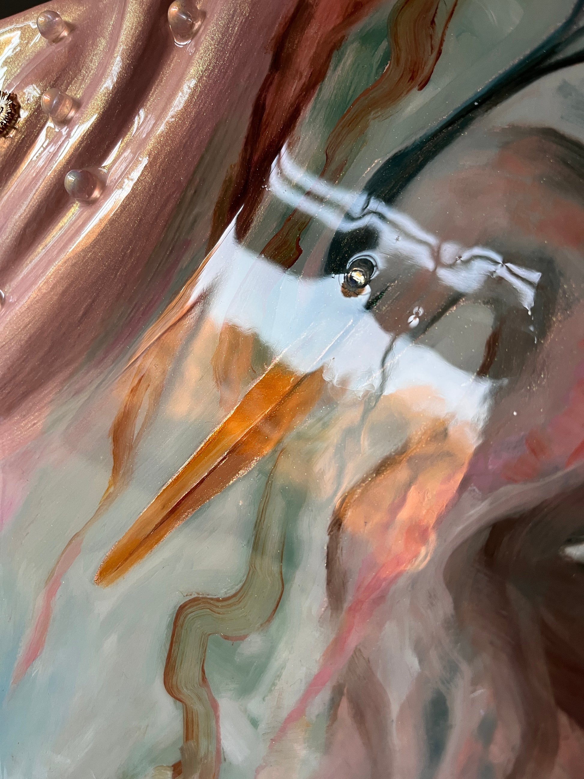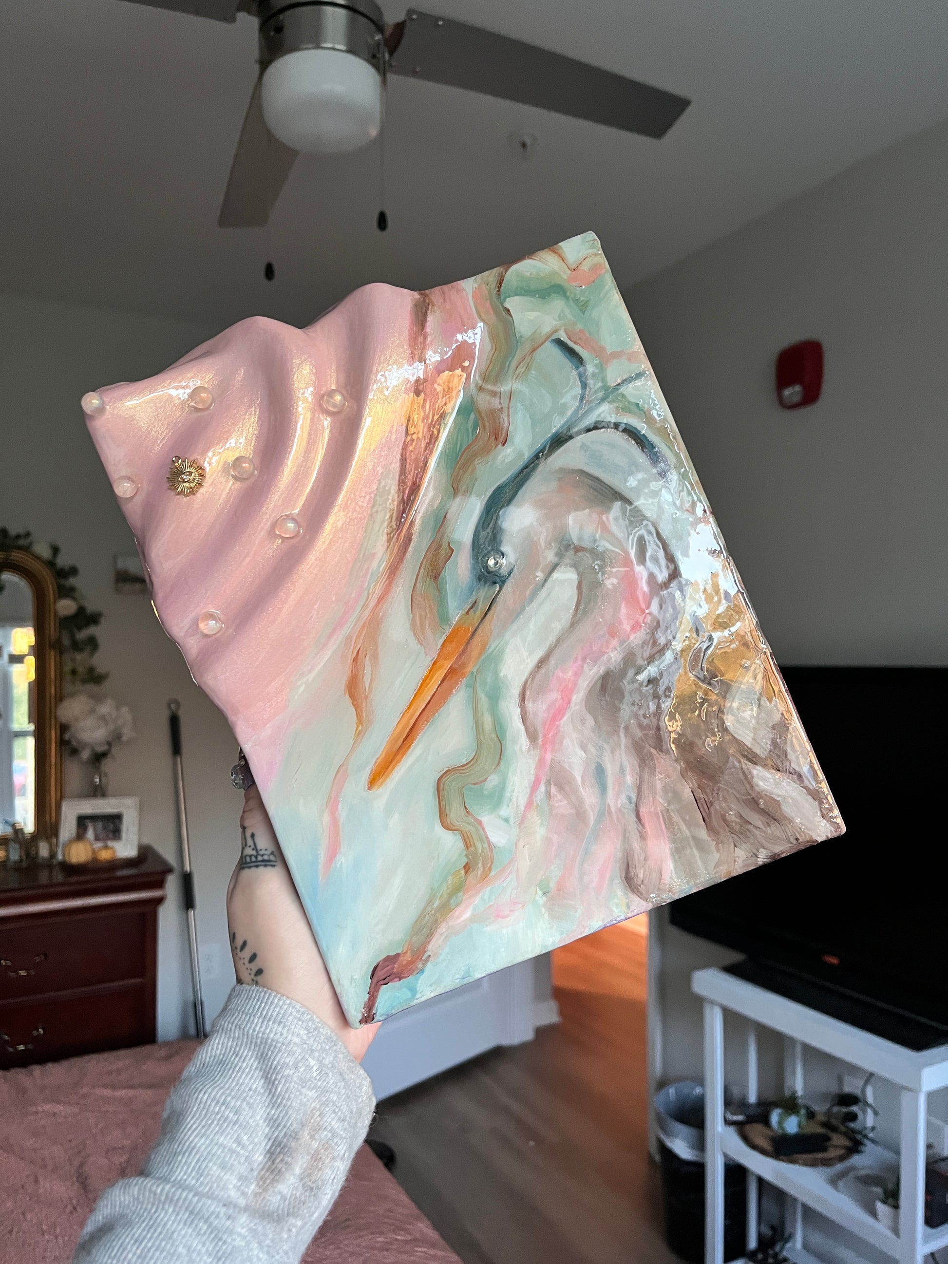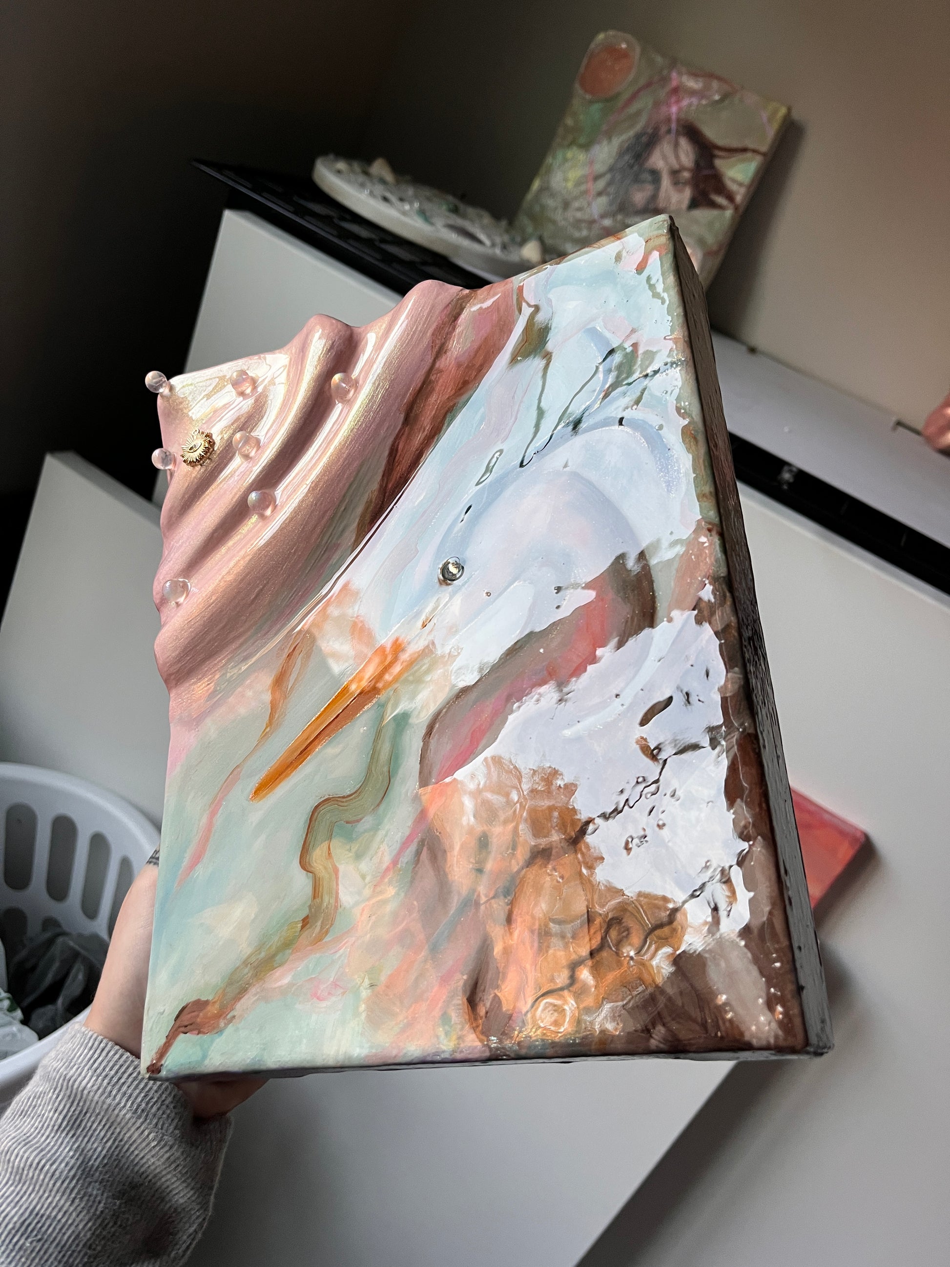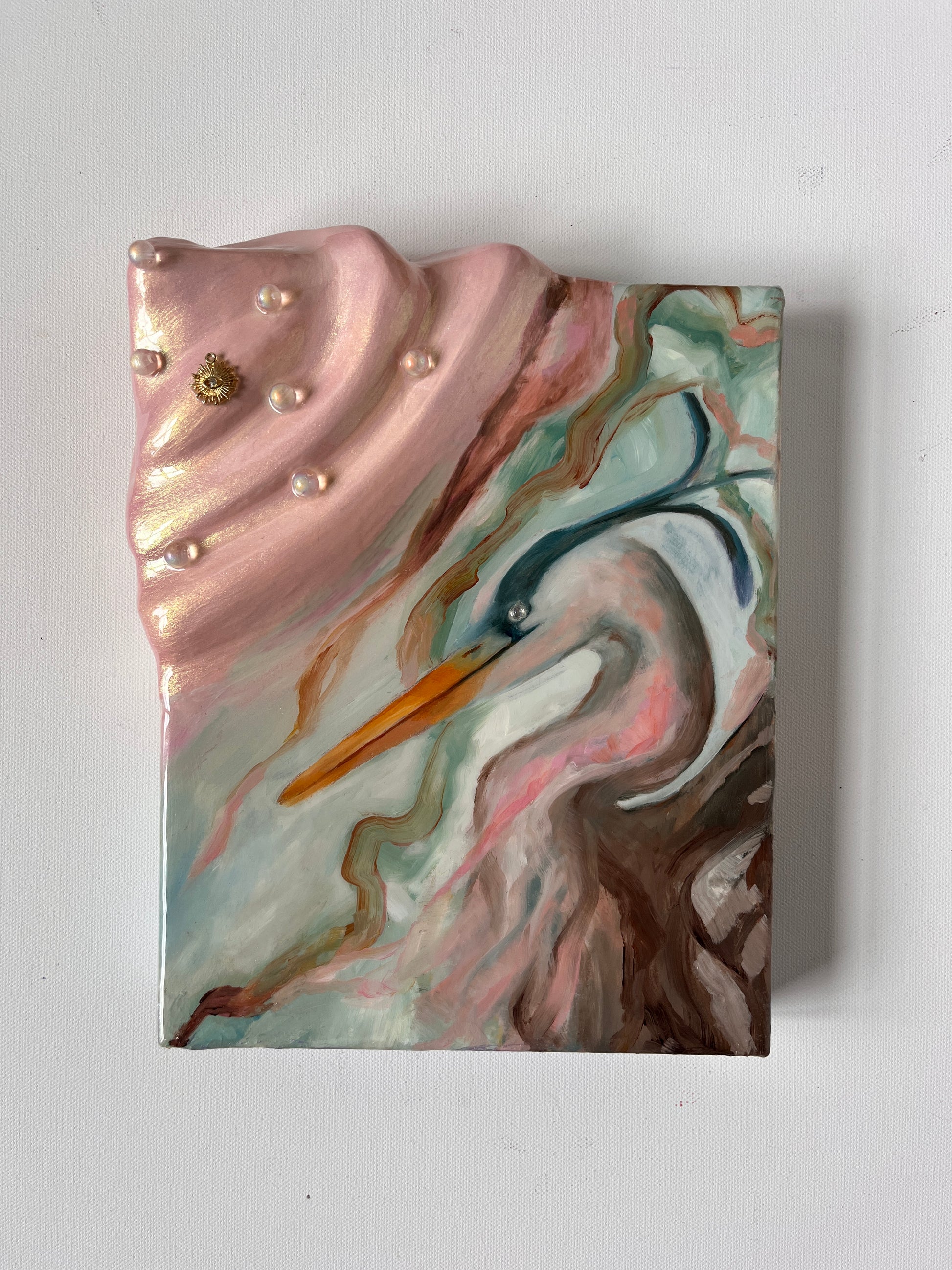 The process begins with sculpting plaster directly onto canvas, a time-intensive step that can take weeks to complete. Once the desired form is achieved, the sculpture is carefully sanded layer after layer. Then each pieces is painted with oil paints and mixed media, incorporating bright colors and iridescent elements to bring the piece to life. To protect the artwork and enhance its longevity, a final coat of UV-resistant resin is applied. This not only preserves the vibrant colors and iridescent qualities but also adds a glossy finish that further accentuates the artwork's dimensional aspects and adds an extra layer of protection