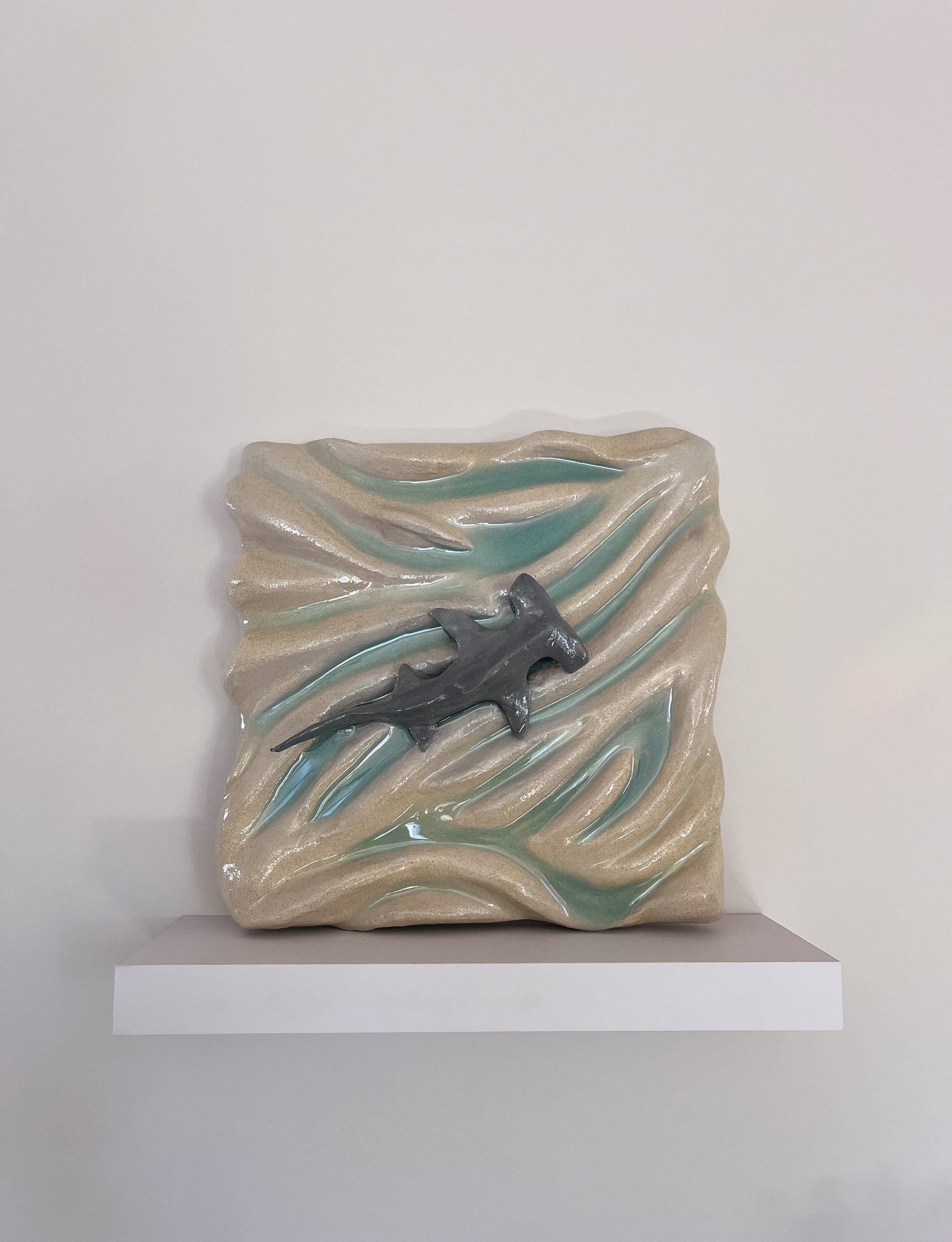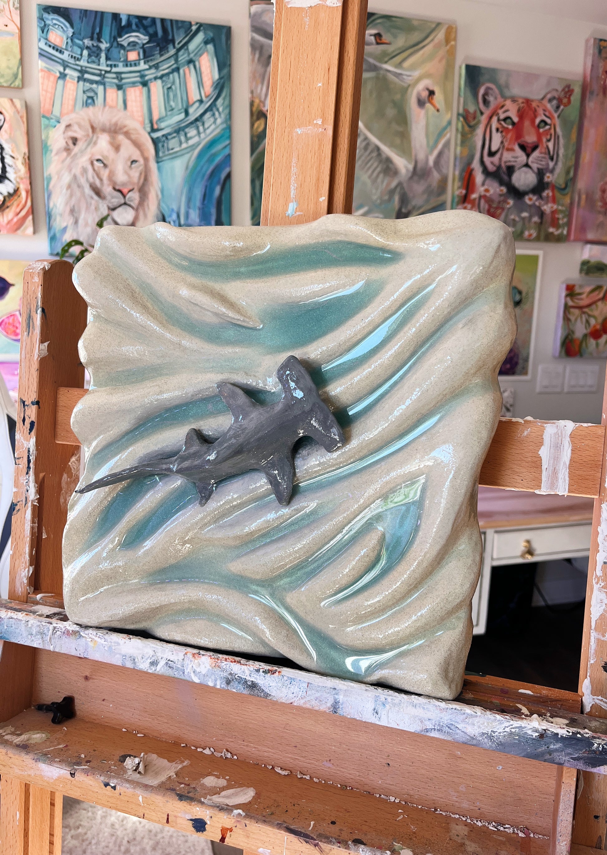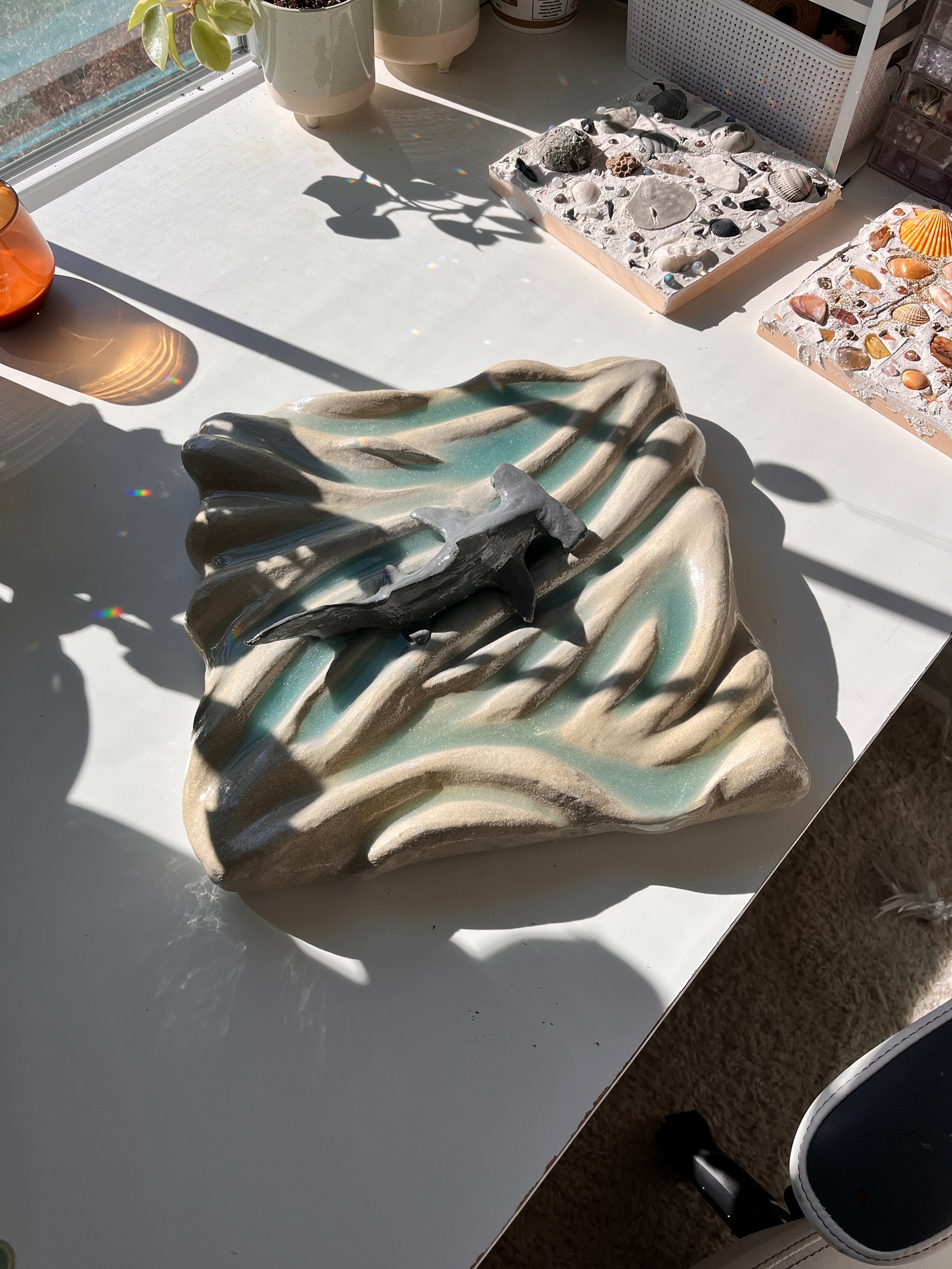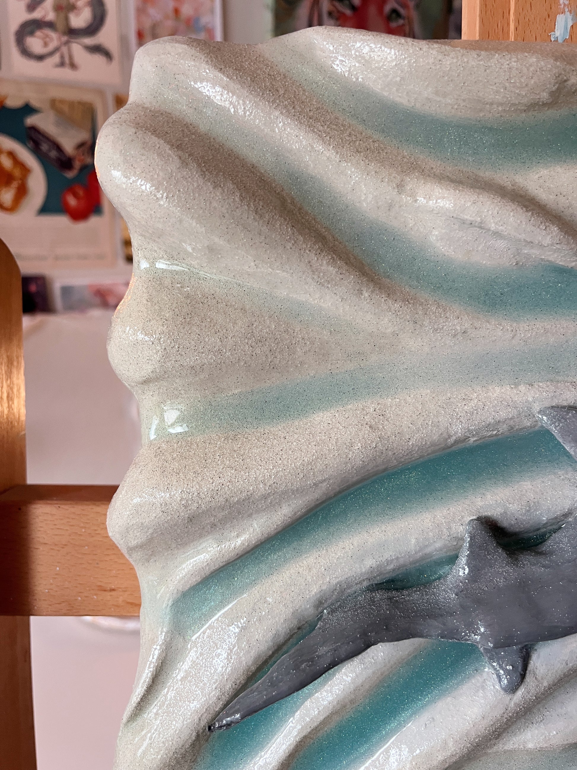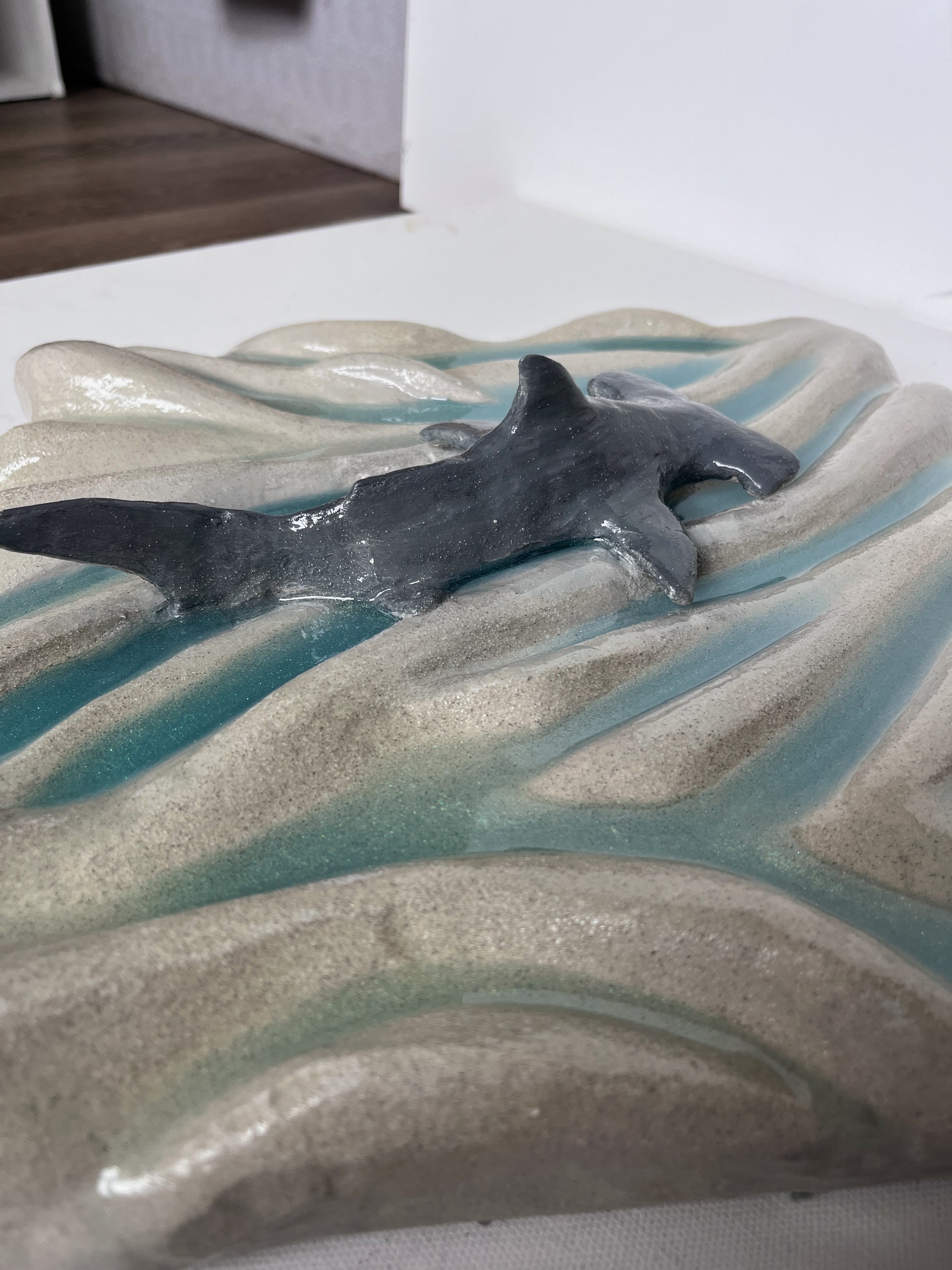 The process begins with sculpting plaster directly onto canvas, a time-intensive step that can take weeks to complete. Next, the sculpture is carefully sanded layer after layer. After the canvas is completely sculpted, I use a 2 part epoxy clay to sculpt the shark 🦈 I then used a textured spray paint to replicate sand and coated the piece in a shimmery sea blue with hints of green and gold shimmer ✨✨