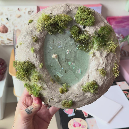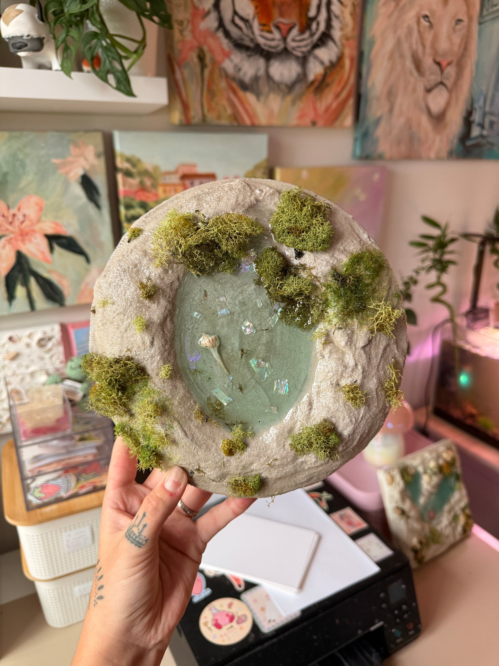 sculpted by hand with plaster, real sand, and adorned with abalone, shells, moss, and epoxy resin!