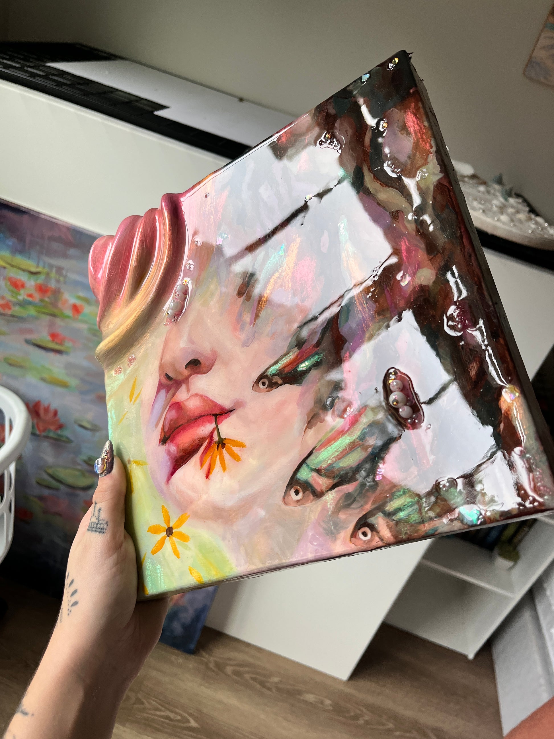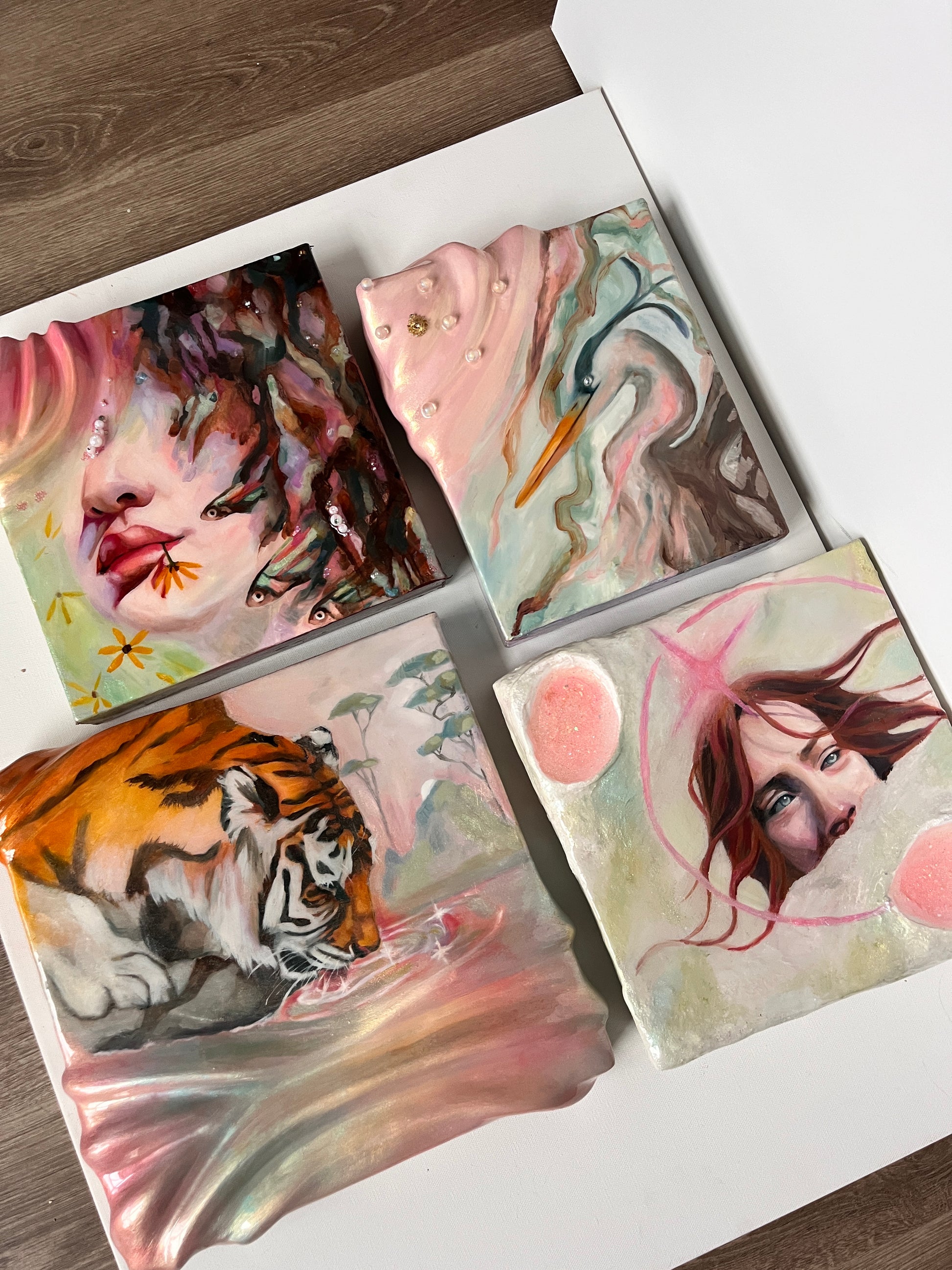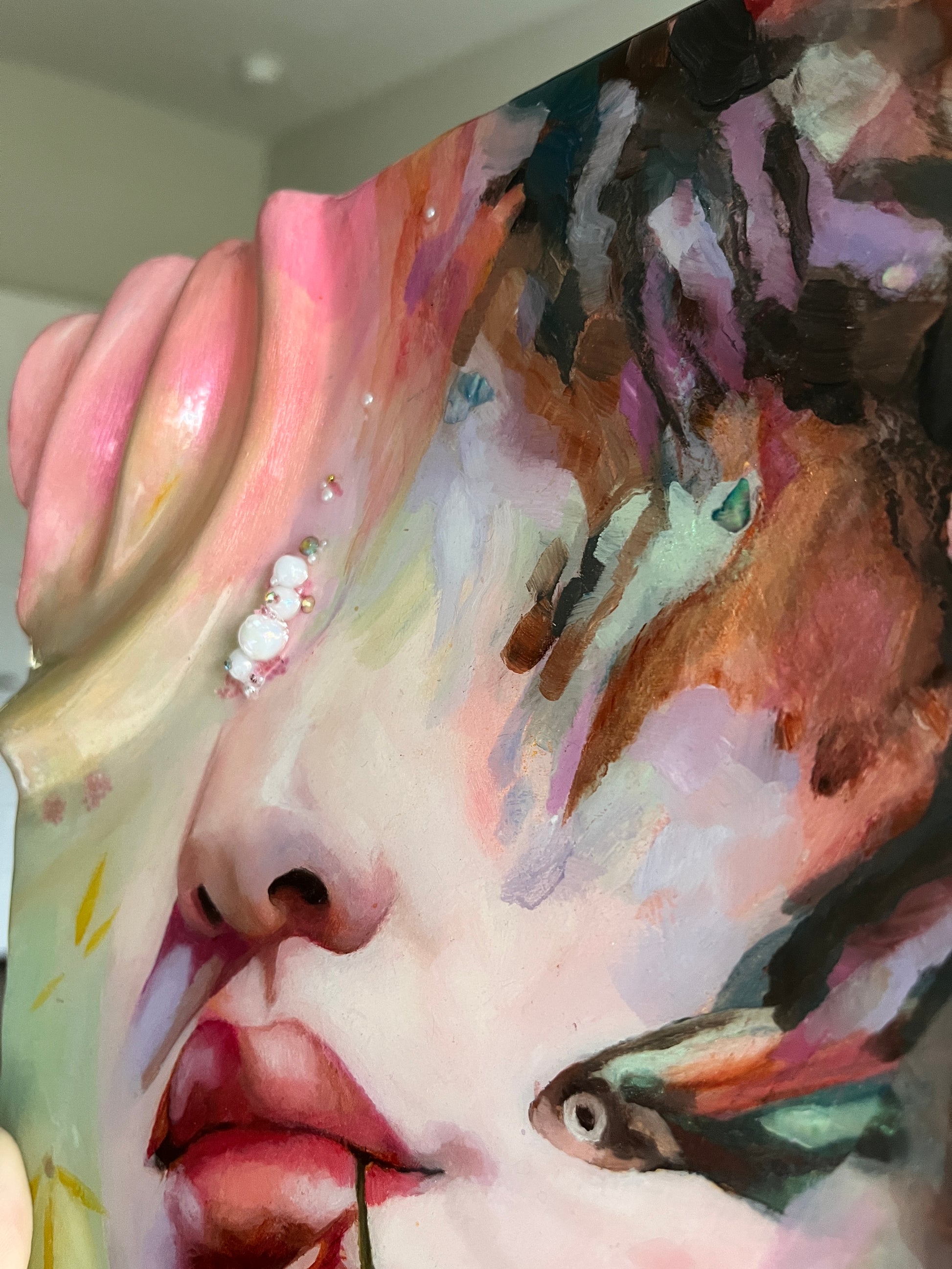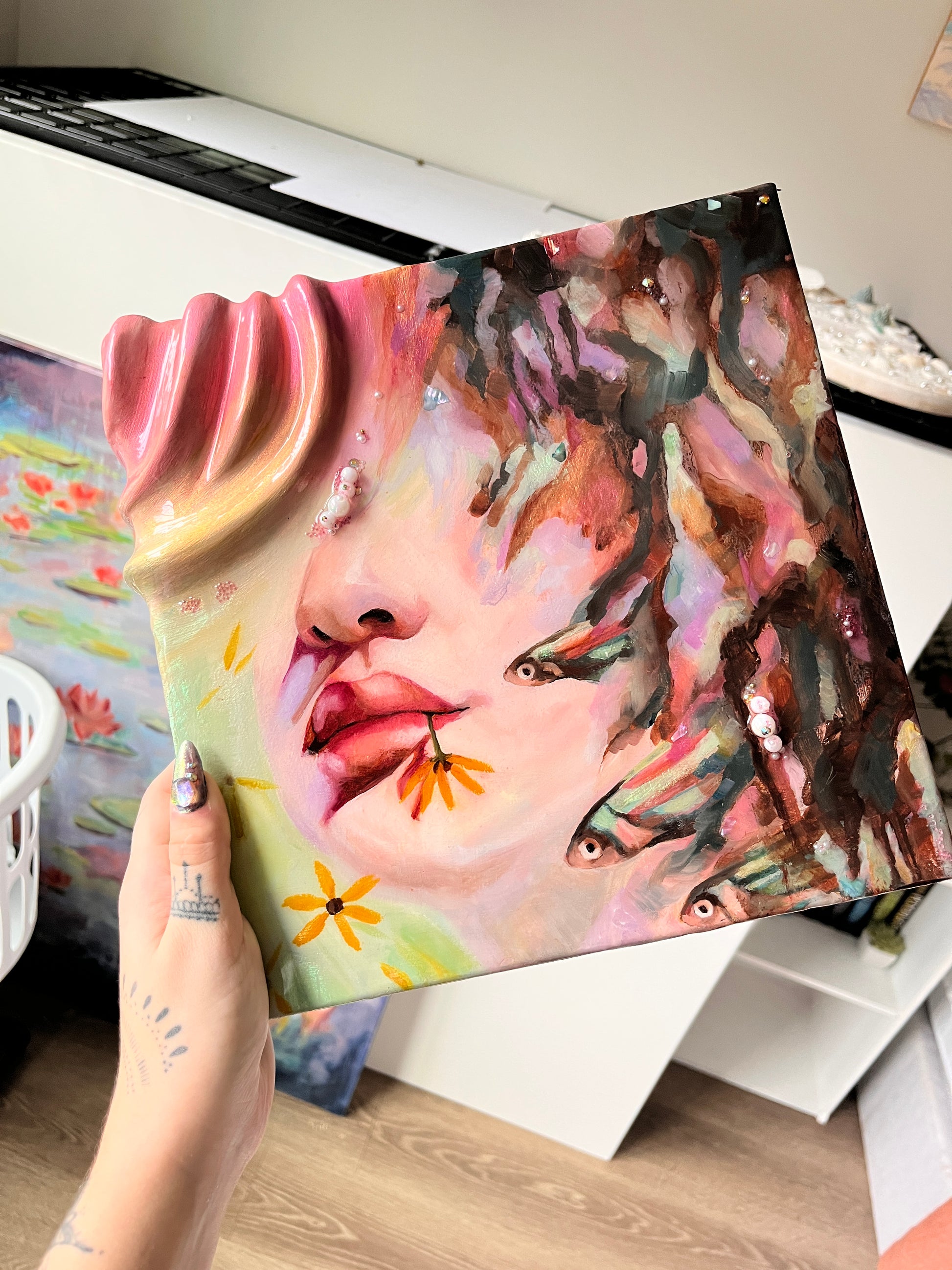The process begins with sculpting plaster directly onto canvas, a time-intensive step that can take weeks to complete. Once the desired form is achieved, the sculpture is carefully sanded layer after layer. Then each pieces is painted with oil paints and mixed media, incorporating bright colors and iridescent elements to bring the piece to life. To protect the artwork and enhance its longevity, a final coat of UV-resistant resin is applied. This not only preserves the vibrant colors and iridescent qualities but also adds a glossy finish that further accentuates the artwork's dimensional aspects and adds an extra layer of protection