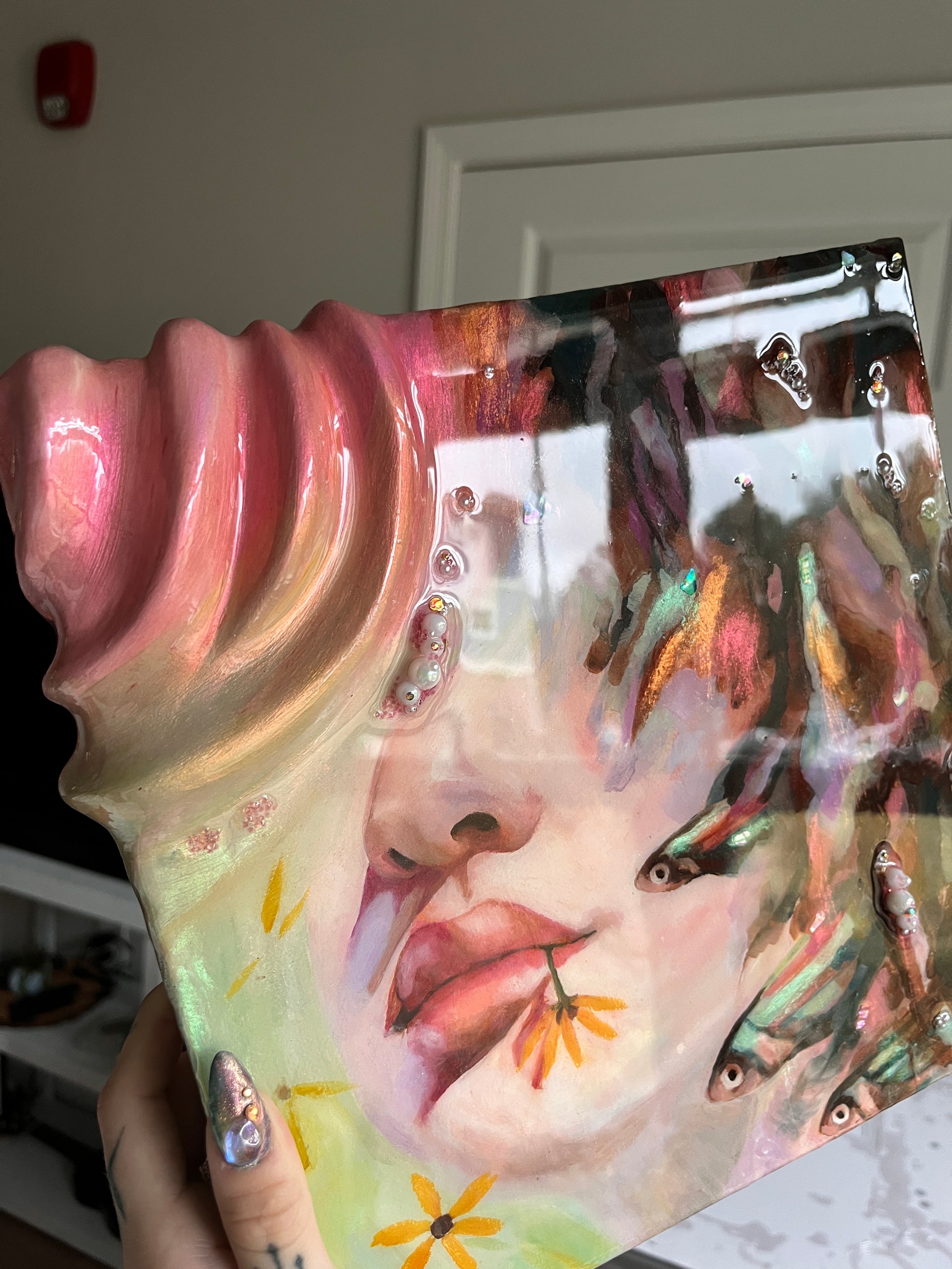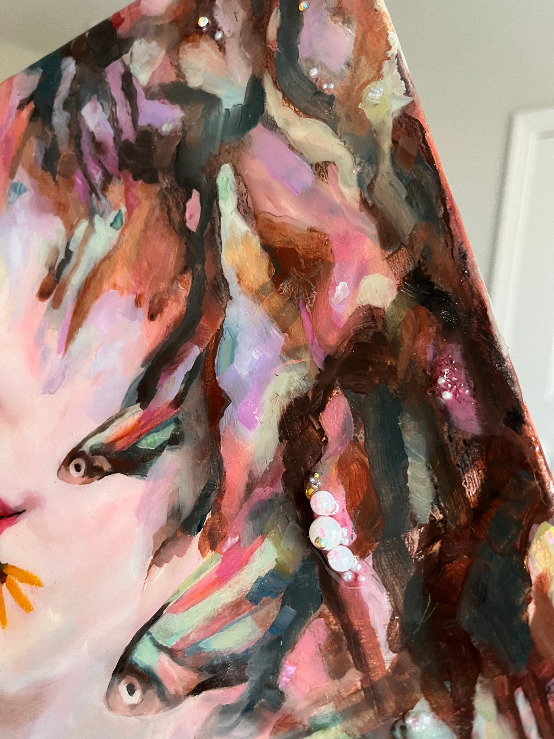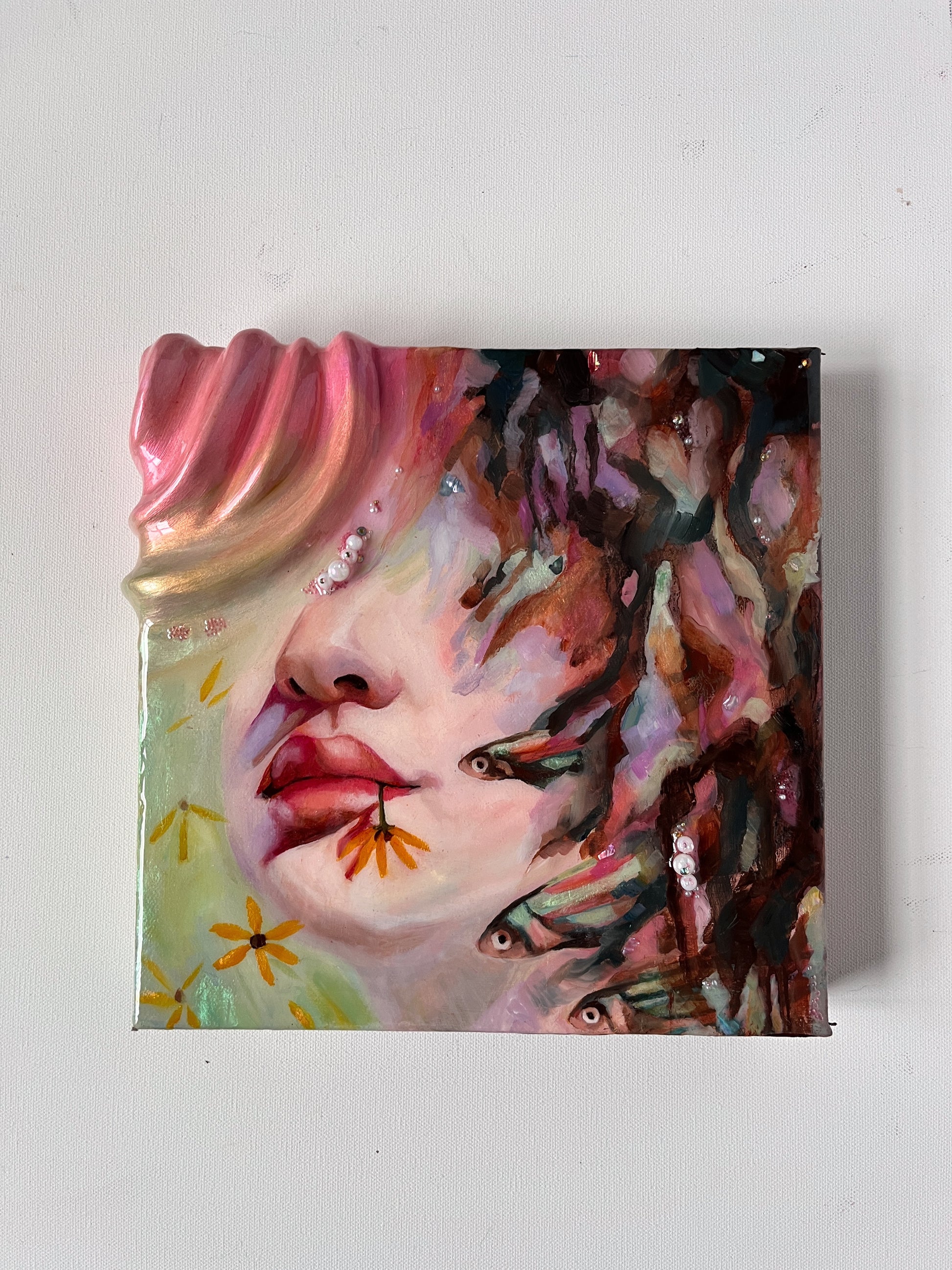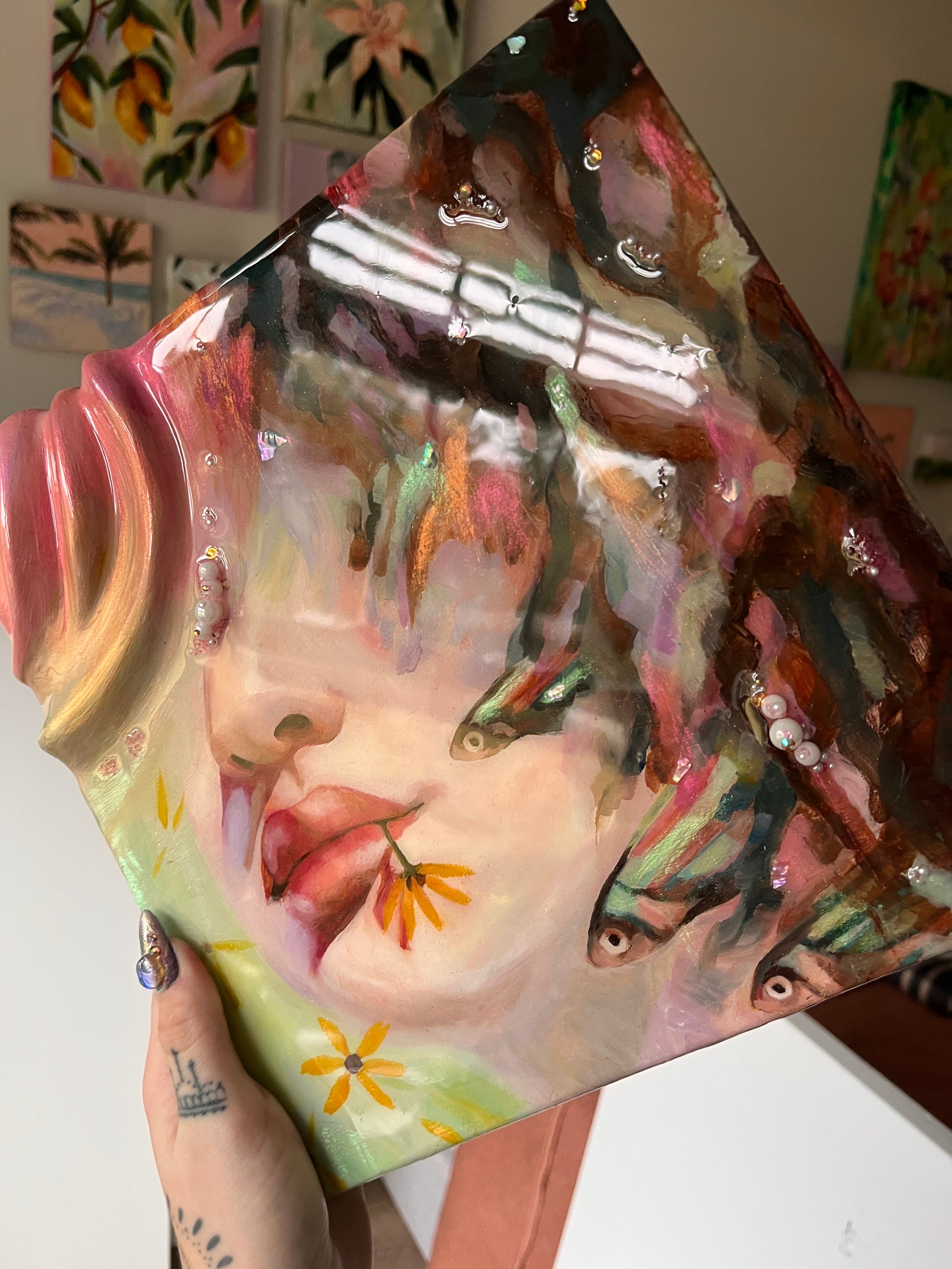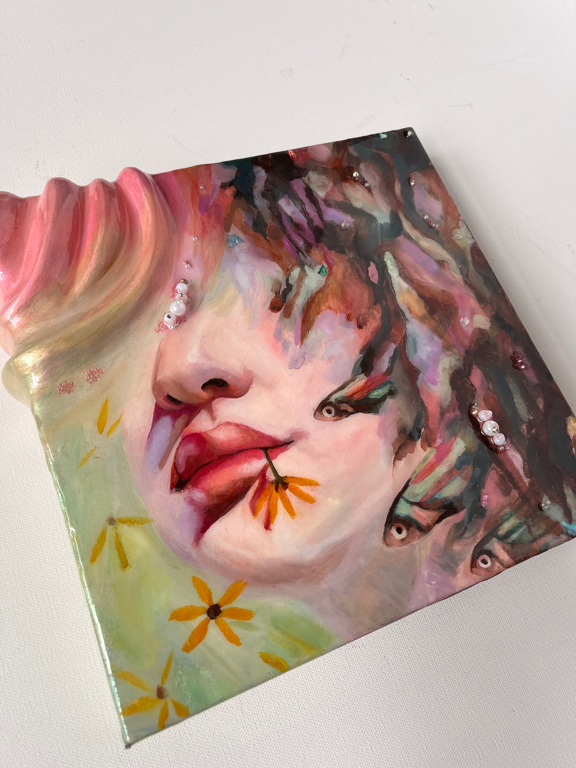 The process begins with sculpting plaster directly onto canvas, a time-intensive step that can take weeks to complete. Once the desired form is achieved, the sculpture is carefully sanded layer after layer. Then each pieces is painted with oil paints and mixed media, incorporating bright colors and iridescent elements to bring the piece to life. To protect the artwork and enhance its longevity, a final coat of UV-resistant resin is applied. This not only preserves the vibrant colors and iridescent qualities but also adds a glossy finish that further accentuates the artwork's dimensional aspects and adds an extra layer of protection