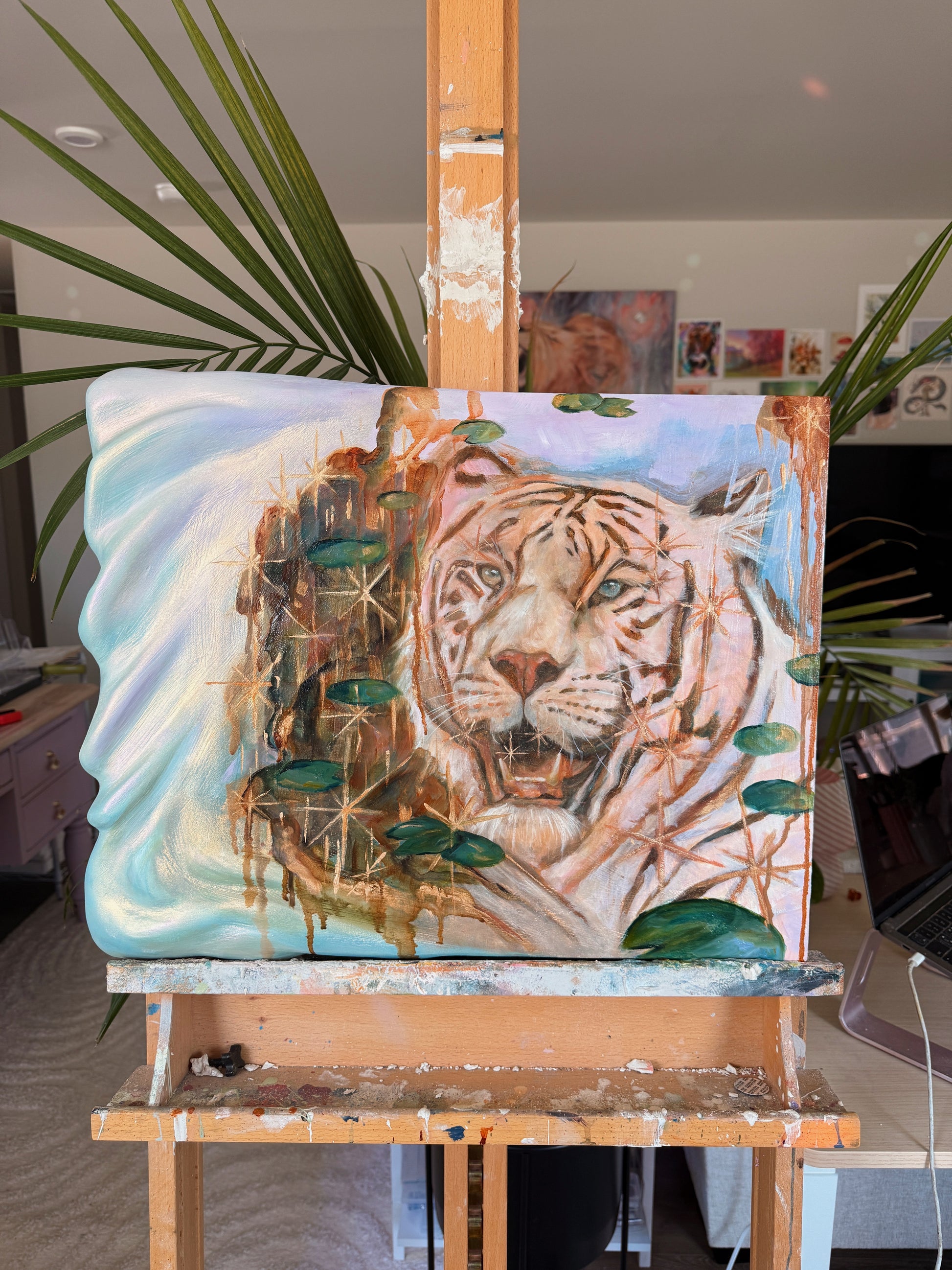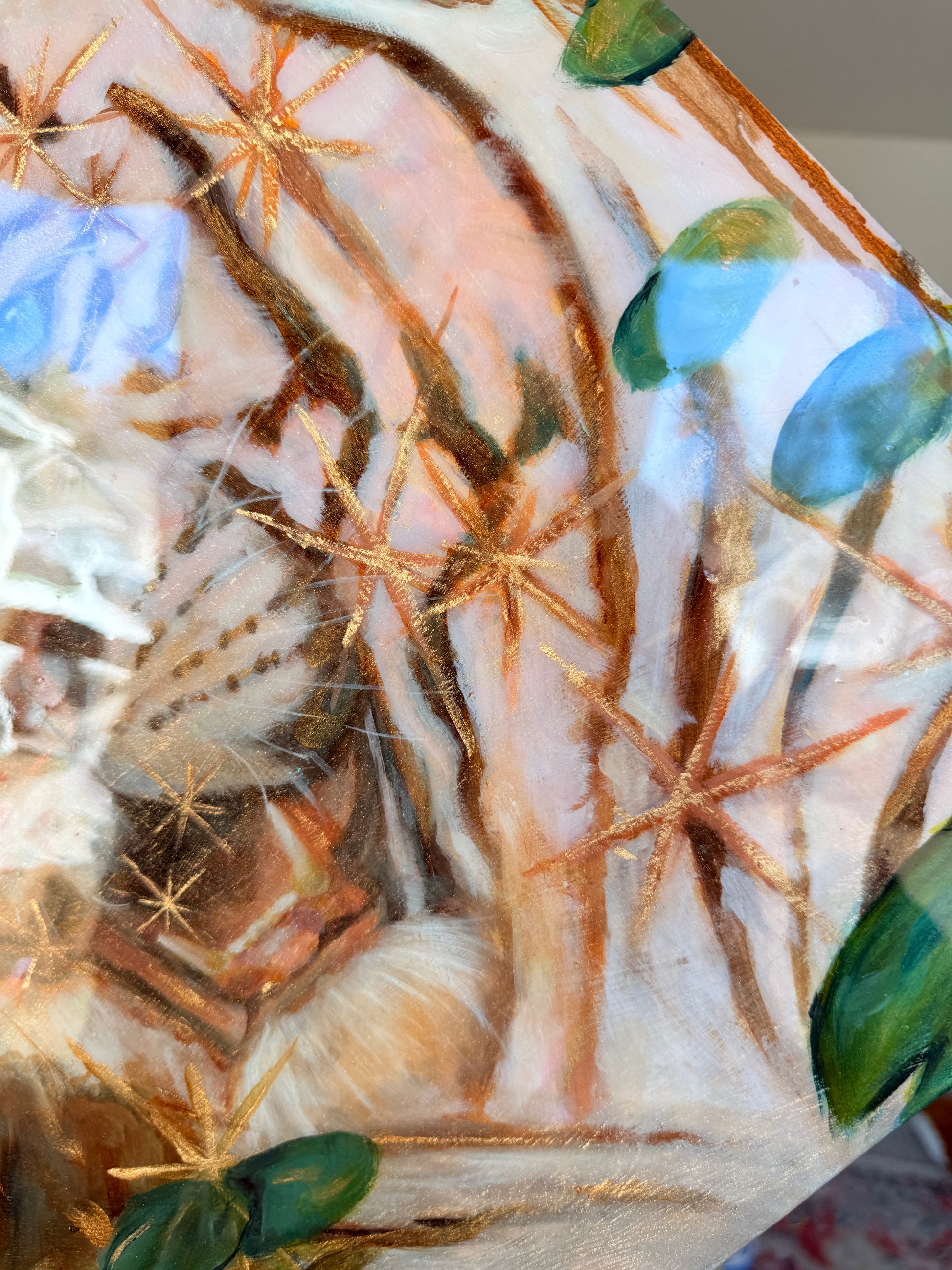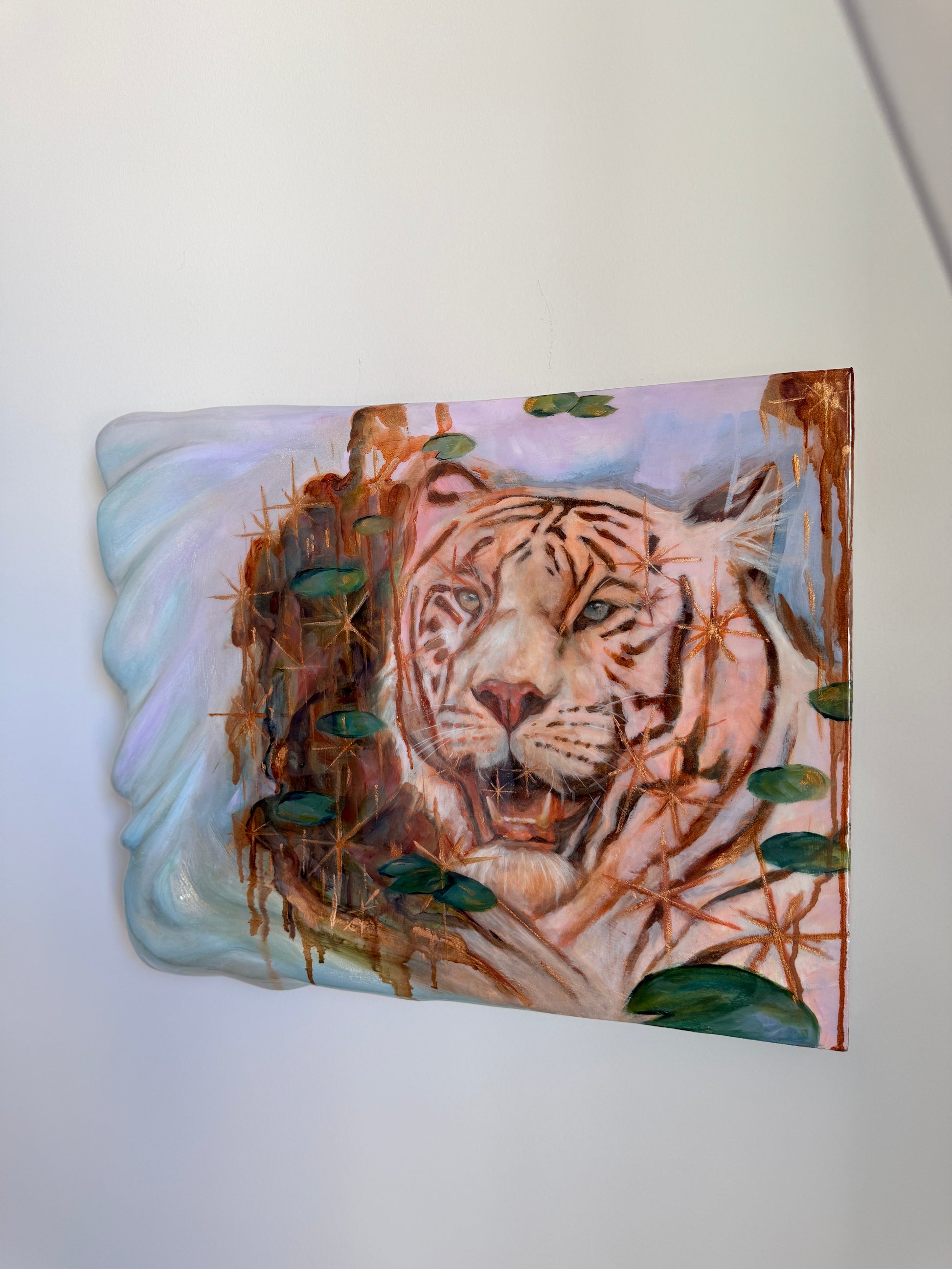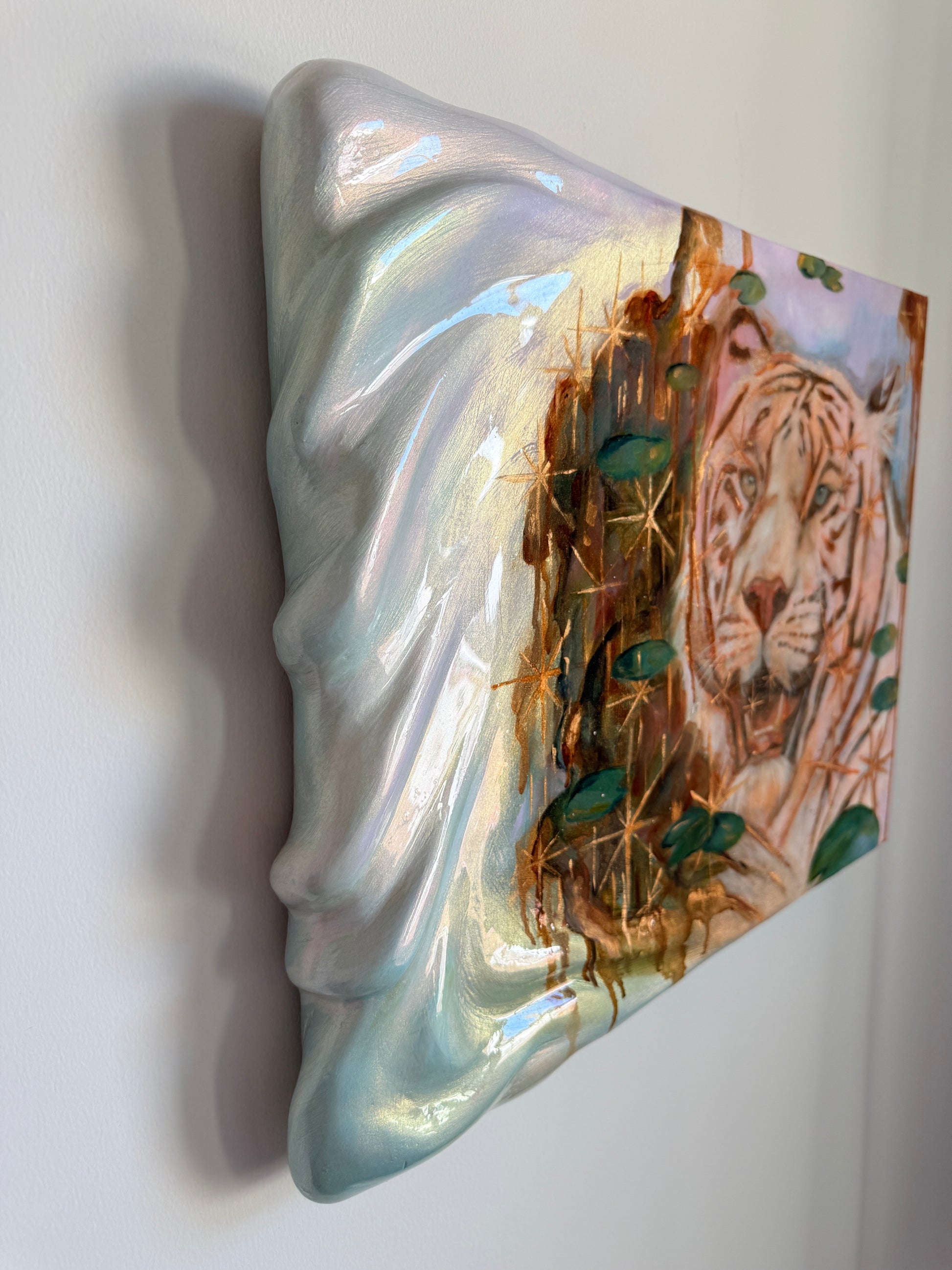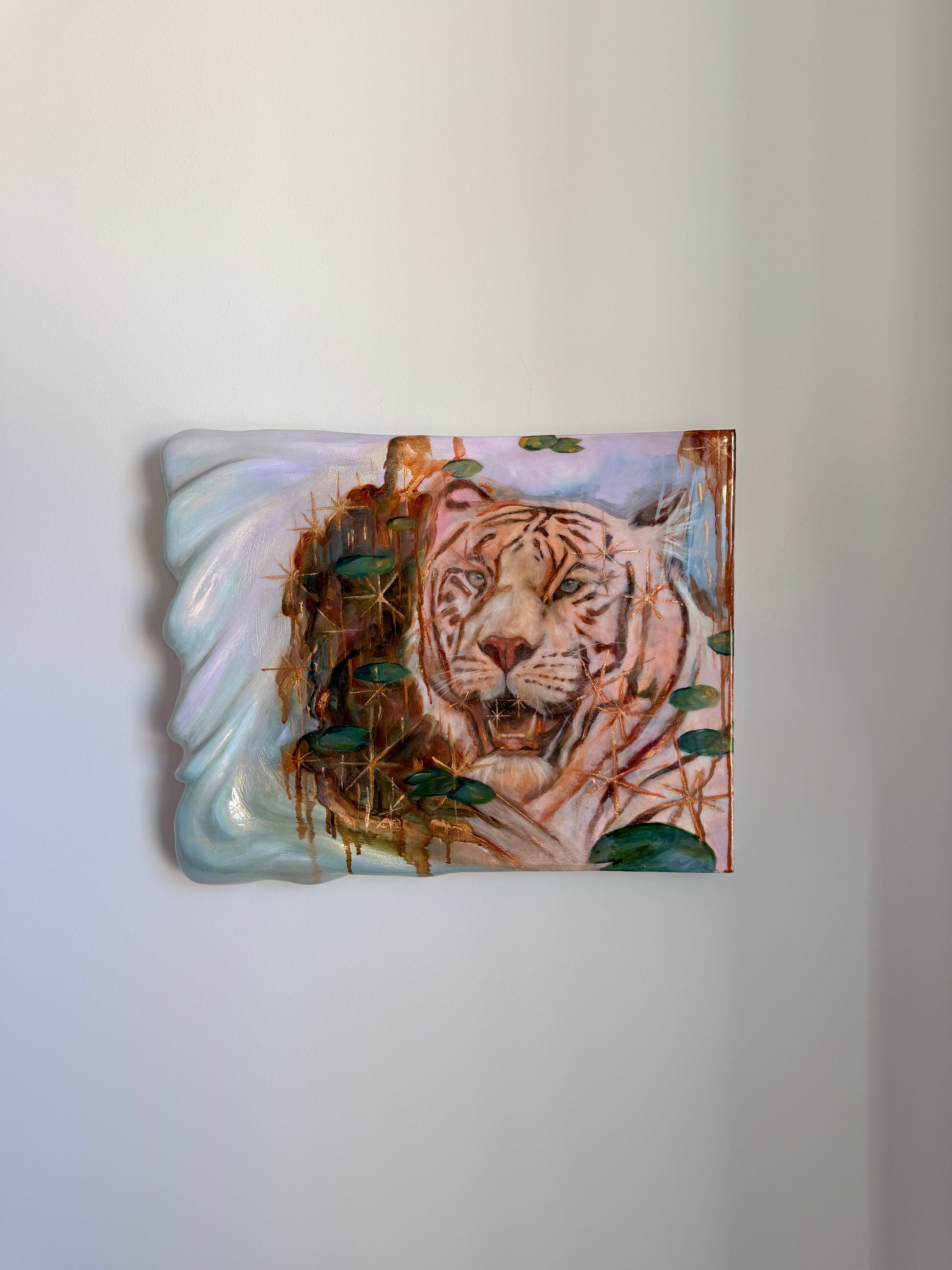Each piece is original in it's own way with each layer of joint compound carefully sanded and sculpted to it's desired form. I sand by hand with a strong grit or with a dremel for finer details until the surface is mostly smooth. Each piece is painted using mixed media and oils and then brushed with mica powder to give that glittery iridescent shimmer! Then it is coated with a specific epoxy resin that is made to preserve artwork and resist yellowing overtime. Each piece carries its own kind of whimsy and magic 💫