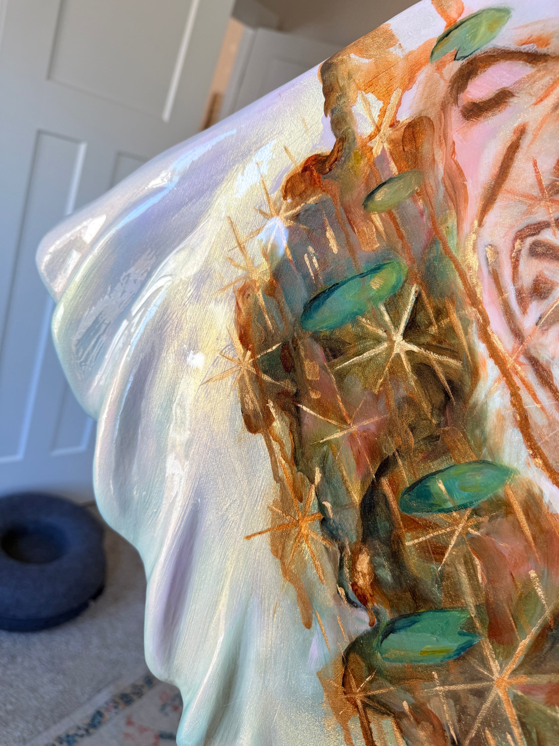 mixed media, plaster, joint compound, oils, glitter, epoxy resin