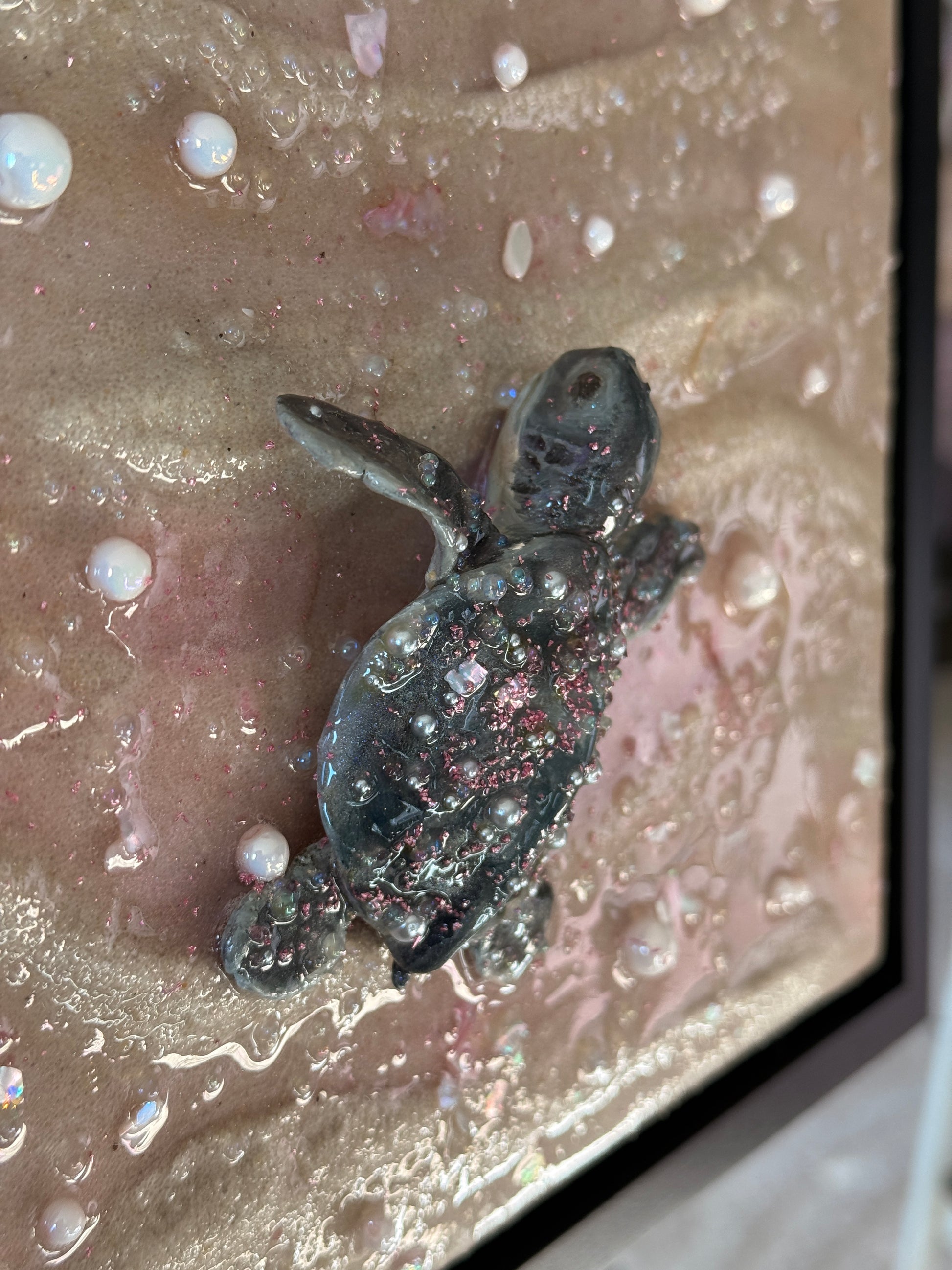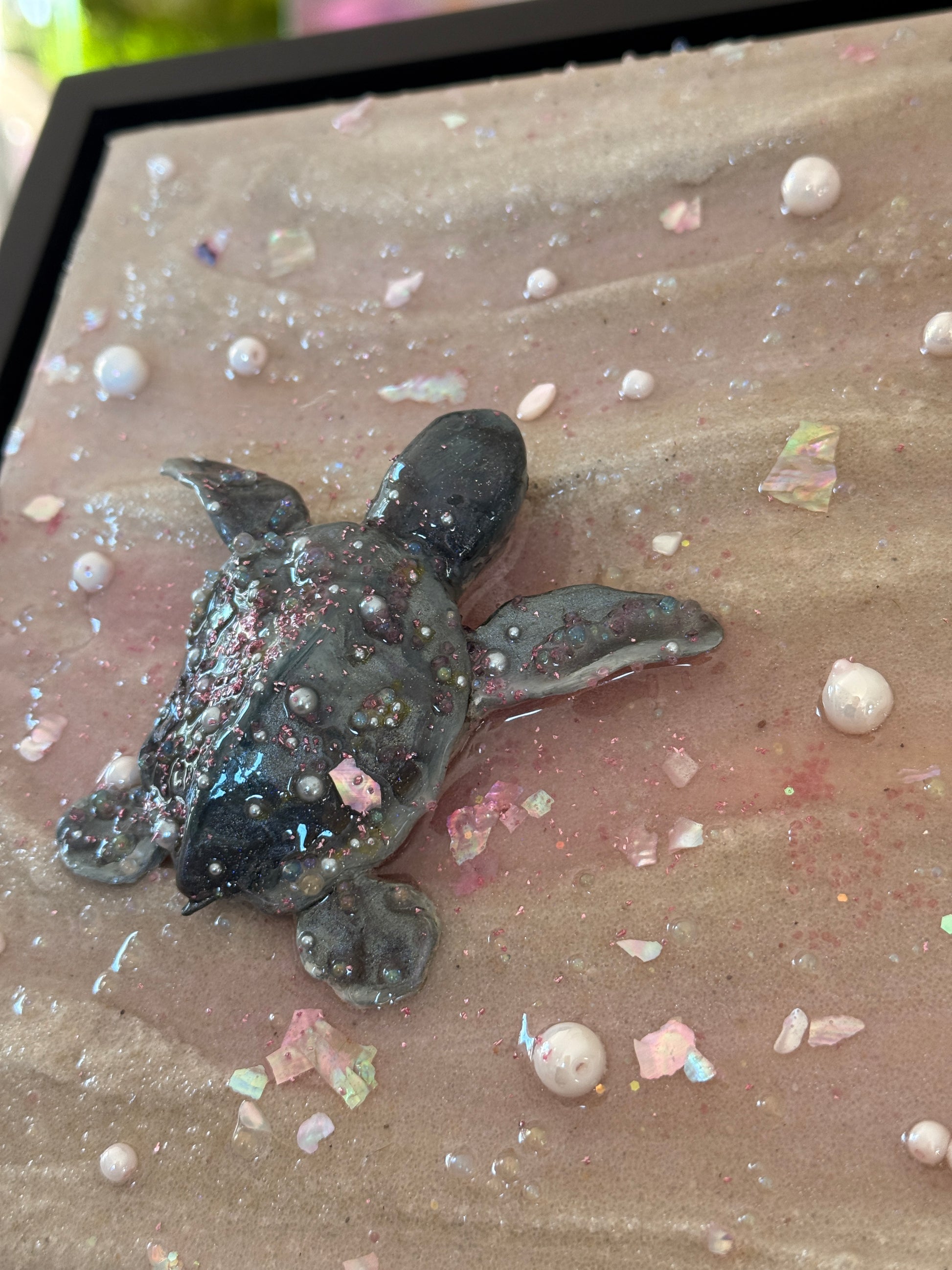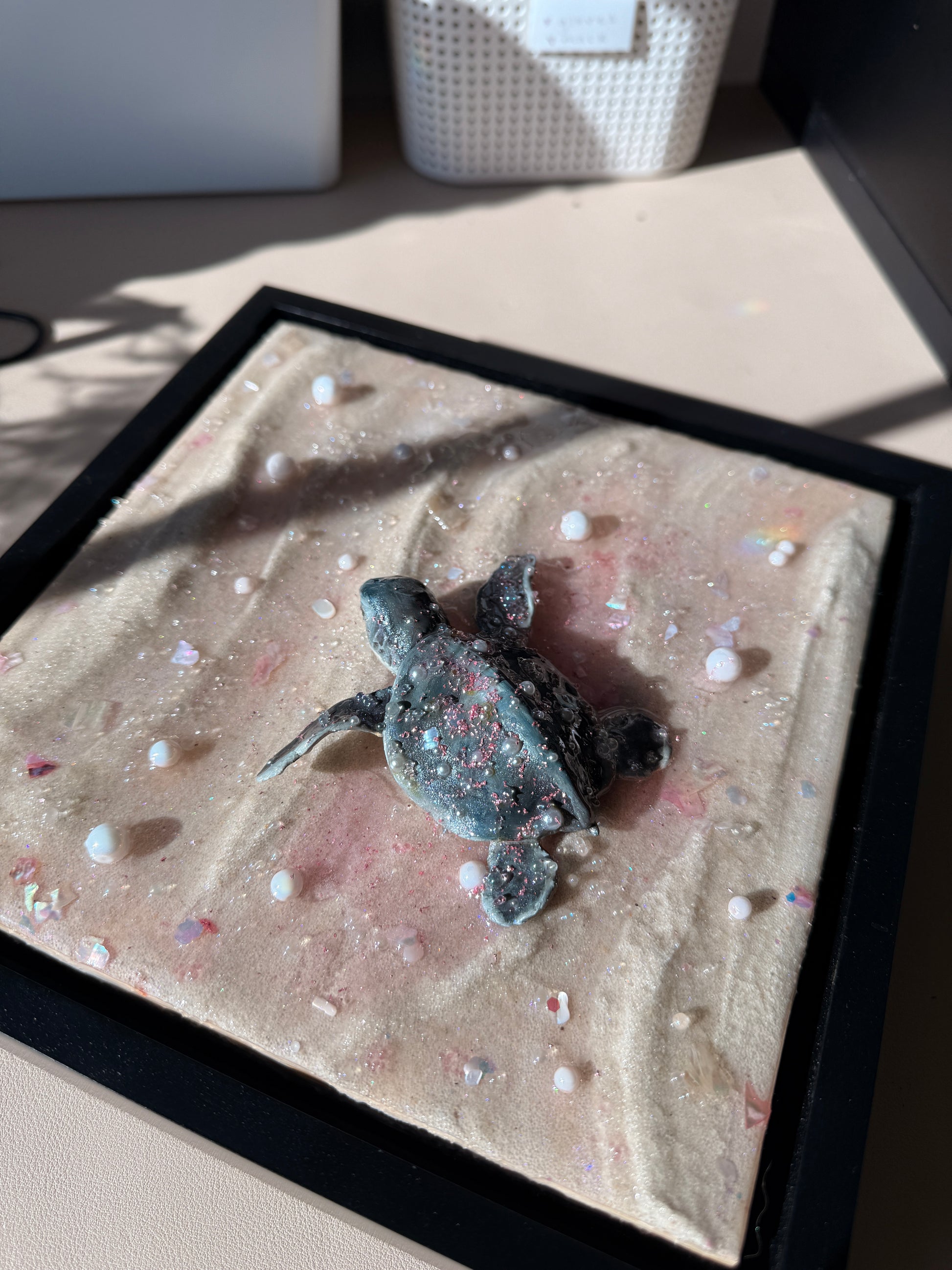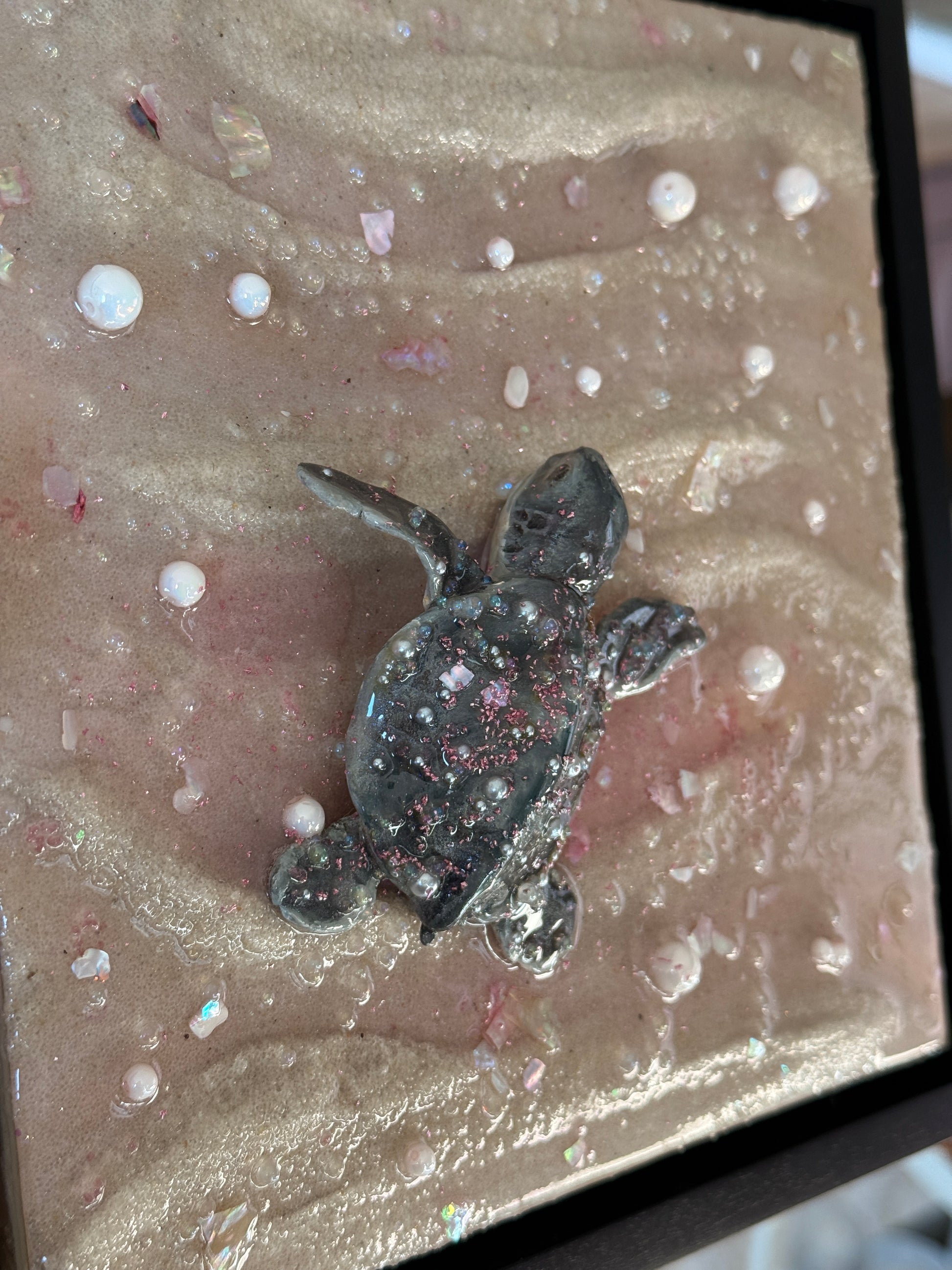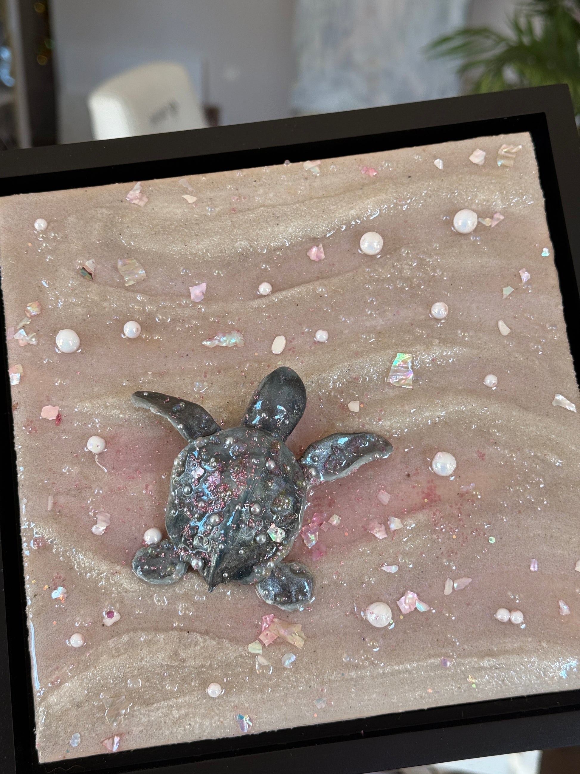 a baby sea turtle making its journey to the sea at sunset 🌊 sculpted all by hand this piece is made from real sand, clay, epoxy resin, and oil paint. Mounted on an 8 x 8 x 1.5 in. canvas and framed in a black 1.5 x 1.5 x 1⅞ floater frame!
