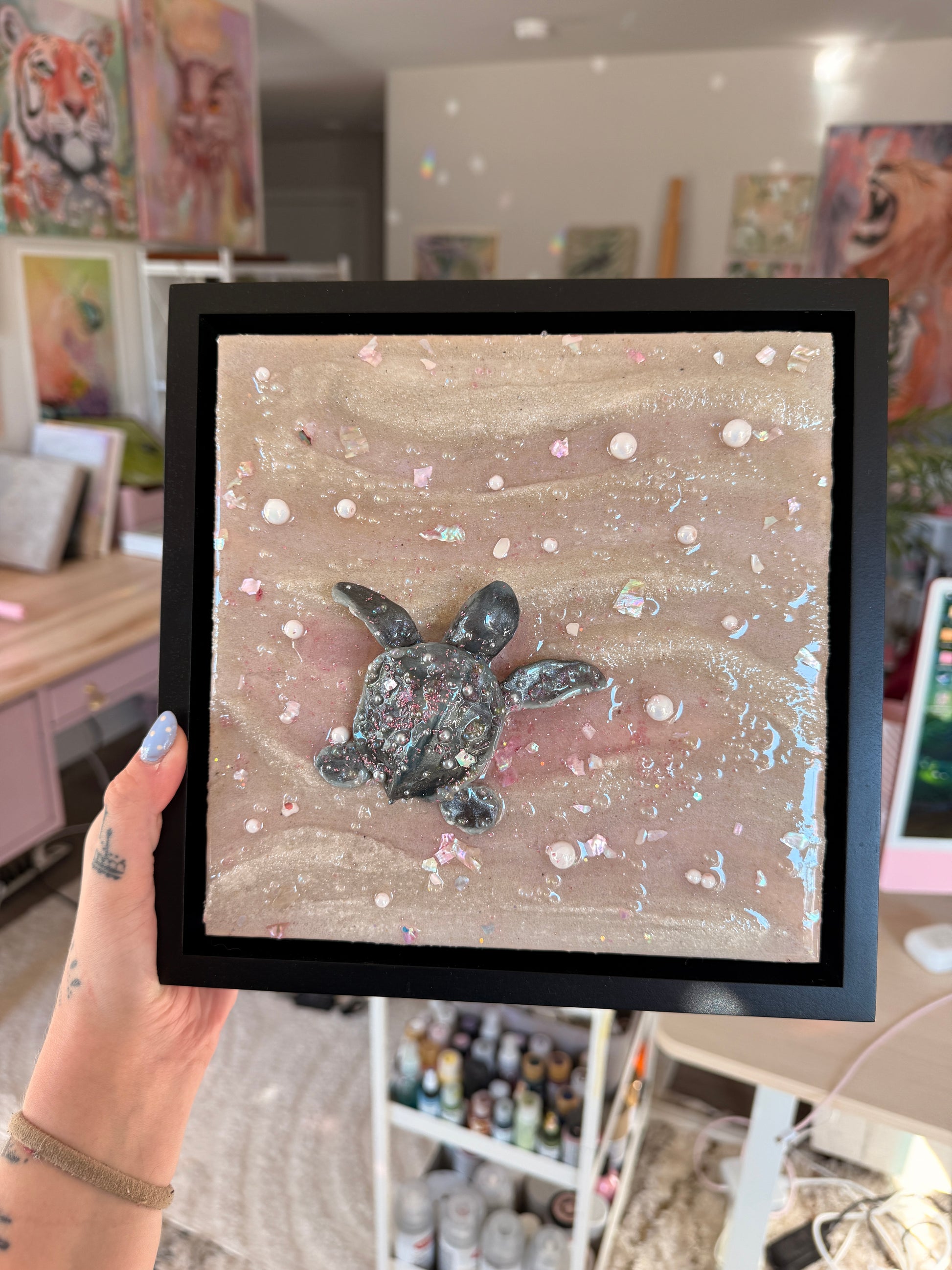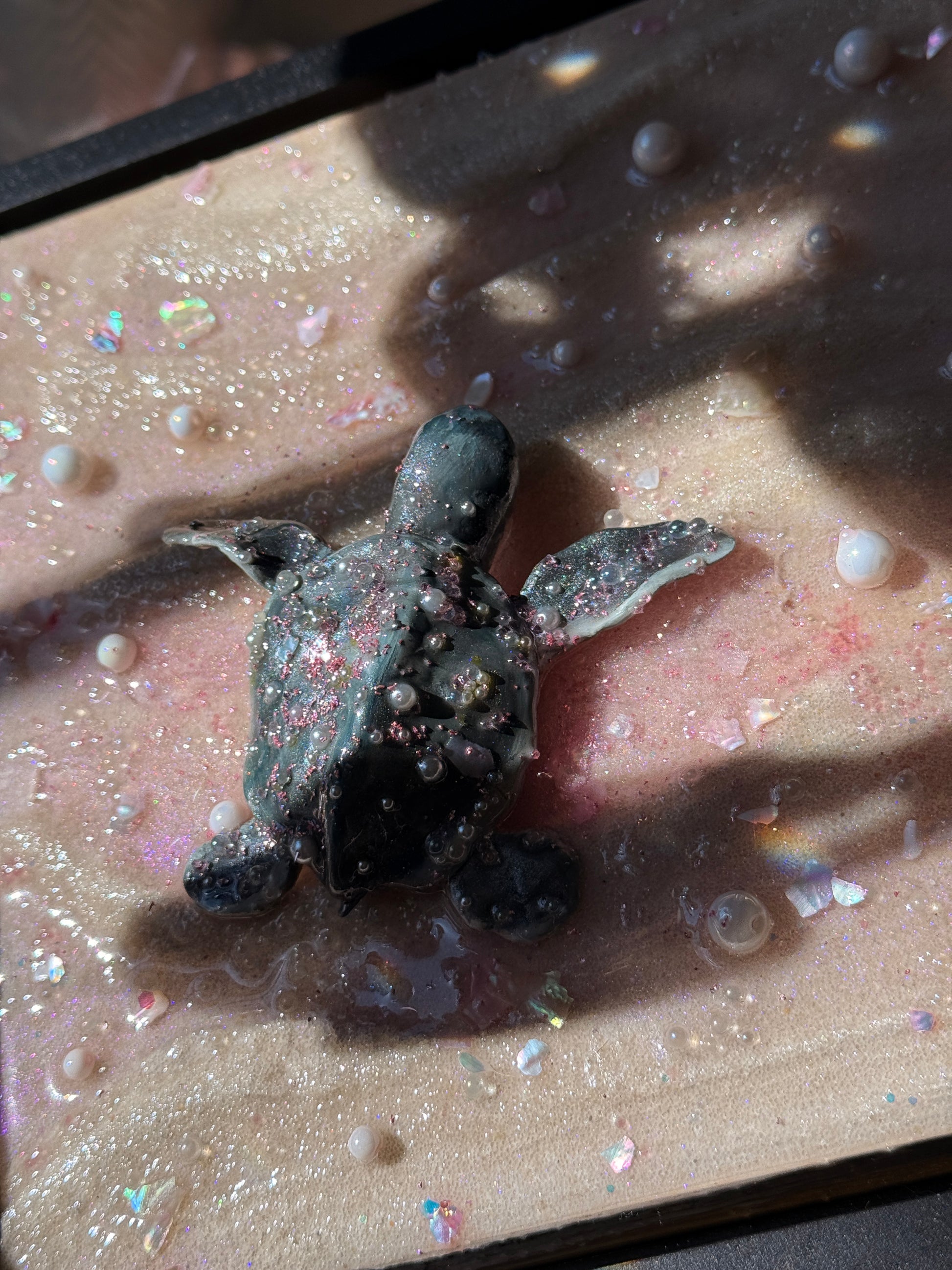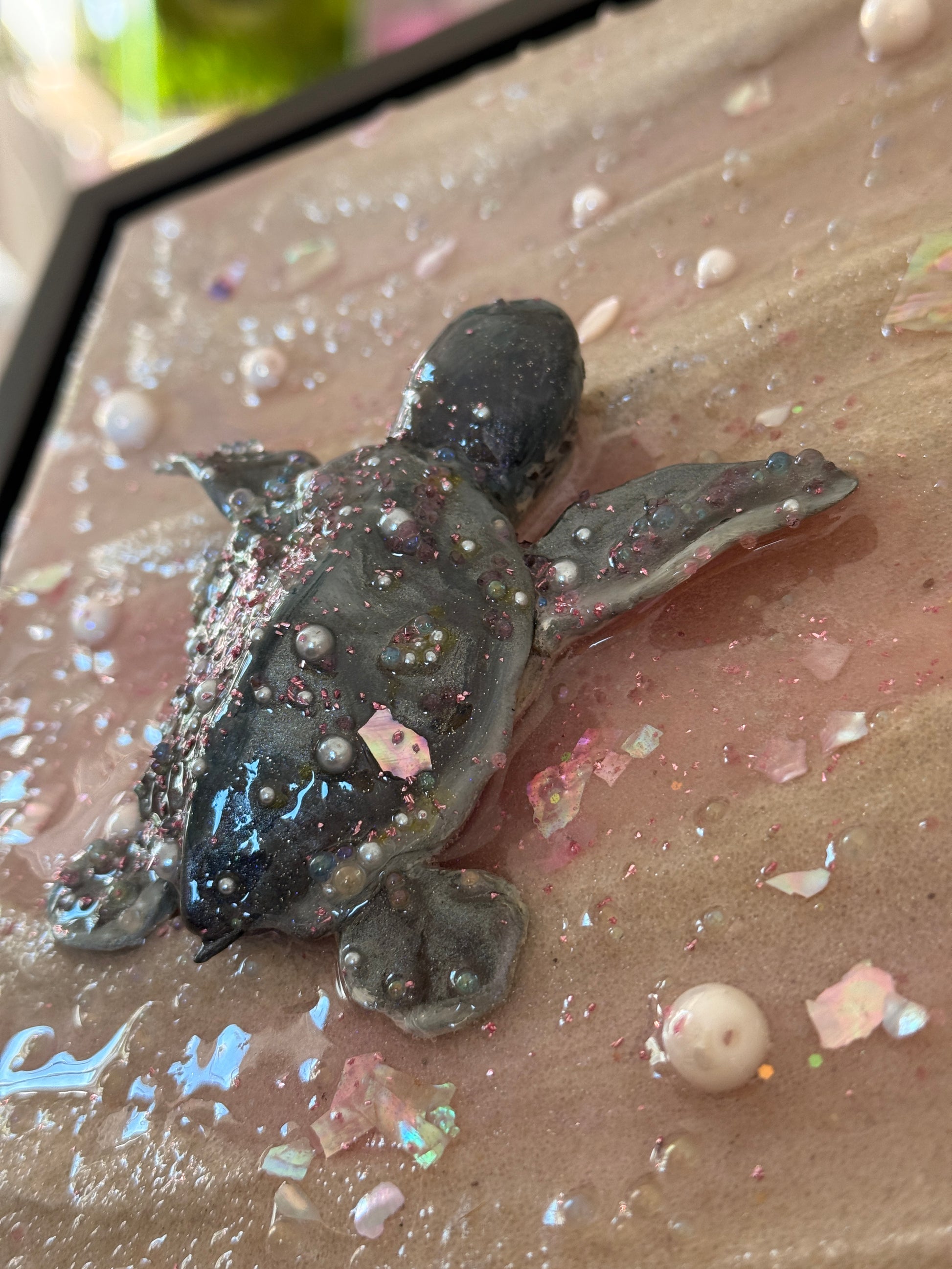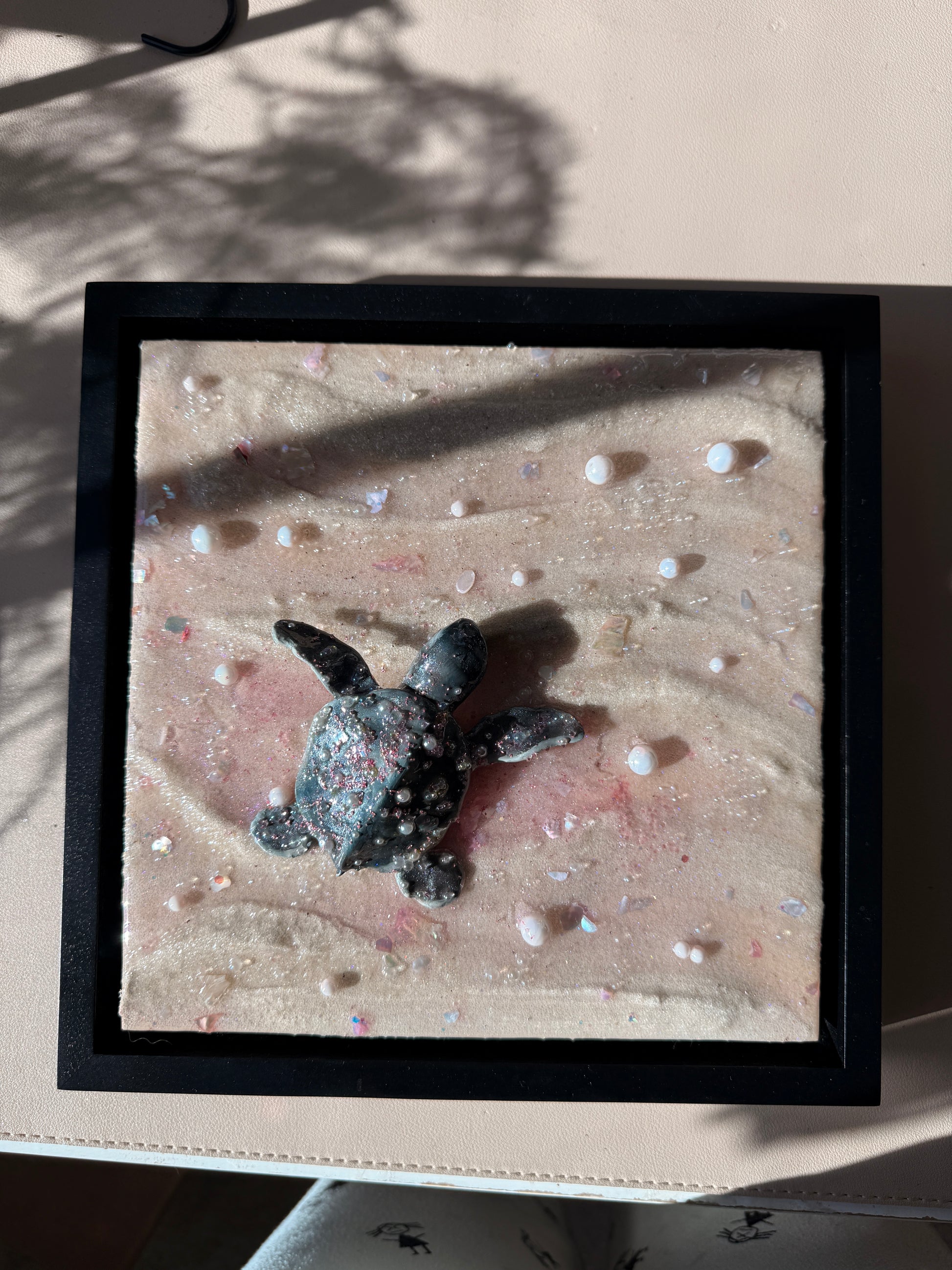 a baby sea turtle making its journey to the sea at sunset 🌊 sculpted all by hand this piece is made from real sand, clay, epoxy resin, and oil paint. Mounted on an 8 x 8 x 1.5 in. canvas and framed in a black 1.5 x 1.5 x 1⅞ floater frame!