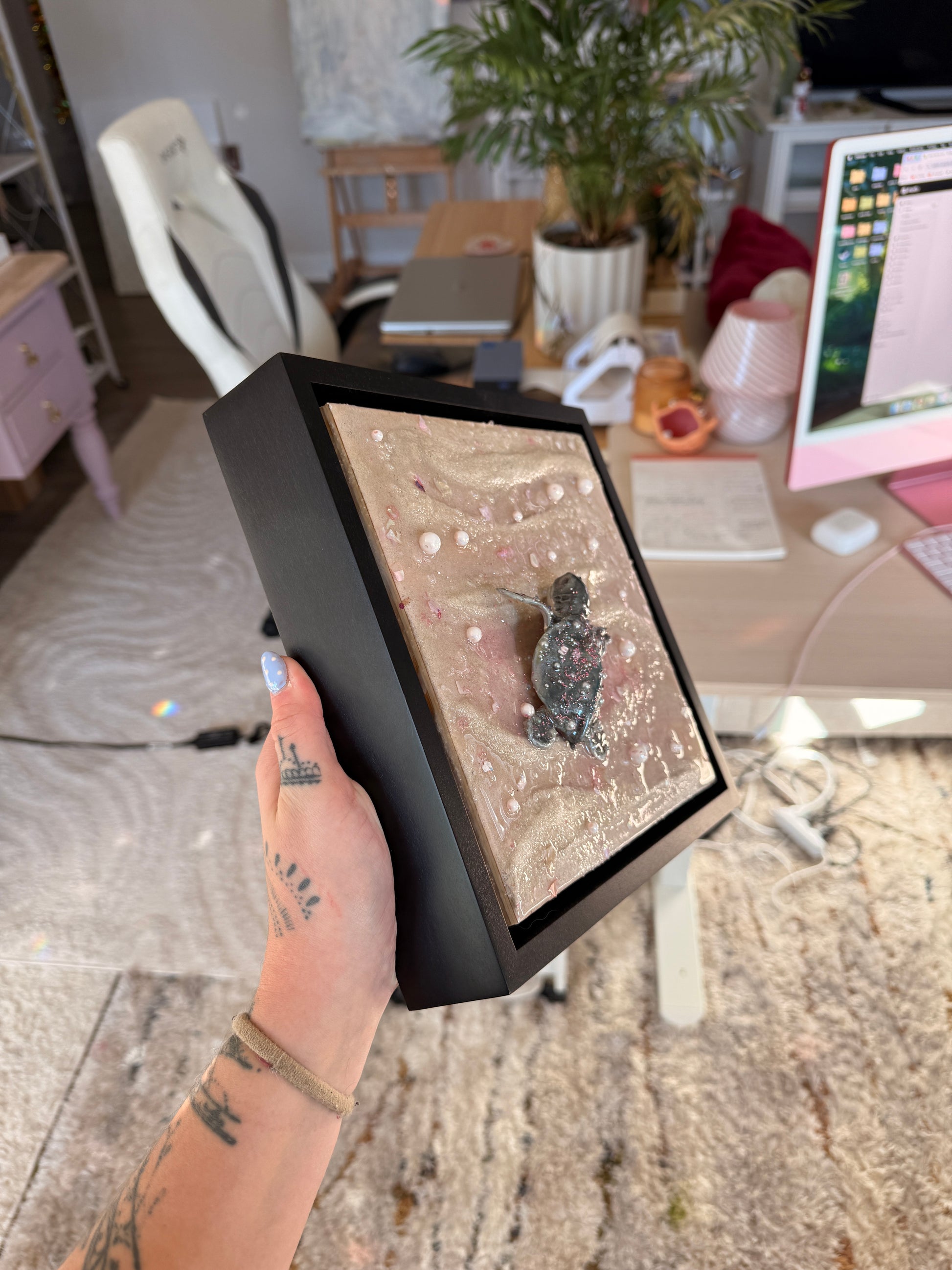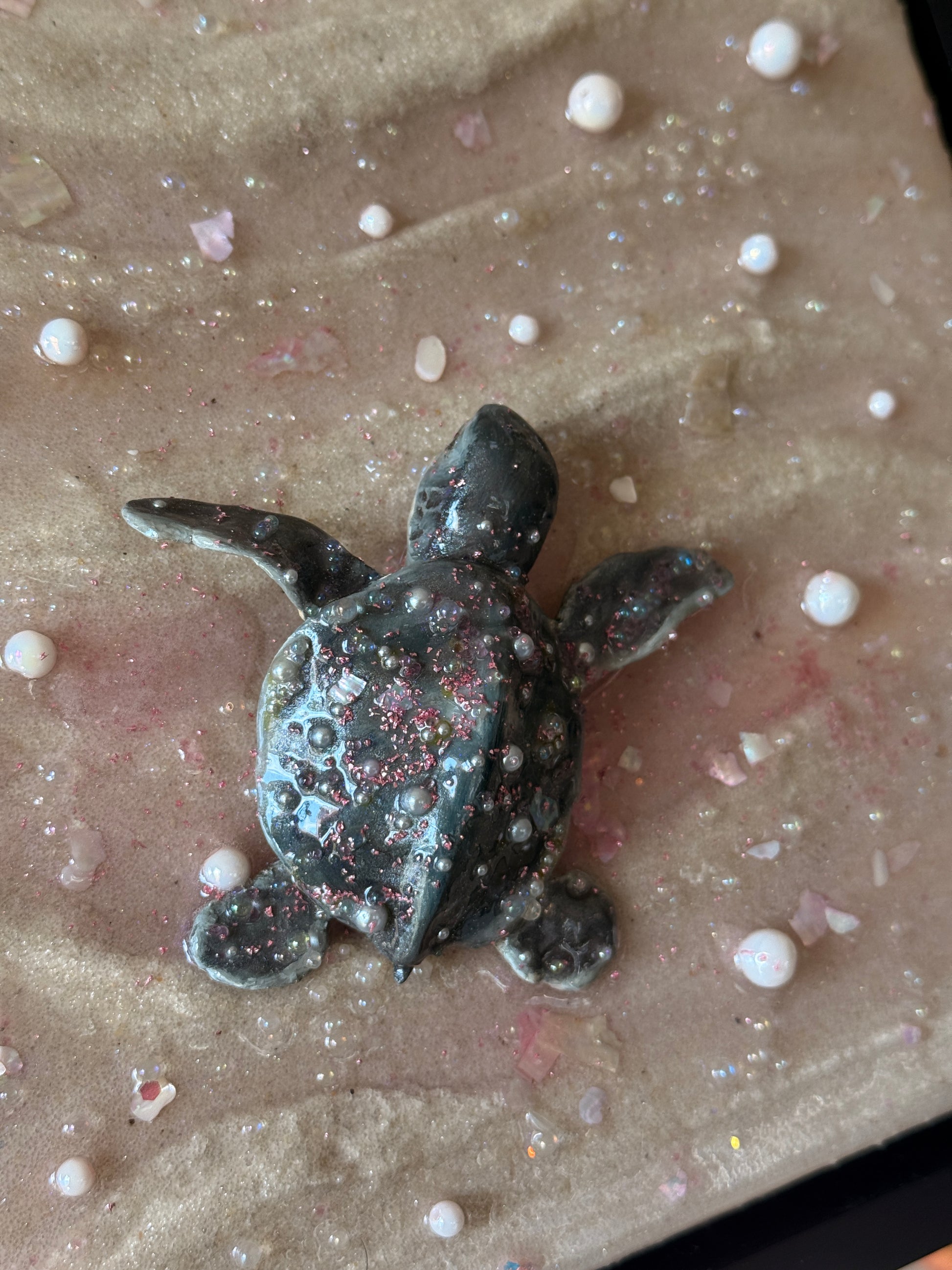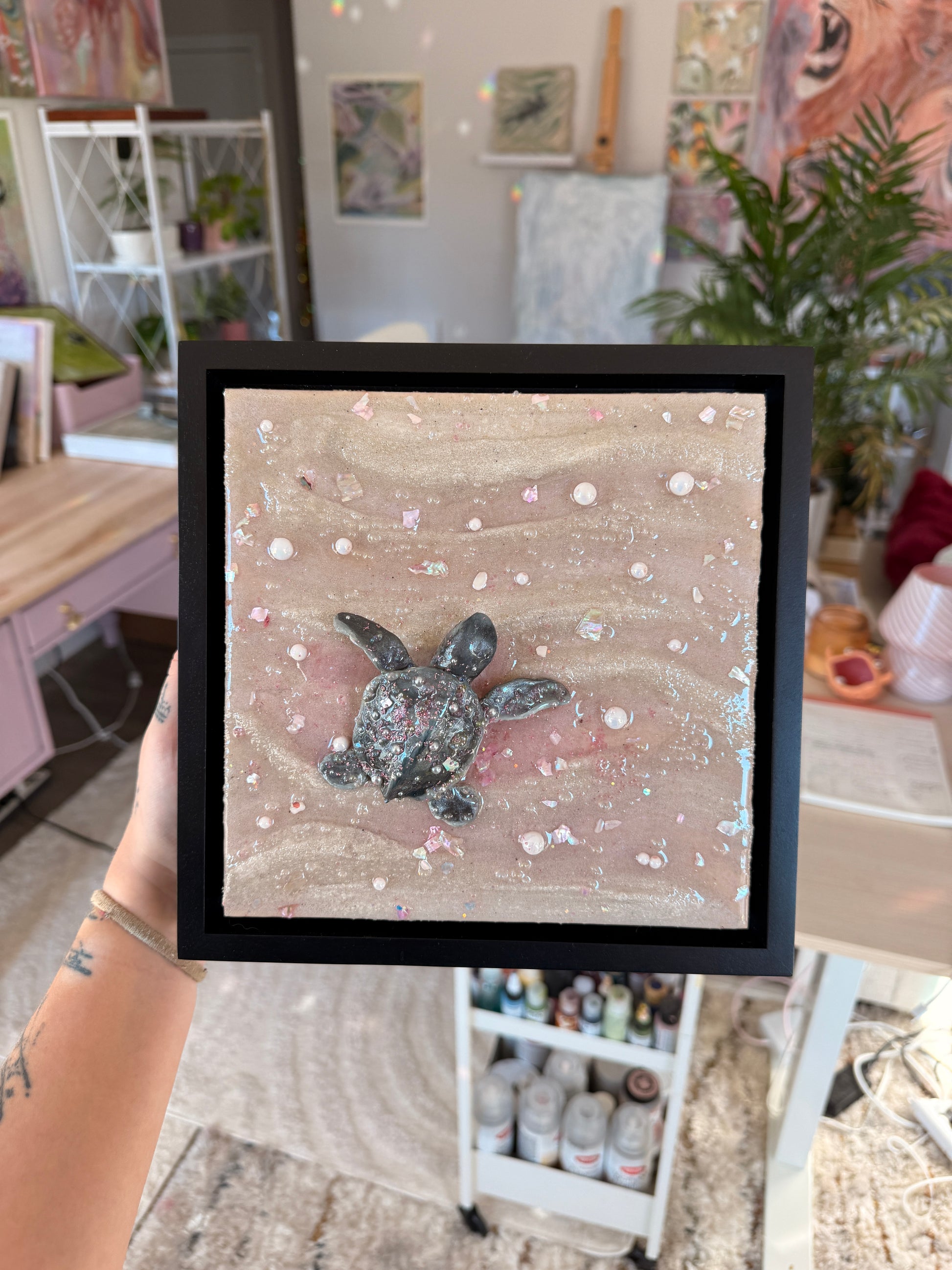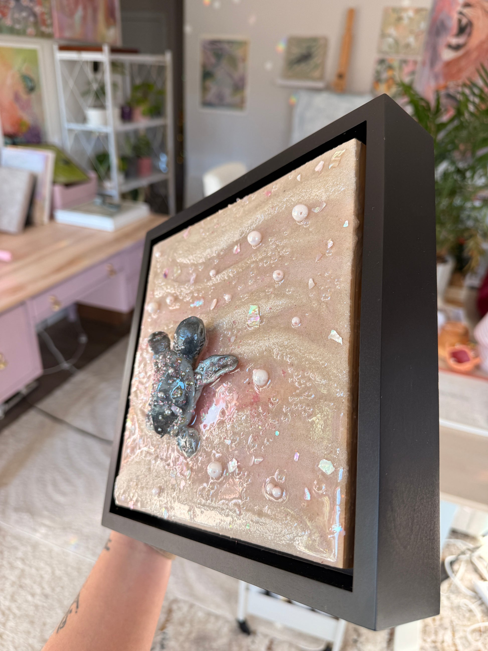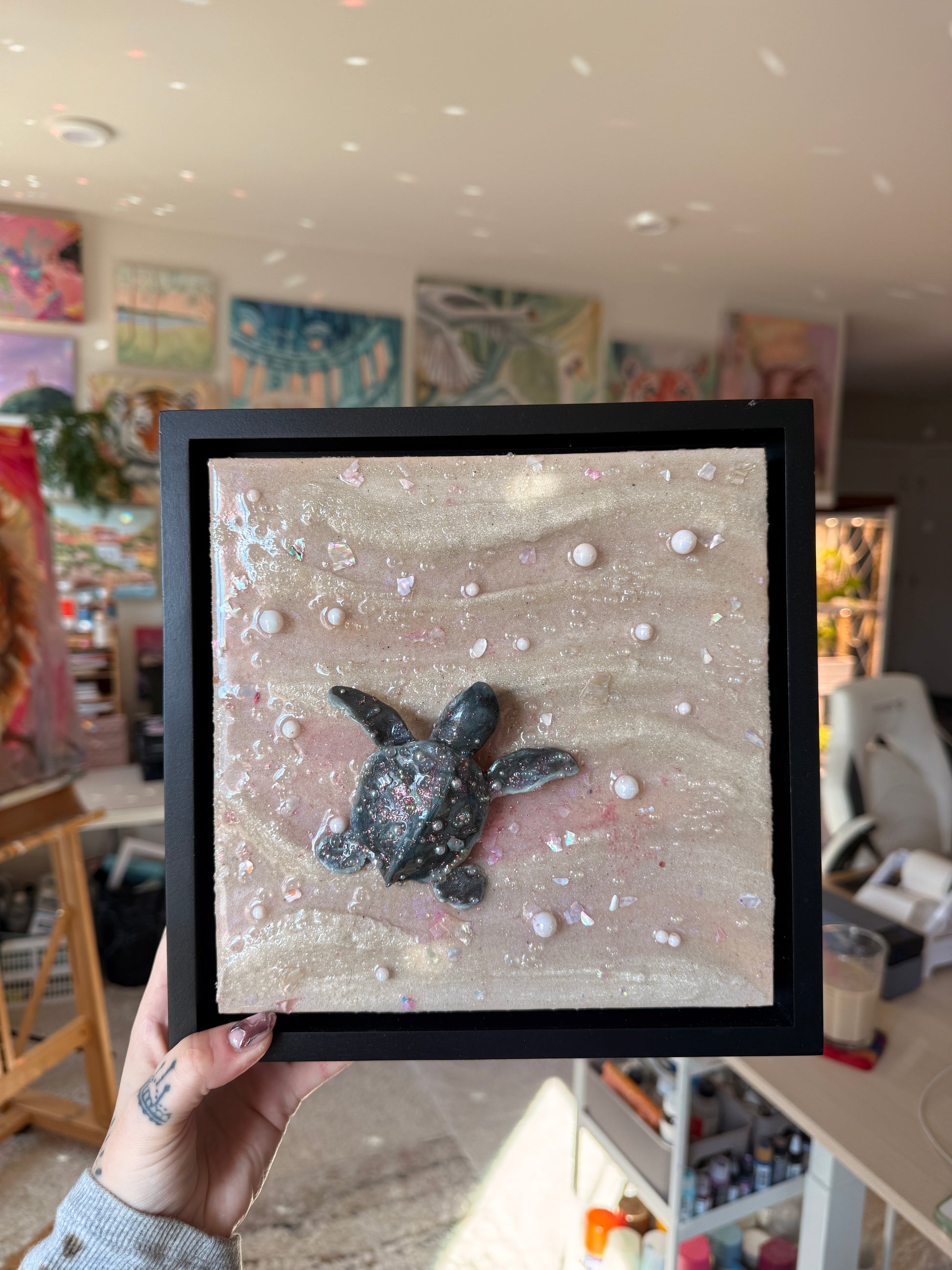 a baby sea turtle making its journey to the sea at sunset 🌊 sculpted all by hand this piece is made from real sand, clay, epoxy resin, and oil paint. Mounted on an 8 x 8 x 1.5 in. canvas and framed in a black 1.5 x 1.5 x 1⅞ floater frame!
