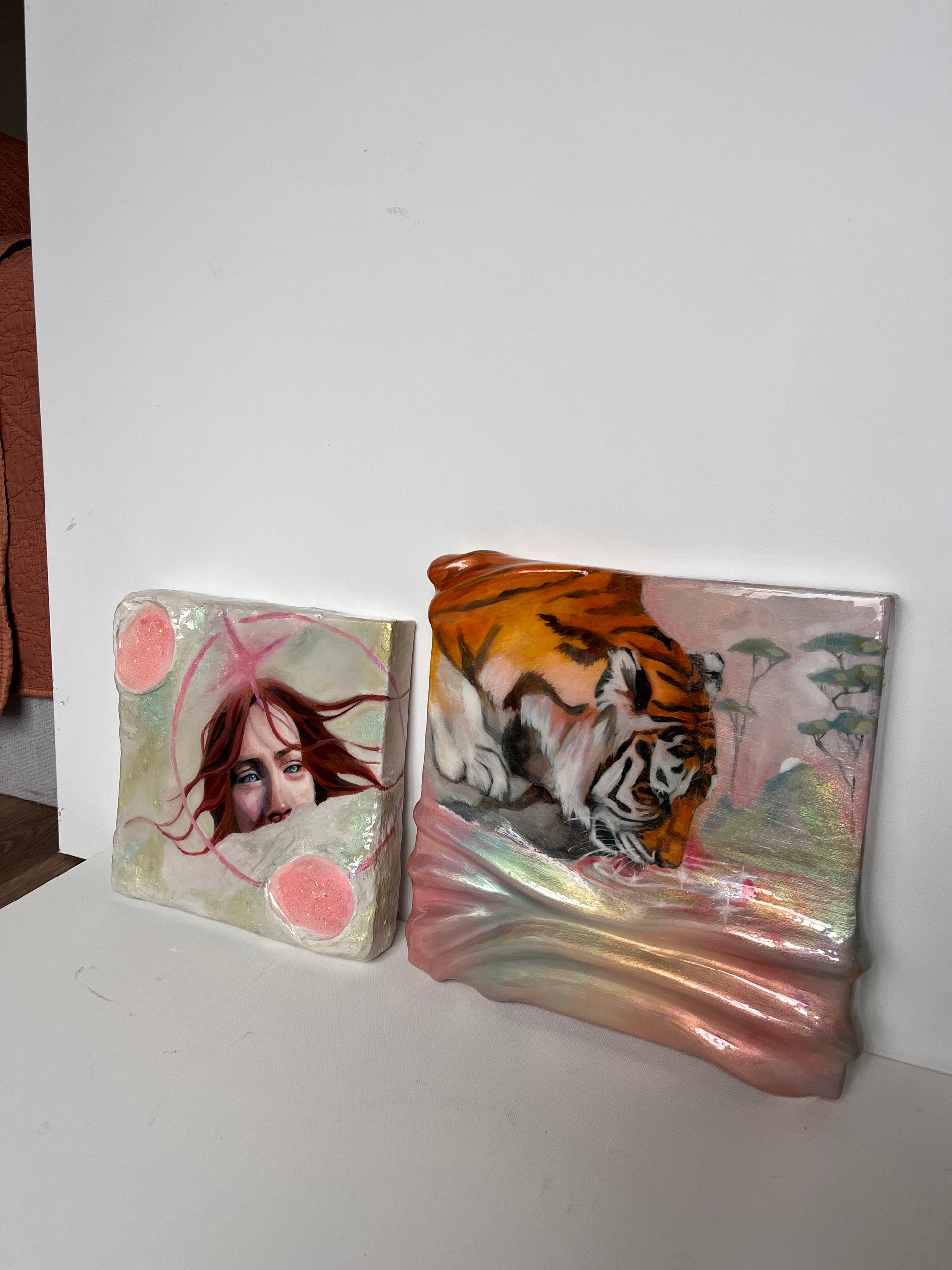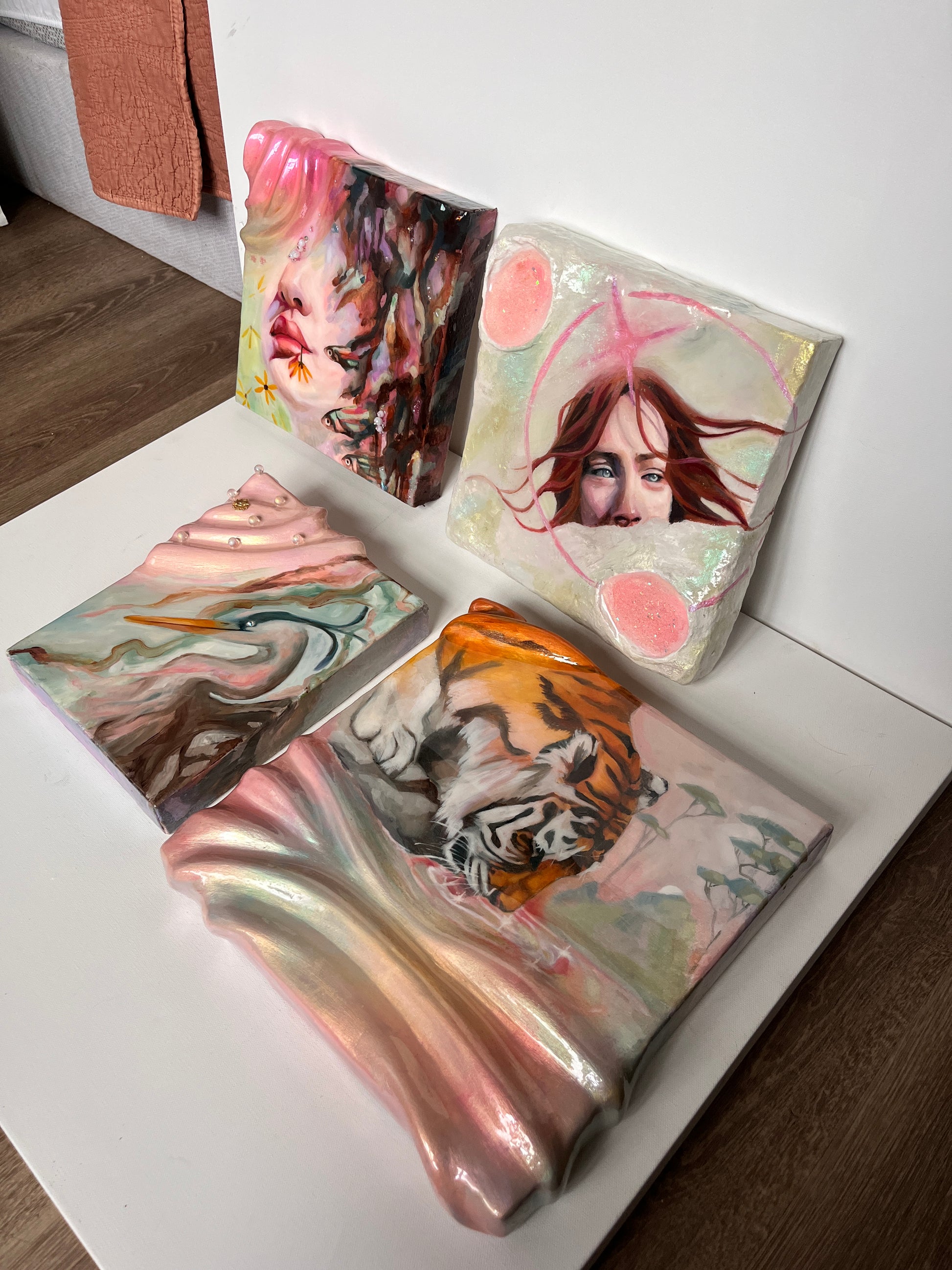 The process begins with sculpting plaster directly onto canvas, a time-intensive step that can take weeks to complete. Once the desired form is achieved, the sculpture is carefully sanded layer after layer. Then each pieces is painted with oil paints and mixed media, incorporating bright colors and iridescent elements to bring the piece to life. To protect the artwork and enhance its longevity, a final coat of UV-resistant resin is applied. This not only preserves the vibrant colors and iridescent qualities but also adds a glossy finish that further accentuates the artwork's dimensional aspects and adds an extra layer of protection