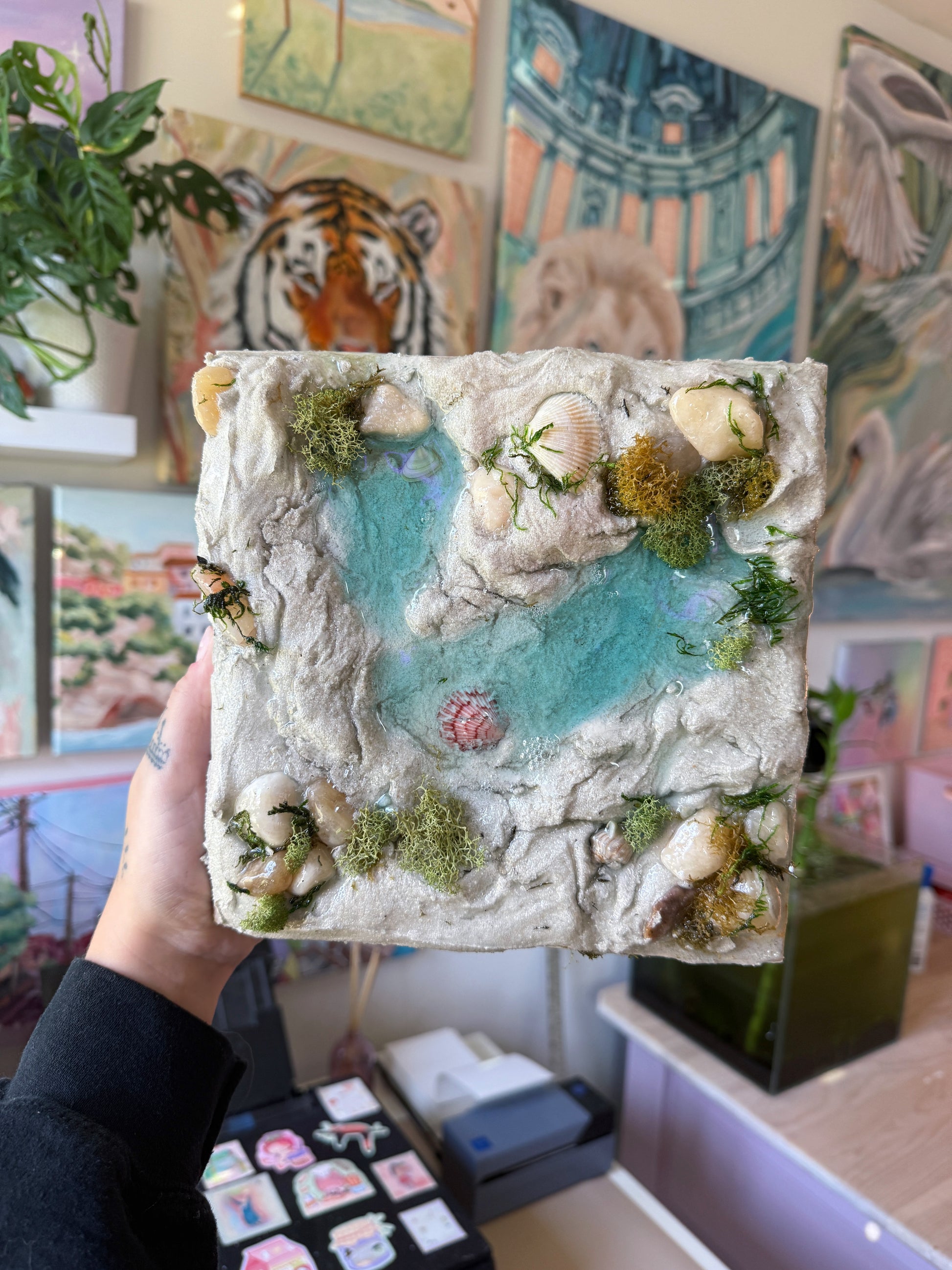 sculpted by hand with plaster, sand, and adorned with seashells, moss, and epoxy resin to replicate the ocean’s beauty! 🌊