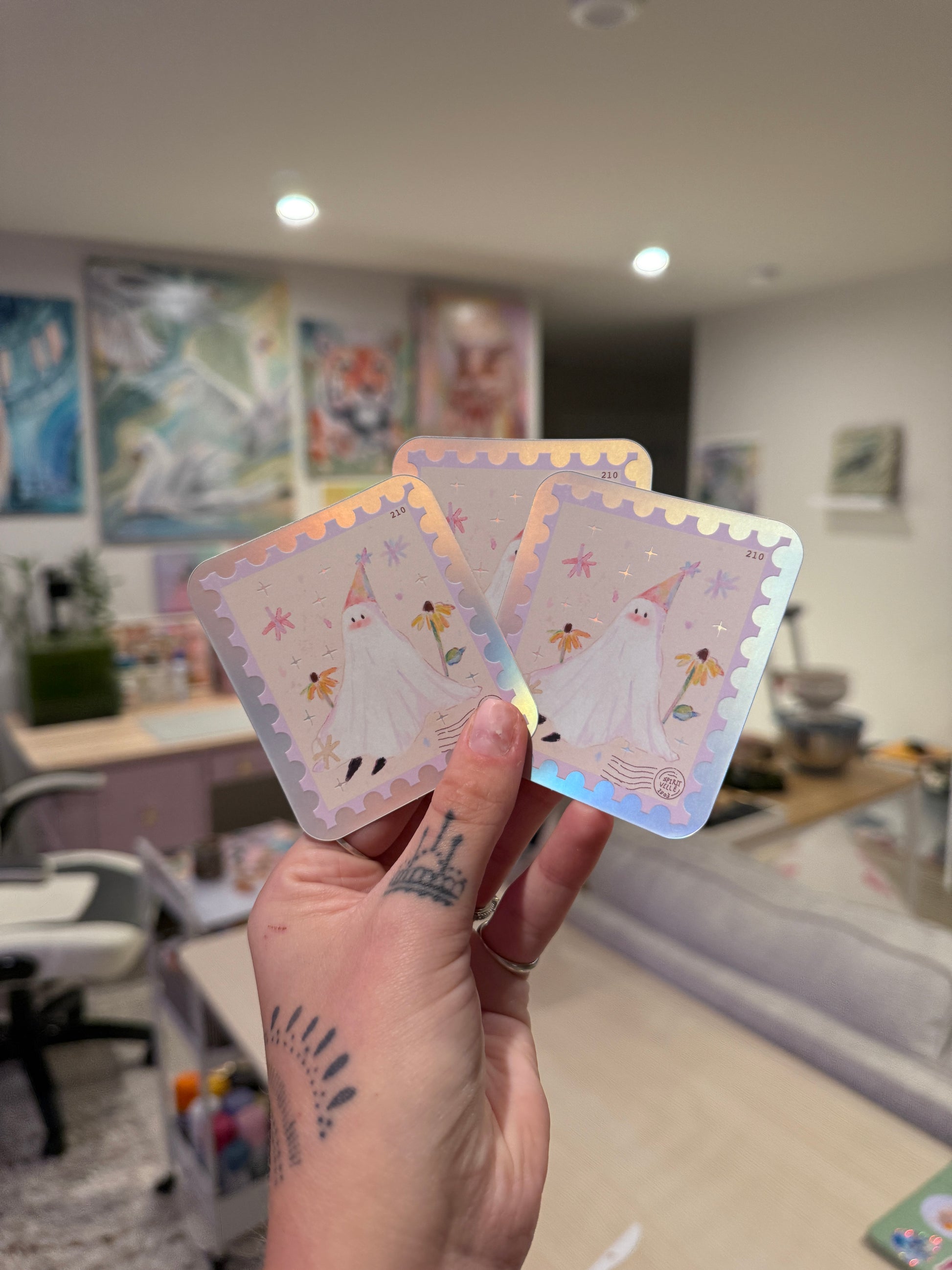 a cute holographic vinyl sticker of a ghostie postal stamp 💌