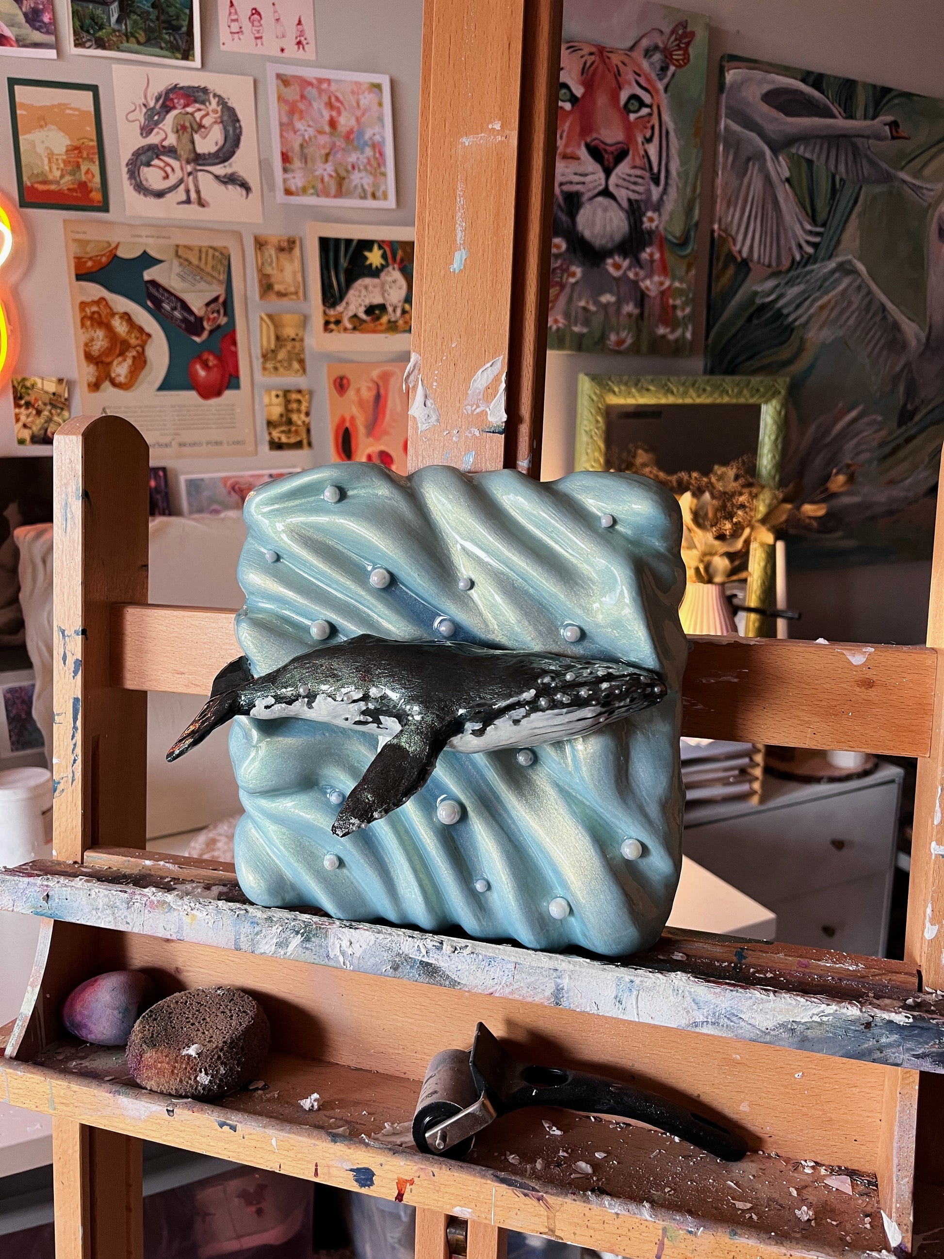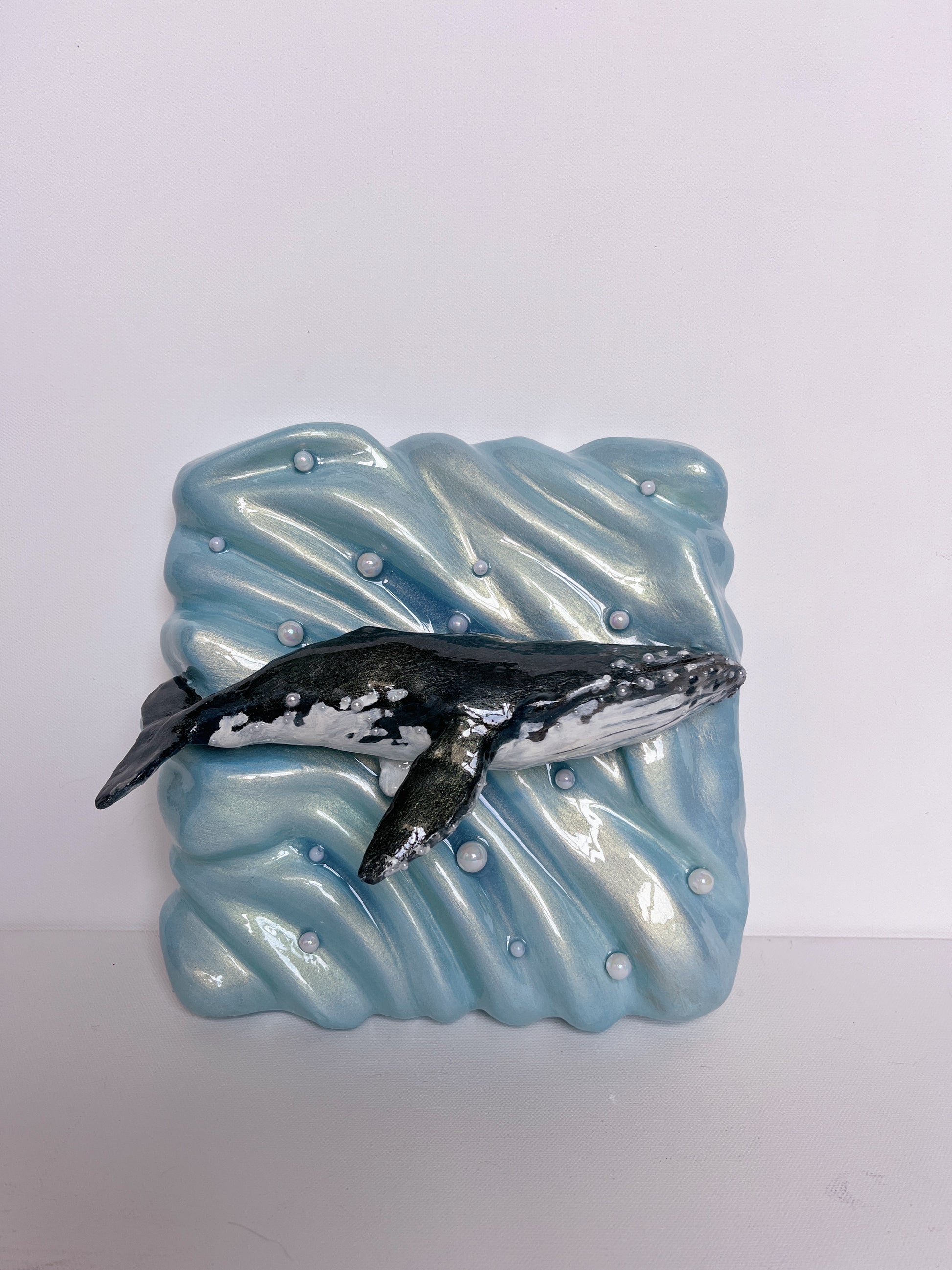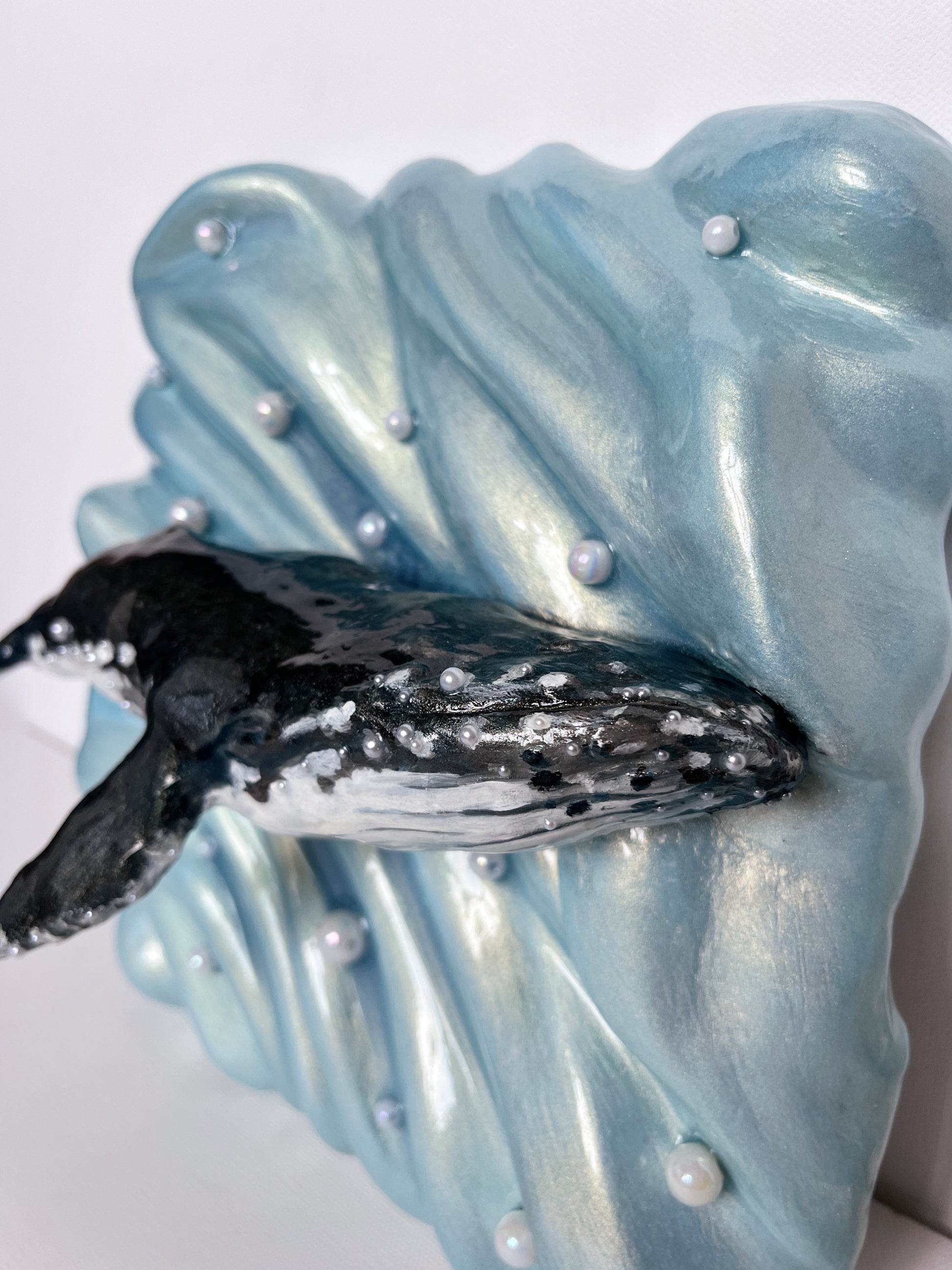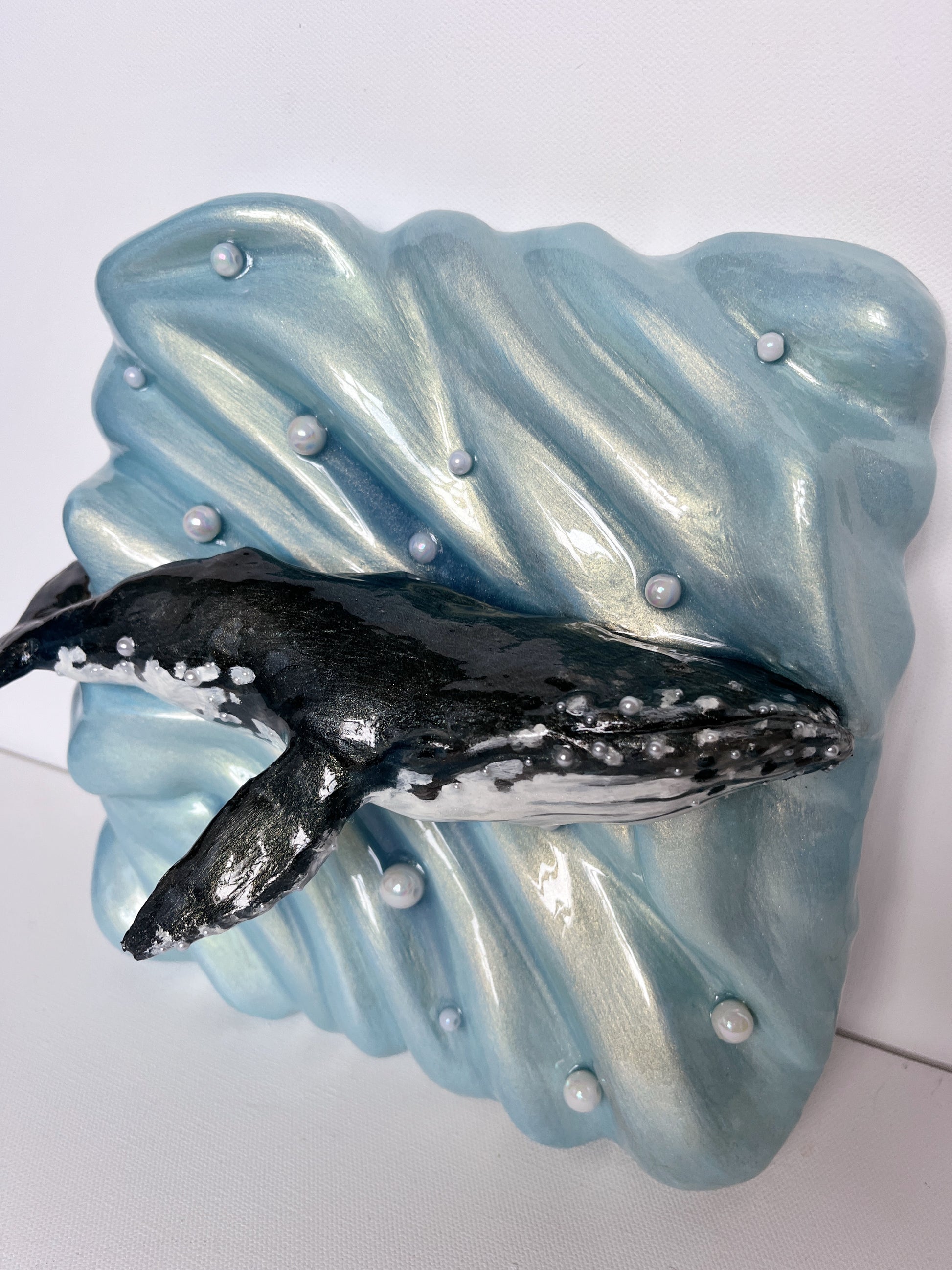 Completely hand sculpted out of plaster & drywall, and painted in an iridescent sea blue and gold shimmer ✨ The humpback whale is also completely handmade from epoxy and adorned with pearls, and then the whole piece is coated in a thick glossy layer of UV resistant resin! She will bring such a whimsical coastal feel to your home 🐋
