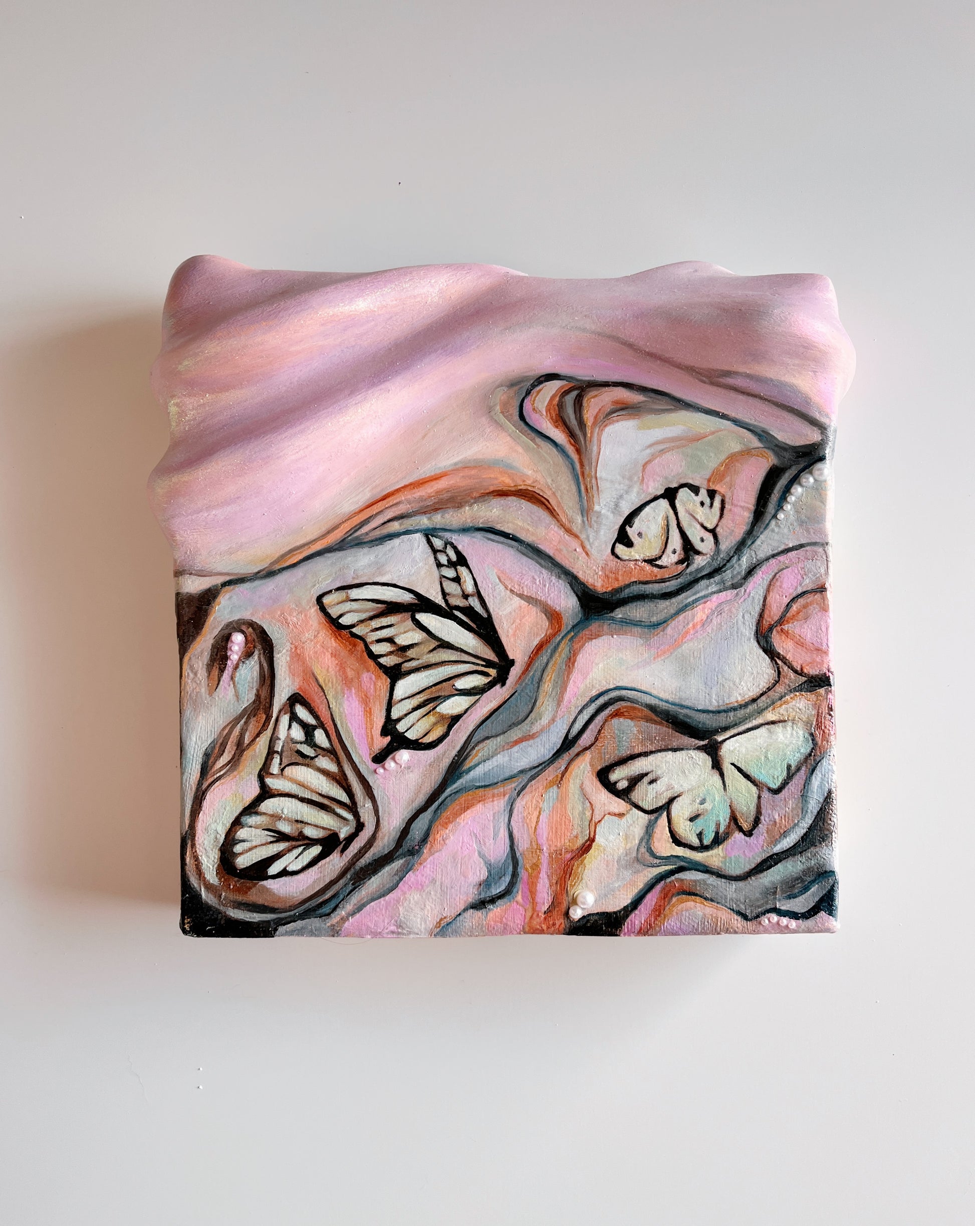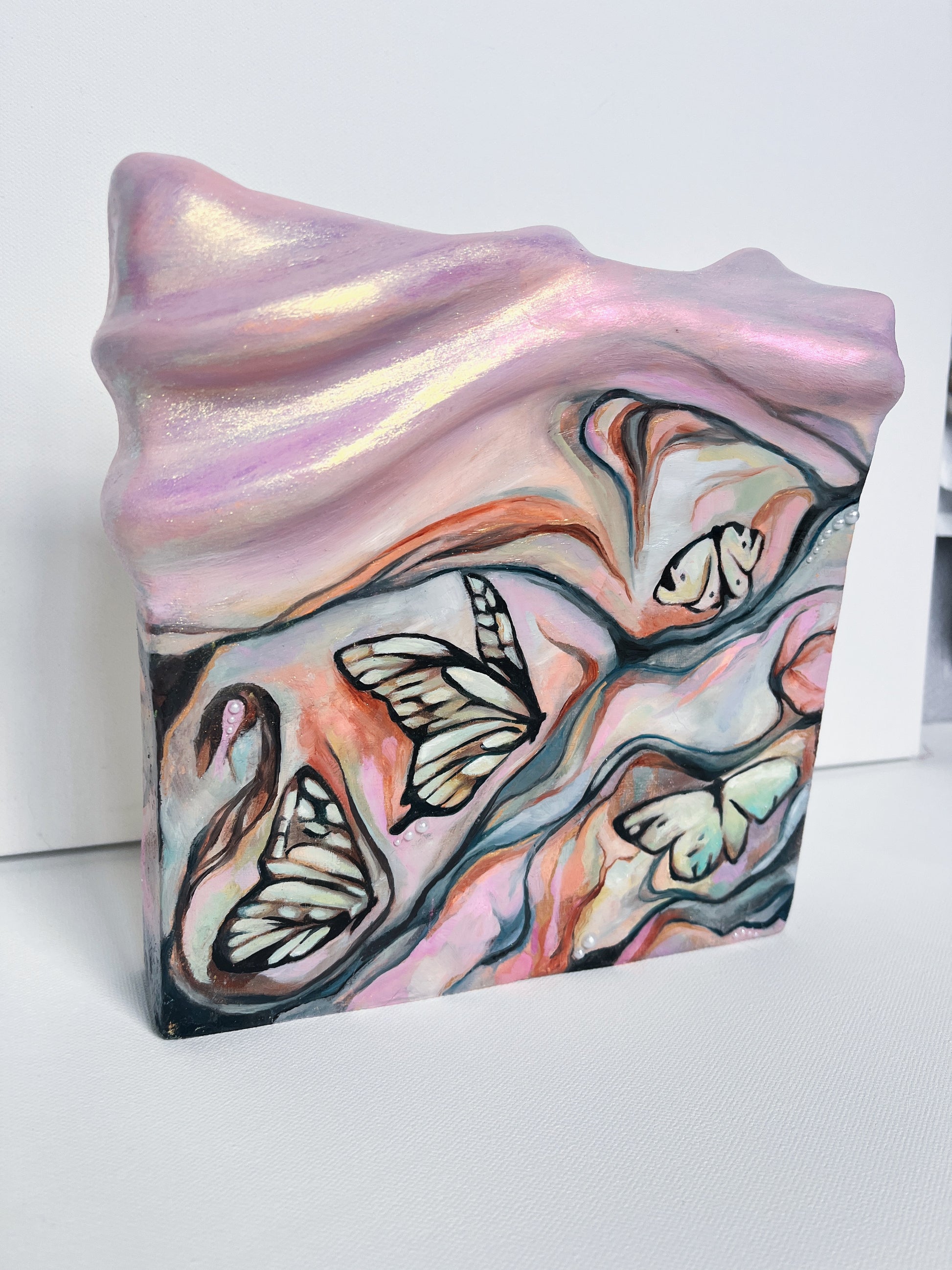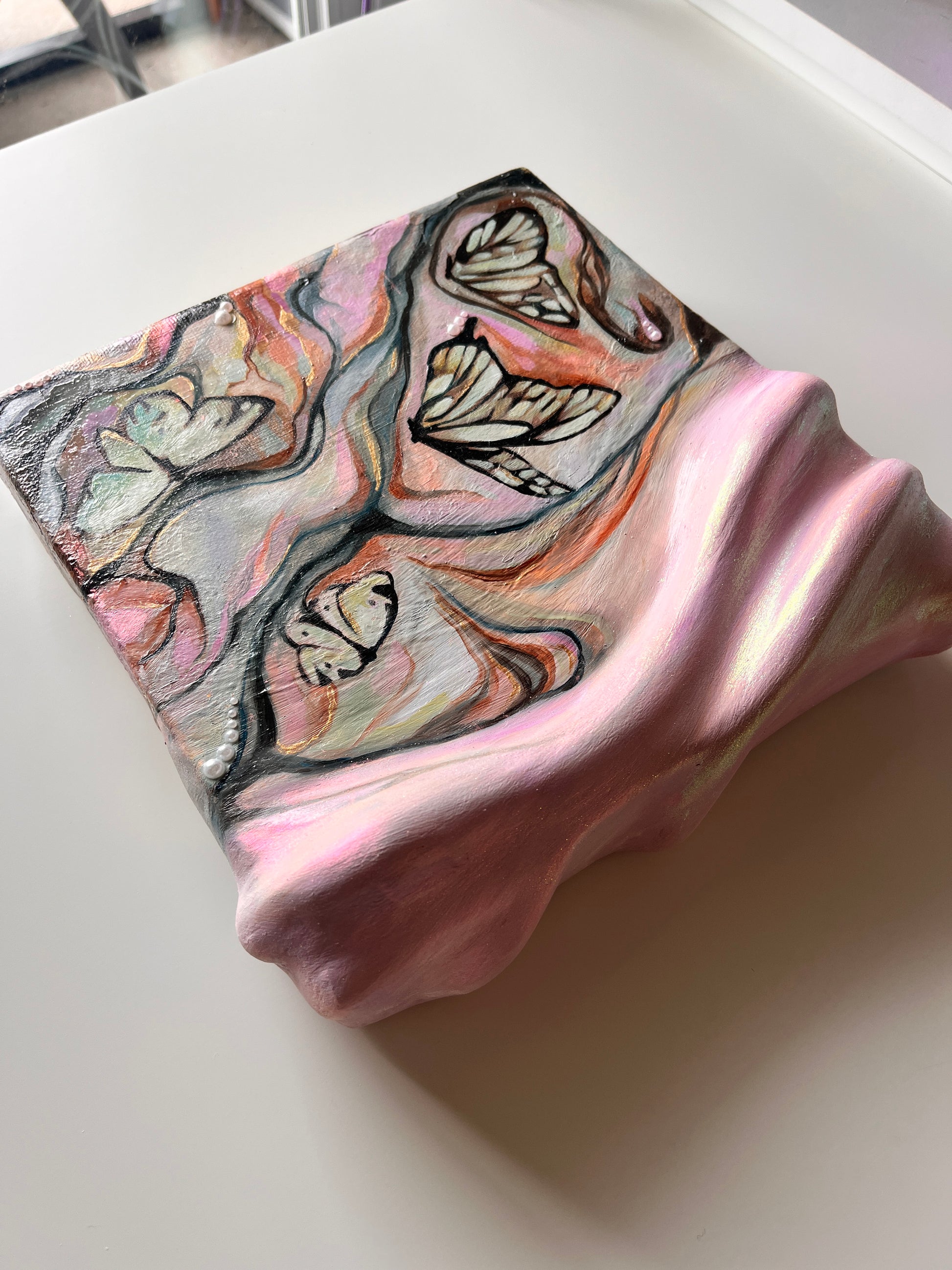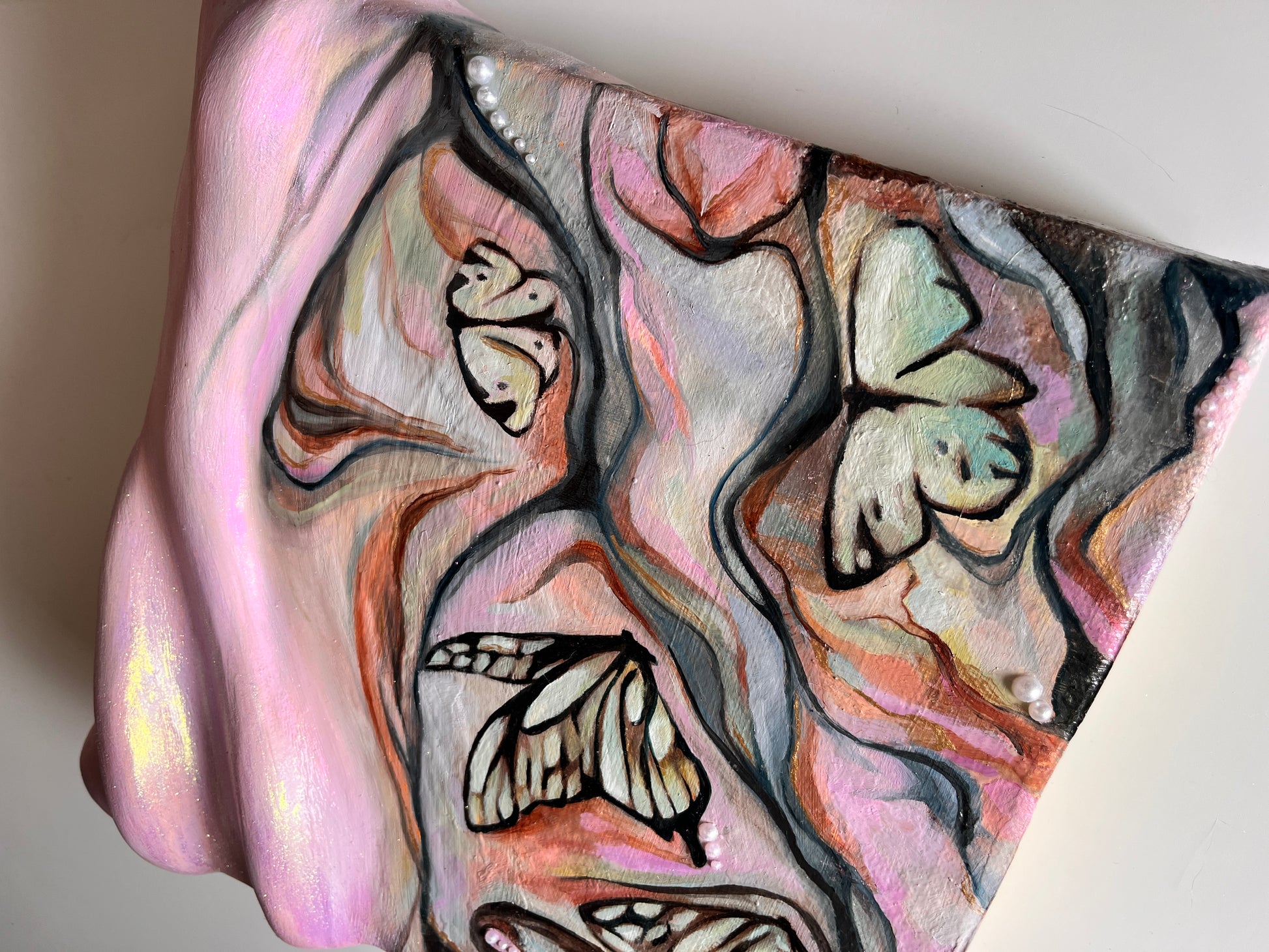The process begins with sculpting plaster directly onto canvas, a time-intensive step that can take weeks to complete. Once the desired form is achieved, the sculpture is carefully sanded layer after layer. Then each pieces is painted with oil paints and mixed media, incorporating bright colors and iridescent elements to bring the piece to life. To protect the artwork and enhance its longevity, a final coat of UV-resistant resin is applied. This not only preserves the vibrant colors and iridescent qualities but also adds a glossy finish that further accentuates the artwork's dimensional aspects and adds an extra layer of protection