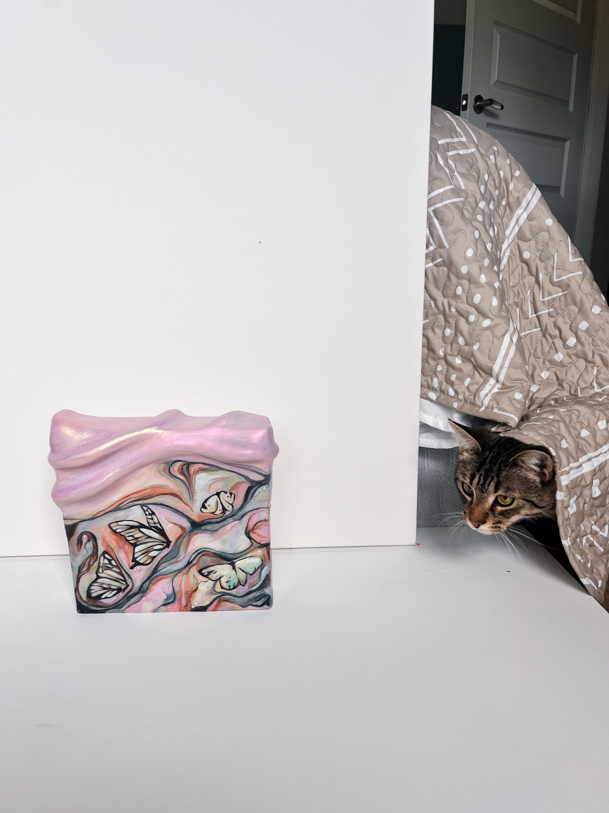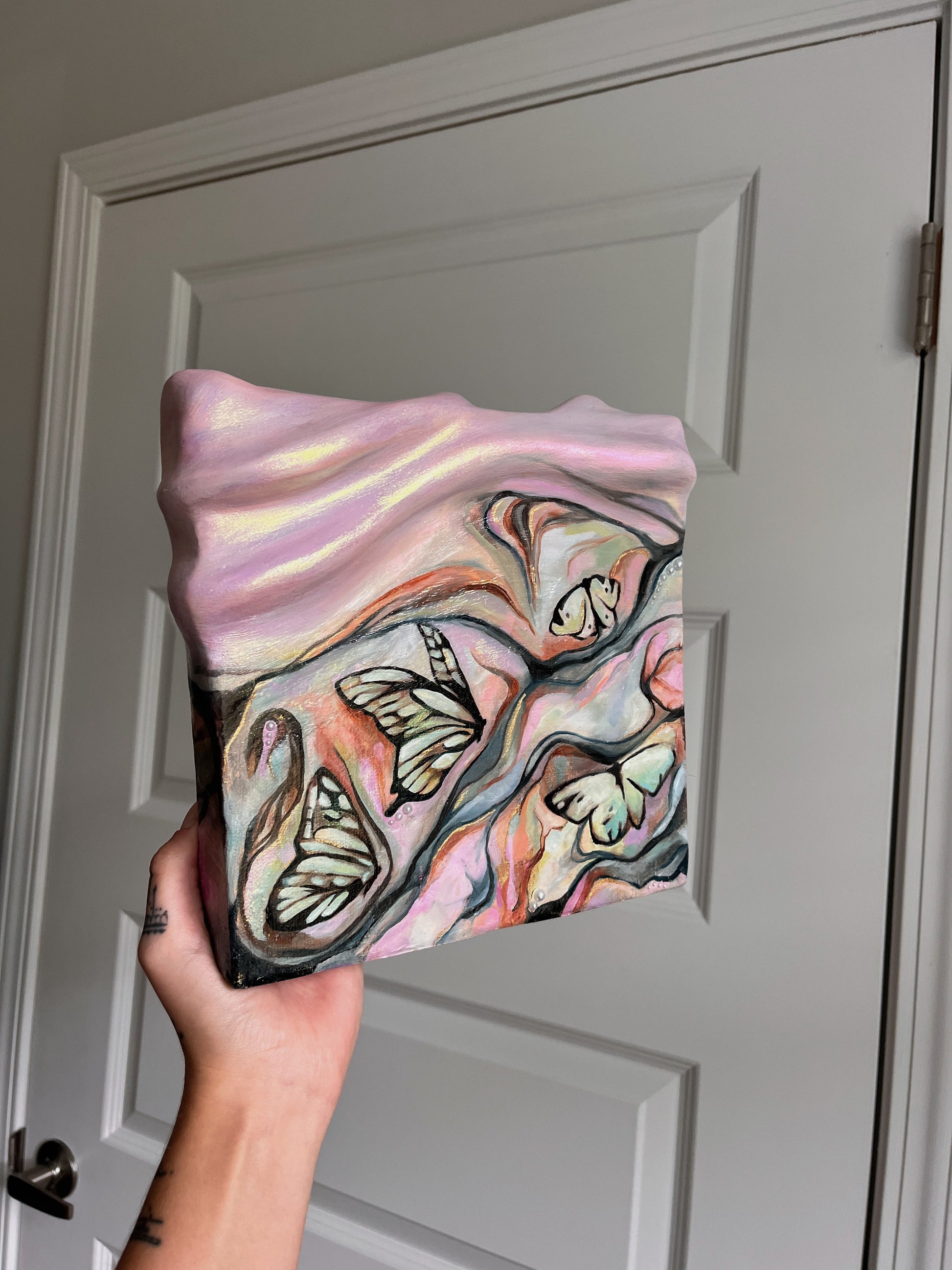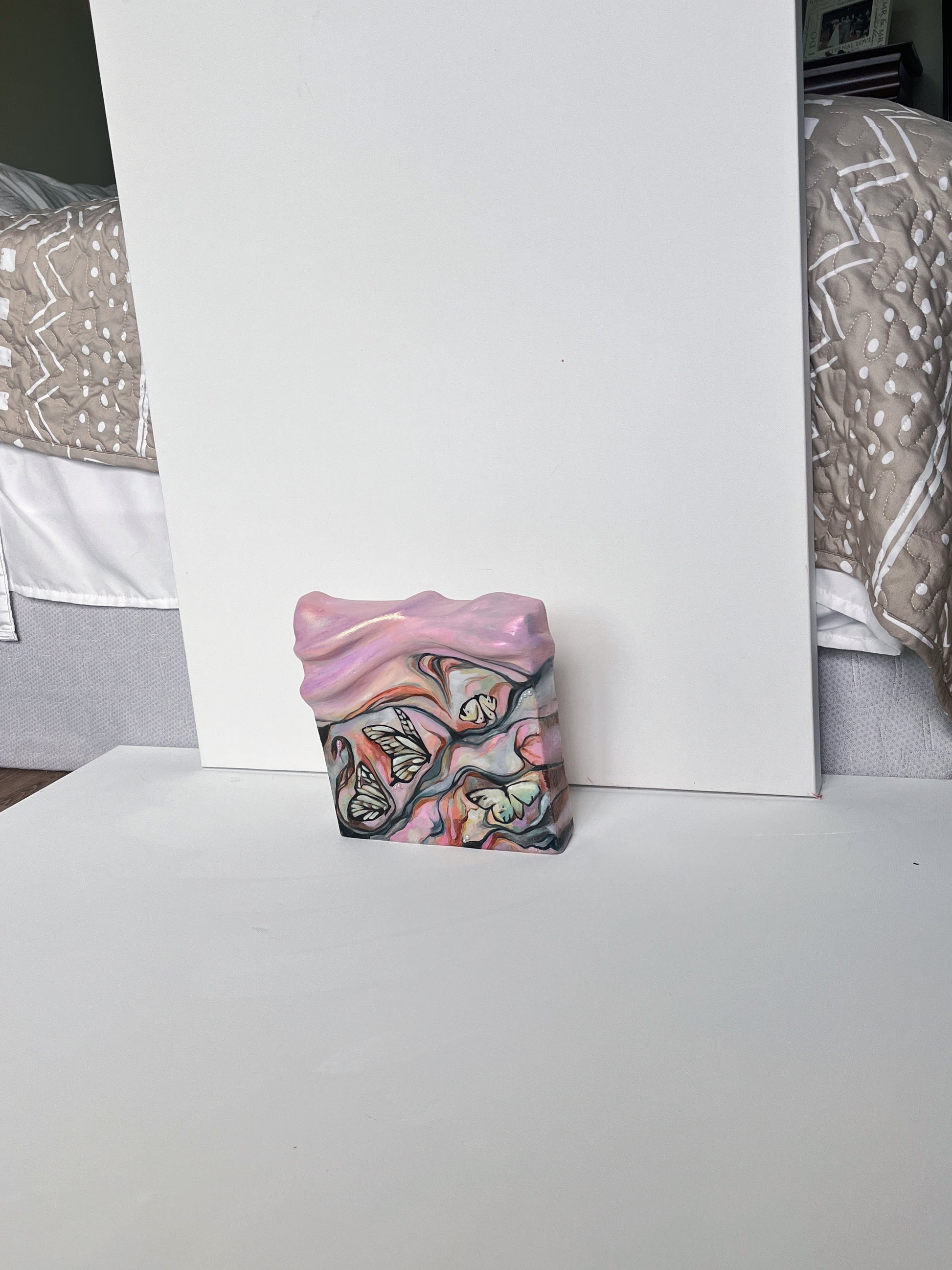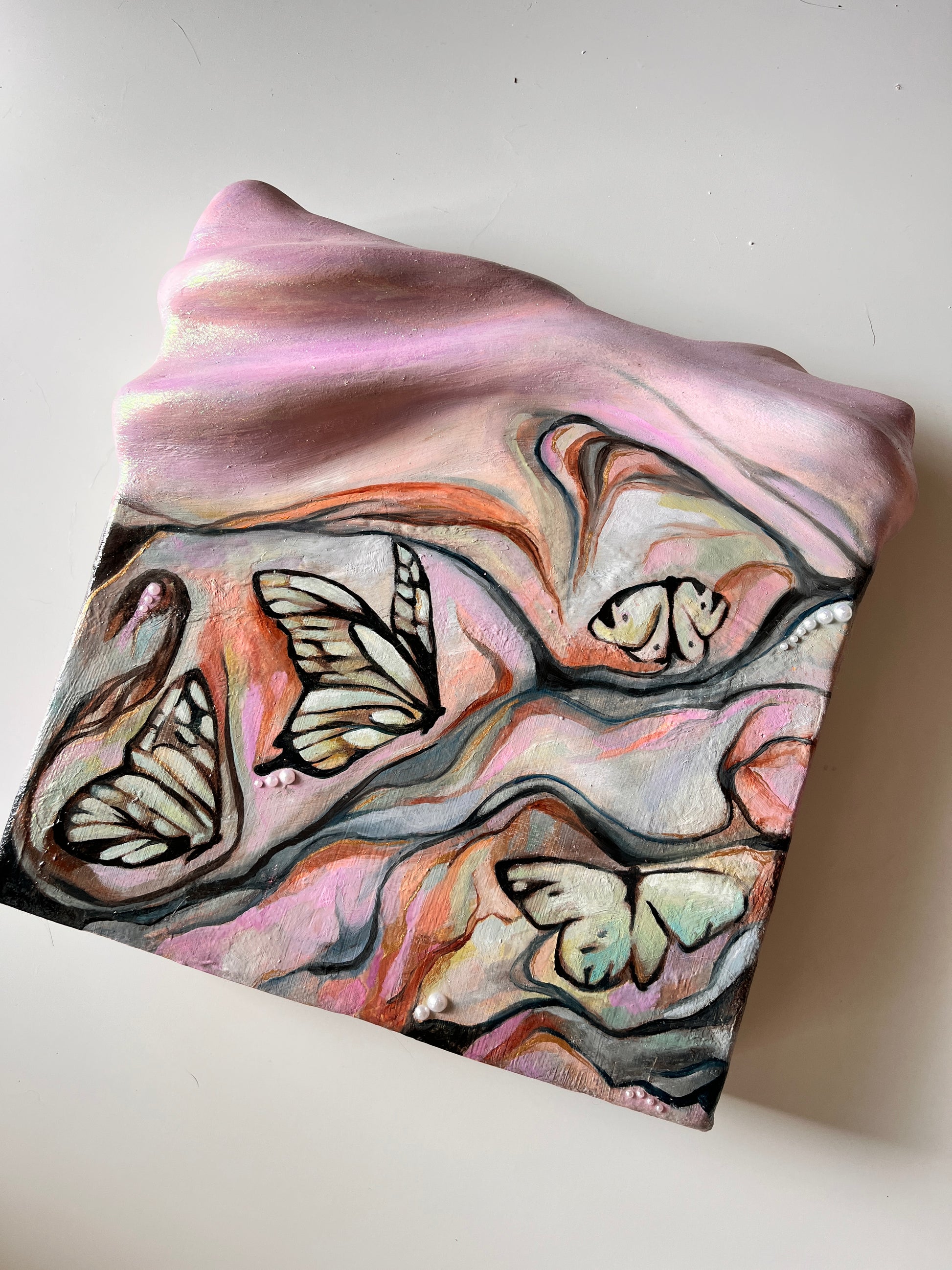 The process begins with sculpting plaster directly onto canvas, a time-intensive step that can take weeks to complete. Once the desired form is achieved, the sculpture is carefully sanded layer after layer. Then each pieces is painted with oil paints and mixed media, incorporating bright colors and iridescent elements to bring the piece to life. To protect the artwork and enhance its longevity, a final coat of UV-resistant resin is applied. This not only preserves the vibrant colors and iridescent qualities but also adds a glossy finish that further accentuates the artwork's dimensional aspects and adds an extra layer of protection