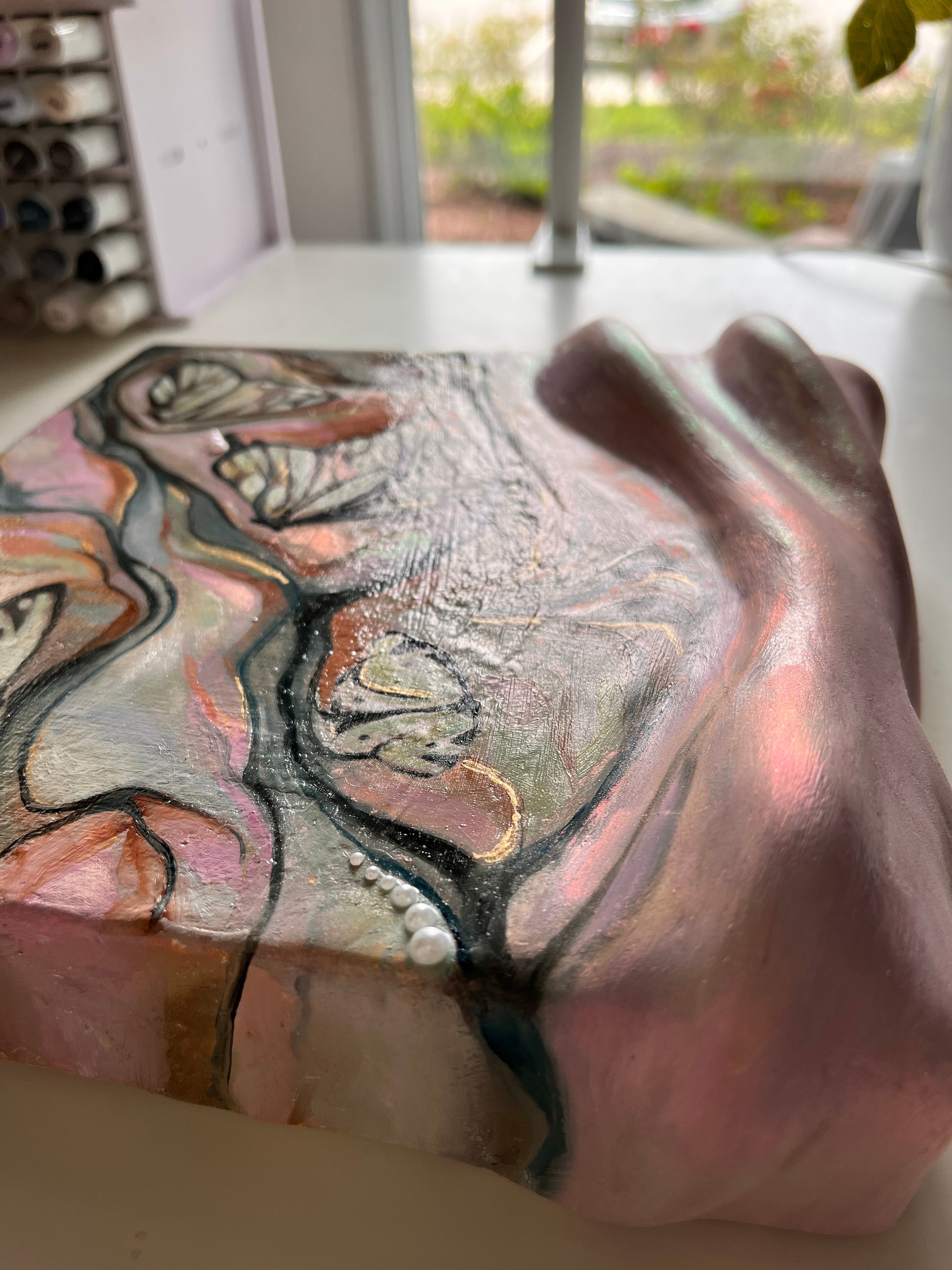 mixed media, oils, gold, pearls, rhinestones, glitter, plaster mix
